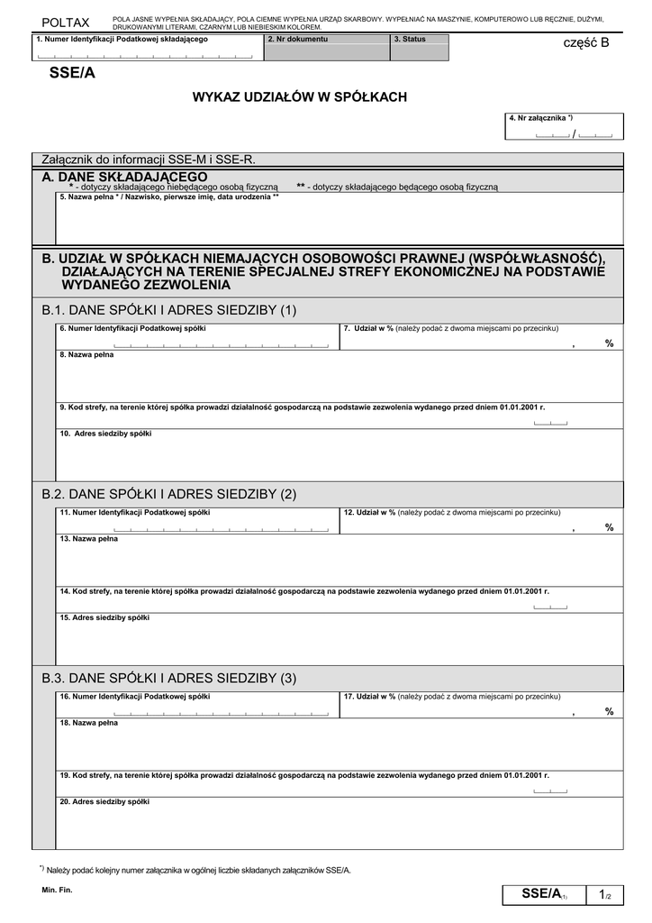 POLTAX POLA JASNE WYPEŁNIA SKŁADAJĄCY, POLA CIEMNE WYPEŁNIA URZĄD SKARBOWY. WYPEŁNIAĆ NA MASZYNIE, KOMPUTEROWO LUB RĘCZNIE, DUŻYMI, DRUKOWANYMI LITERAMI, CZARNYM LUB NIEBIESKIM KOLOREM. 1. Numer Identyfikacji Podatkowej składającego 2. Nr dokumentu część B 3. Status └────┴────┴────┴────┴────┴────┴────┴────┴────┴────┴────┴────┴────┘ SSE/A WYKAZ UDZIAŁÓW W SPÓŁKACH 4. Nr załącznika *) └────┴────┘ / └────┴────┘ Załącznik do informacji SSE-M i SSE-R. A. DANE SKŁADAJĄCEGO * - dotyczy składającego niebędącego osobą fizyczną 5. Nazwa pełna * / Nazwisko, pierwsze imię, data urodzenia ** ** - dotyczy składającego będącego osobą fizyczną B. UDZIAŁ W SPÓŁKACH NIEMAJĄCYCH OSOBOWOŚCI PRAWNEJ (WSPÓŁWŁASNOŚĆ), DZIAŁAJĄCYCH NA TERENIE SPECJALNEJ STREFY EKONOMICZNEJ NA PODSTAWIE WYDANEGO ZEZWOLENIA B.1. DANE SPÓŁKI I ADRES SIEDZIBY (1) 6. Numer Identyfikacji Podatkowej spółki 7. Udział w % (należy podać z dwoma miejscami po przecinku) └────┴────┴────┴────┴────┴────┴────┴────┴────┴────┴────┴────┴────┘ , % , % , % 8. Nazwa pełna 9. Kod strefy, na terenie której spółka prowadzi działalność gospodarczą na podstawie zezwolenia wydanego przed dniem 01.01.2001 r. └────┴────┘ 10. Adres siedziby spółki B.2. DANE SPÓŁKI I ADRES SIEDZIBY (2) 11. Numer Identyfikacji Podatkowej spółki 12. Udział w % (należy podać z dwoma miejscami po przecinku) └────┴────┴────┴────┴────┴────┴────┴────┴────┴────┴────┴────┴────┘ 13. Nazwa pełna 14. Kod strefy, na terenie której spółka prowadzi działalność gospodarczą na podstawie zezwolenia wydanego przed dniem 01.01.2001 r. └────┴────┘ 15. Adres siedziby spółki B.3. DANE SPÓŁKI I ADRES SIEDZIBY (3) 16. Numer Identyfikacji Podatkowej spółki 17. Udział w % (należy podać z dwoma miejscami po przecinku) └────┴────┴────┴────┴────┴────┴────┴────┴────┴────┴────┴────┴────┘ 18. Nazwa pełna 19. Kod strefy, na terenie której spółka prowadzi działalność gospodarczą na podstawie zezwolenia wydanego przed dniem 01.01.2001 r. └────┴────┘ 20. Adres siedziby spółki *) Należy podać kolejny numer załącznika w ogólnej liczbie składanych załączników SSE/A. Min. Fin. SSE/A 1 ( ) 1/2 POLTAX POLA JASNE WYPEŁNIA SKŁADAJĄCY, POLA CIEMNE WYPEŁNIA URZĄD SKARBOWY. WYPEŁNIAĆ NA MASZYNIE, KOMPUTEROWO LUB RĘCZNIE, DUŻYMI, DRUKOWANYMI LITERAMI, CZARNYM LUB NIEBIESKIM KOLOREM. B.4. DANE SPÓŁKI I ADRES SIEDZIBY (4) 21. Numer Identyfikacji Podatkowej spółki 23. Nazwa pełna 22. Udział w % (należy podać z dwoma miejscami po przecinku) └────┴────┴────┴────┴────┴────┴────┴────┴────┴────┴────┴────┴────┘ , % , % , % , % 24. Kod strefy, na terenie której spółka prowadzi działalność gospodarczą na podstawie zezwolenia wydanego przed dniem 01.01.2001 r. └────┴────┘ 25. Adres siedziby spółki B.5. DANE SPÓŁKI I ADRES SIEDZIBY (5) 26. Numer Identyfikacji Podatkowej spółki 28. Nazwa pełna 27. Udział w % (należy podać z dwoma miejscami po przecinku) └────┴────┴────┴────┴────┴────┴────┴────┴────┴────┴────┴────┴────┘ 29. Kod strefy, na terenie której spółka prowadzi działalność gospodarczą na podstawie zezwolenia wydanego przed dniem 01.01.2001 r. └────┴────┘ 30. Adres siedziby spółki B.6. DANE SPÓŁKI I ADRES SIEDZIBY (6) 31. Numer Identyfikacji Podatkowej spółki 33. Nazwa pełna 32. Udział w % (należy podać z dwoma miejscami po przecinku) └────┴────┴────┴────┴────┴────┴────┴────┴────┴────┴────┴────┴────┘ 34. Kod strefy, na terenie której spółka prowadzi działalność gospodarczą na podstawie zezwolenia wydanego przed dniem 01.01.2001 r. └────┴────┘ 35. Adres siedziby spółki B.7. DANE SPÓŁKI I ADRES SIEDZIBY (7) 36. Numer Identyfikacji Podatkowej spółki 38. Nazwa pełna 37. Udział w % (należy podać z dwoma miejscami po przecinku) └────┴────┴────┴────┴────┴────┴────┴────┴────┴────┴────┴────┴────┘ 39. Kod strefy, na terenie której spółka prowadzi działalność gospodarczą na podstawie zezwolenia wydanego przed dniem 01.01.2001 r. └────┴────┘ 40. Adres siedziby spółki SSE/A 1 ( ) 2/2