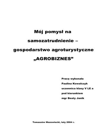 Mój pomysł na samozatrudnienie – gospodarstwo agroturystyczne „AGROBIZNES” Pracę wykonała Paulina Kowalczyk uczennica klasy V LE a pod kierunkiem mgr Beaty Janik Tomaszów Mazowiecki, luty 2004 r. Podziękowania Pani mgr Beacie Janik Za cenną pomoc i udzielone wskazówki Składa autorka: Paulina Kowalczyk. SPIS TREŚCI: ROZDZIAŁ I Mój pomysł na działalność gospodarczą ................................................................ str. 2 ROZDZIAŁ II Samoocena – prezentacja słabych i mocnych stron mojej osobowości .................. str.3 ROZDZIAŁ III Analiza mikro i makroekonomicznych uwarunkowań realizacji mojego pomysłu ... str. 5 ROZDZIAŁ IV Biznes plan planowanego przedsięwzięcia ............................................................ str. 9 ROZDZIAŁ V Harmonogram realizacji przedsięwzięcia ............................................................. str. 16 BIBLIOGRAFIA ......................................................................................... str. 17 ZAŁĄCZNIKI Będąc tegorocznym absolwentem szkoły średniej i wiedząc, że nie mam możliwości dalszej nauki na studiach dziennych muszę podjąć decyzję co chciałabym dalej robić. Oczywiście jedynymi możliwościami są: zdobycie pracy lub stworzenie nowego miejsca pracy czyli tzw. samozatrudnienie. Perspektywa bycia podległym jakiemuś przełożonemu, praca w czterech ścianach od 7 do 15 godziny nie jest tym co by mnie satysfakcjonowało. Uznałam, że zdobycie ciekawej pracy jest bardzo trudne w warunkach panujących obecnie na rynku pracy (20% stopa bezrobocia w kraju, która na terenie gdzie mieszkam wynosi jeszcze więcej24,1%) ,a perspektywa założenia własnej działalności bardzo mi się spodobała Po głębokich przemyśleniach i wielu rozmowach z rodziną i znajomymi uznałam, że najlepszym z przeróżnych pomysłów, na własny biznes jest gospodarstwo agroturystyczne. W moich marzeniach nieraz przewijała się wizja życia wiejskiego. Biorąc pod uwagę to, że posiadam działkę w okolicach Tomaszowa Mazowieckiego, który jest miastem o wielu walorach turystycznych. oraz po przeanalizowaniu posiadanych kwalifikacji i cech osobowych uznałam, że jest to pomysł godny uwagi. Moje rozważania koncentrowały się również na tym, jaki charakter będzie miała moja działalność. Miałam dwa pomysły: pierwszy, w którym moimi głównymi klientami byłaby młodzież oraz „przeciętne” rodziny. Nastawienie na takich klientów nie wymagałoby wysokich standardów, które podnoszą cenę. Drugi pomysł opierał się na wysokiej jakości świadczonych usług, które kierowane byłyby do ludzi o dużych wymaganiach przeważnie z kręgu biznesu, handlu itp. Nie mogłam połączyć tych koncepcji, bo hałaśliwa młodzież niewątpliwie odstraszyłaby drugi segment klientów. Dlatego też zdecydowałam, że moje usługi skieruję do bardziej wymagających klientów. O decyzji tej zaważyły moje preferencje a także to, że mało jest gospodarstw agroturystycznych oferujących swoje usługi tylko dla tego segmentu rynkowego. Na osobowość człowieka składa się wiele elementów: temperament, inteligencja, cechy charakteru. W książce pt. „Psychologia decyzji kadrowych” jej autor Czesław S. Nosal wyróżnia tzw. „WIELKĄ PIĄTKĘ” – czyli pięć podstawowych wymiarów osobowości: 1. ekstrawersja-introwersja Ekstrawersja to wyższy poziom energii, pozytywne emocje do świata, optymizm; Introwersja charakteryzuje pesymistów i związane są z nią negatywne emocje 2. ugodowość-nieustępliwość Ugodowość to pozytywne nastawienie do świata; nieustępliwość cechuje osobę samolubną, towarzyszy jej brak współpracy i oschłość 3. sumienność-chaotyczność Stwierdzono, że sumienność sprzyja dobrym wynikom w każdym zawodzie, przyczynia się do sukcesu, co jest zrozumiałe gdyż chaos nie ma w tym wypadku żadnych pozytywnych stron. 4. emocjonalna stabilność -labilność Autor podkreśla znaczenie stabilności emocjonalnej. 5. otwartość-zamkniętość na doświadczenie Czyli otwarty/zamknięty typ umysłu. Ten drugi charakteryzuje przede wszystkim dogmatyczność; otwartość natomiast cechuje osobę o szerokich horyzontach, przyjmowanie nawet rozwiązań nieprawdopodobnych i zaskakujących. Następnie autor udowadnia, że poszczególne wymiary osobowości sprzyjają wykonywaniu różnych zawodów. Podejmując własną działalność bardzo ważnym elementem, od którego właściwie powinno rozpocząć się rozmyślania nad rodzajem podejmowanej działalności gospodarczej jest poznanie swych cech osobowości a także kwalifikacji zawodowych i posiadanych umiejętności potrzebnych i sprzyjających założeniu własnego przedsiębiorstwa. W tym roku ukończę Liceum Ekonomiczne. Zdobyte w szkole średniej umiejętności i kwalifikacje niewątpliwie bardzo ułatwią mi prowadzenie własnej działalności gospodarczej. Wiem bowiem jakie działania należy podjąć aby założyć własne przedsiębiorstwo, znam podstawowe strategie produktu, ceny, dystrybucji i promocji dzięki lekcjom marketingu, nie są mi obce zagadnienia z prawa pracy i prawa cywilnego. Moje umiejętności w tym zakresie potwierdziły się w VIII Turnieju Umiejętności Handlowo - Menadżerskich, których zostałam finalistką. Brałam udział w kursie zorganizowanym przez Tomaszowski Inkubator Przedsiębiorczości dzięki, któremu uczestnicy mogli poznać zasady funkcjonowania gospodarstw agroturystycznych w okolicach Tomaszowa Mazowieckiego. Jestem osobą otwartą, żywiołową, wesołą, towarzyską co zapewne jest bardzo ważne w prowadzeniu działalności agroturystycznej, w której moja praca będzie polegała na częstym kontakcie z moimi gośćmi-klientami, zapewnieniu im jak najlepszego komfortu psychicznego, aby to właśnie w moim gospodarstwie czuli się jak najlepiej. Dobra organizacja to wielki plus w tej pracy biorąc pod uwagę że jednym z moich z