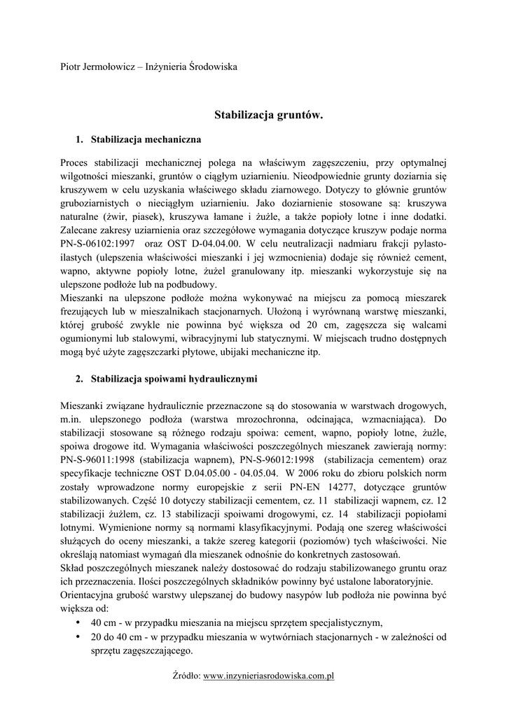 Piotr Jermołowicz – Inżynieria Środowiska Stabilizacja gruntów. 1. Stabilizacja mechaniczna Proces stabilizacji mechanicznej polega na właściwym zagęszczeniu, przy optymalnej wilgotności mieszanki, gruntów o ciągłym uziarnieniu. Nieodpowiednie grunty doziarnia się kruszywem w celu uzyskania właściwego składu ziarnowego. Dotyczy to głównie gruntów gruboziarnistych o nieciągłym uziarnieniu. Jako doziarnienie stosowane są: kruszywa naturalne (żwir, piasek), kruszywa łamane i żużle, a także popioły lotne i inne dodatki. Zalecane zakresy uziarnienia oraz szczegółowe wymagania dotyczące kruszyw podaje norma PN-S-06102:1997 oraz OST D-04.04.00. W celu neutralizacji nadmiaru frakcji pylastoilastych (ulepszenia właściwości mieszanki i jej wzmocnienia) dodaje się również cement, wapno, aktywne popioły lotne, żużel granulowany itp. mieszanki wykorzystuje się na ulepszone podłoże lub na podbudowy. Mieszanki na ulepszone podłoże można wykonywać na miejscu za pomocą mieszarek frezujących lub w mieszalnikach stacjonarnych. Ułożoną i wyrównaną warstwę mieszanki, której grubość zwykle nie powinna być większa od 20 cm, zagęszcza się walcami ogumionymi lub stalowymi, wibracyjnymi lub statycznymi. W miejscach trudno dostępnych mogą być użyte zagęszczarki płytowe, ubijaki mechaniczne itp. 2. Stabilizacja spoiwami hydraulicznymi Mieszanki związane hydraulicznie przeznaczone są do stosowania w warstwach drogowych, m.in. ulepszonego podłoża (warstwa mrozochronna, odcinająca, wzmacniająca). Do stabilizacji stosowane są różnego rodzaju spoiwa: cement, wapno, popioły lotne, żużle, spoiwa drogowe itd. Wymagania właściwości poszczególnych mieszanek zawierają normy: PN-S-96011:1998 (stabilizacja wapnem), PN-S-96012:1998 (stabilizacja cementem) oraz specyfikacje techniczne OST D.04.05.00 - 04.05.04. W 2006 roku do zbioru polskich norm zostały wprowadzone normy europejskie z serii PN-EN 14277, dotyczące gruntów stabilizowanych. Część 10 dotyczy stabilizacji cementem, cz. 11 stabilizacji wapnem, cz. 12 stabilizacji żużlem, cz. 13 stabilizacji spoiwami drogowymi, cz. 14 stabilizacji popiołami lotnymi. Wymienione normy są normami klasyfikacyjnymi. Podają one szereg właściwości służących do oceny mieszanki, a także szereg kategorii (poziomów) tych właściwości. Nie określają natomiast wymagań dla mieszanek odnośnie do konkretnych zastosowań. Skład poszczególnych mieszanek należy dostosować do rodzaju stabilizowanego gruntu oraz ich przeznaczenia. Ilości poszczególnych składników powinny być ustalone laboratoryjnie. Orientacyjna grubość warstwy ulepszanej do budowy nasypów lub podłoża nie powinna być większa od: • 40 cm - w przypadku mieszania na miejscu sprzętem specjalistycznym, • 20 do 40 cm - w przypadku mieszania w wytwórniach stacjonarnych - w zależności od sprzętu zagęszczającego. Źródło: www.inzynieriasrodowiska.com.pl W przypadku większej grubości mieszankę układa się i zagęszcza w dwóch warstwach. Poniżej opisano wybrane metody stabilizacji gruntów spoiwami hydraulicznymi. 2.1. Stabilizacja cementem Jest metodą wzmacniana gruntów niespoistych, mało i średnio spoistych oraz kruszyw w celu poprawy nośności i zmniejszenia wrażliwości na wpływy atmosferyczne. Mieszanki wykorzystuje się m.in. na warstwy ulepszonego podłoża. Najlepsze wyniki stabilizacji cementem uzyskuje się przy gruntach o wskaźniku piaskowym 20 ≤ WP ≤ 50 oraz zawartości frakcji <0,075 mm do 15%, a także zawartości ziaren > 2 mm co najmniej 30%. W celu sprawdzenia przydatności gruntu do stabilizacji cementem wykonuje się badania wytrzymałości na ściskanie i mrozoodporności próbek gruntu stabilizowanego. Grunty o wskaźniku pH poza przedziałem od 5 do 8 oraz zawierające więcej niż 5 % (m/m) części organicznych i więcej niż 1 % (m/m) siarczanów (w przeliczeniu na S03) mogą być stabilizowane cementem po ulepszeniu chlorkiem wapniowym, wapnem lub popiołami lotnymi. Stabilizacji nie należy wykonywać, gdy podłoże jest zamarznięte, przy temperaturze poniżej 5°C oraz podczas opadów deszczu. Proces technologiczny stabilizacji cementem polega na zmieszaniu rozdrobnionego gruntu z optymalną ilością cementu i wody, a w razie potrzeby dodatków ulepszających, oraz na zagęszczeniu wytworzonej mieszanki. Wilgotność przed zagęszczeniem powinna być zbliżona do wilgotności optymalnej (w przedziale 0,9 ÷ 1,1 wopt). Orientacyjnie zawartość cementu w mieszance, w stosunku do masy gruntu suchego, wynosi od 2% do 10%. Zawartość cementu w mieszance na ulepszone podłoże nie powinna przekraczać, w zależności od kategorii ruchu, 8% do 10%. W przypadku stabilizacji na miejscu zagęszczanie i obróbkę powierzchniową należy zakończyć w ciągu 5 godzin od rozpoczęcia mieszania gruntu z cementem. Mieszanki dowożone z wytwórni powinny być zagęszczane niezwłocznie po ułożeniu (i wyrównaniu). Zagęszczanie i obróbkę powierzchniową należy zakończyć przed upływem 2 godzin od chwili dodania wody do mieszanki. 2.2. Stabilizacja wapnem Jest to metoda wzmocnienia nadmiernie wilgotnych gruntów spoistych o wskaźniku plastyczności Ip > 7%, zawierających minerały iłowe wchodzące w reakcję z wapnem, a także popiołów lotnych, w celu poprawy nośności i zmniejszenia wrażliwości na wpływy atmosferyczne. Mieszanki stabilizowane wapnem wykorzystuje się jako górne warstwy podłoża. Zawartość frakcji kamienistej (ziaren większych od 40 mm) w gruncie nie powinna przekraczać 15%. Do stabilizacji wapnem są nieprzydatne grunty lub popioły lotne zawierające więcej niż 10% (m/m) części organicznych oraz o wskaźniku piaskowym Źródło: www.inzynieriasrodowiska.com.pl WP ≥ 30. Stabilizacji nie należy wykonywać, gdy podłoże jest zamarznięte oraz w trakcie opadów deszczu. Orientacyjnie do górnej warstwy ulepszonego podłoża dodatek wapn