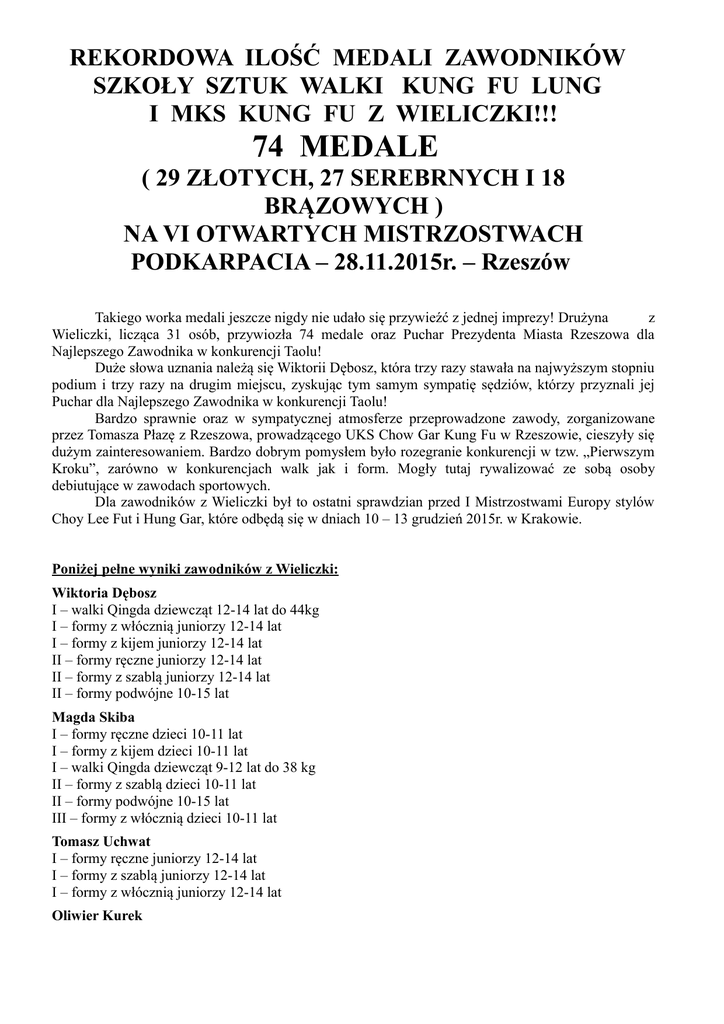 REKORDOWA ILOŚĆ MEDALI ZAWODNIKÓW SZKOŁY SZTUK WALKI KUNG FU LUNG I MKS KUNG FU Z WIELICZKI!!! 74 MEDALE ( 29 ZŁOTYCH, 27 SEREBRNYCH I 18 BRĄZOWYCH ) NA VI OTWARTYCH MISTRZOSTWACH PODKARPACIA – 28.11.2015r. – Rzeszów Takiego worka medali jeszcze nigdy nie udało się przywieźć z jednej imprezy! Drużyna z Wieliczki, licząca 31 osób, przywiozła 74 medale oraz Puchar Prezydenta Miasta Rzeszowa dla Najlepszego Zawodnika w konkurencji Taolu! Duże słowa uznania należą się Wiktorii Dębosz, która trzy razy stawała na najwyższym stopniu podium i trzy razy na drugim miejscu, zyskując tym samym sympatię sędziów, którzy przyznali jej Puchar dla Najlepszego Zawodnika w konkurencji Taolu! Bardzo sprawnie oraz w sympatycznej atmosferze przeprowadzone zawody, zorganizowane przez Tomasza Płazę z Rzeszowa, prowadzącego UKS Chow Gar Kung Fu w Rzeszowie, cieszyły się dużym zainteresowaniem. Bardzo dobrym pomysłem było rozegranie konkurencji w tzw. „Pierwszym Kroku”, zarówno w konkurencjach walk jak i form. Mogły tutaj rywalizować ze sobą osoby debiutujące w zawodach sportowych. Dla zawodników z Wieliczki był to ostatni sprawdzian przed I Mistrzostwami Europy stylów Choy Lee Fut i Hung Gar, które odbędą się w dniach 10 – 13 grudzień 2015r. w Krakowie. Poniżej pełne wyniki zawodników z Wieliczki: Wiktoria Dębosz I – walki Qingda dziewcząt 12-14 lat do 44kg I – formy z włócznią juniorzy 12-14 lat I – formy z kijem juniorzy 12-14 lat II – formy ręczne juniorzy 12-14 lat II – formy z szablą juniorzy 12-14 lat II – formy podwójne 10-15 lat Magda Skiba I – formy ręczne dzieci 10-11 lat I – formy z kijem dzieci 10-11 lat I – walki Qingda dziewcząt 9-12 lat do 38 kg II – formy z szablą dzieci 10-11 lat II – formy podwójne 10-15 lat III – formy z włócznią dzieci 10-11 lat Tomasz Uchwat I – formy ręczne juniorzy 12-14 lat I – formy z szablą juniorzy 12-14 lat I – formy z włócznią juniorzy 12-14 lat Oliwier Kurek I – walki chłopców 11-12 lat do 65 kg – Pierwszy Krok I – formy ręczne dzieci 10-11 lat – Pierwszy Krok I – formy z szablą dzieci 9-11 lat – Pierwszy Krok Piotr Kutyba I – formy podwójne 10-15 lat I – walki Qingda juniorów 17-18 lat do 52 kg – Pierwszy Krok II – formy z kijem seniorzy 18-39 lat III – formy z bronią długą różną seniorzy 18-40 lat Aleksandra Dziurdzia I – formy z szablą juniorek 15-17 lat I – formy z bronią krótką różną juniorzy 15-17 lat III – formy ręczne juniorzy 15-17 lat III – formy z włócznią juniorzy 15-17 lat Zuzanna Szymczyk I – formy ręczne dzieci 7-9 lat – Pierwszy Krok I – walki Qingda dziewcząt 7-8 lat do 32 kg – Pierwszy Krok Eric Mio Goman I – walki Qingda dzieci 7-8 lat do 23 kg – Pierwszy Krok I – formy ręczne dzieci 3-6 lat – Pierwszy Krok Ewelina Michalczyk I – formy podwójne 10-15 lat II – formy z szablą juniorzy 15-17 lat II – formy ręczne juniorzy 15-17 II – formy z włócznią juniorzy 15-17 lat Filip Parafiński I – formy z kijem dzieci 9-11 lat – Pierwszy Krok II – formy ręczne chłopców 10-11 lat – Pierwszy Krok II – formy z szablą dzieci 9-11 lat – Pierwszy Krok Karolina Mathias I – formy z bronią krótką różną juniorzy 12-14 lat II – formy z włócznią juniorzy 12-14 lat III – formy z szablą juniorzy 12-14 lat III – formy ręczne juniorzy 12-14 lat Wiktoria Kucia I – formy ręczne dzieci 10-11 lat – Pierwszy Krok III – formy z szablą dzieci 8-12 lat – Pierwszy Krok III – formy z kijem dzieci 8-12 lat – Pierwszy Krok Angelika Turek I – walki Qingda dziewcząt 13-14 lat do 56 kg III – formy podwójne 10-15 lat Karol Bromblik I – formy ręczne seniorów 18-14 lat Konstancja Wójs I – walki Qingda juniorek 15-17 lat do 65 kg Zuzanna Stettner I – walki Qingda dziewcząt 7-8 lat do 32 kg – Pierwszy Krok Michał Wrona I – walki Qingda chłopców 9-10 lat do 32 kg – Pierwszy Krok Nikola Sarga II – formy z kijem juniorzy 12-14 lat II – walki Qingda dziewcząt 9-12 lat do 38 kg Oliwia Gargas II – formy ręczne juniorzy 12-14 lat – Pierwszy Krok II – formy z szablą juniorzy 12-14 lat – Pierwszy Krok II – formy z kijem juniorzy 12-14 lat – Pierwszy Krok III – walki Qingda dziewcząt 12-14 lat do 44 kg Bartosz Uchwat II – formy z szablą dzieci 10-11 lat II – formy ręczne dzieci 10-11 lat II – formy z kijem dzieci 9-11 lat Adrianna Nawrot II – walki Qingda dziewcząt 13-14 lat do 56 kg III – formy podwójne 10-15 lat III – formy z włócznią juniorów 12-14 lat III – formy z bronią krótką 12-14 lat Oliwia Chabowska II – walki Qingda dziewcząt 12-14 lat do 44 kg III – formy z bronią krótką różną 12-14 lat Dawid Kowalik II – formy z szablą juniorzy 15-17 lat III – formy ręczne juniorzy 15-17 lat Filip Zych II – walki Sanda seniorzy do 70 kg Kacper Kuć II – walki Qingda juniorów 14-16 lat do 65 kg Marcin Socha II – walki Qingda seniorzy do 85 kg Piotr Uchwat II – formy z szablą 18-40 lat Adam Krupa III – walki Qingda chłopców 11-12 lat do 46 kg Jakub Bugajski III – walki Qingda juniorów 14-16 lat do 65 kg Jakub Krupa III – formy z szablą seniorów 18-40 lat
