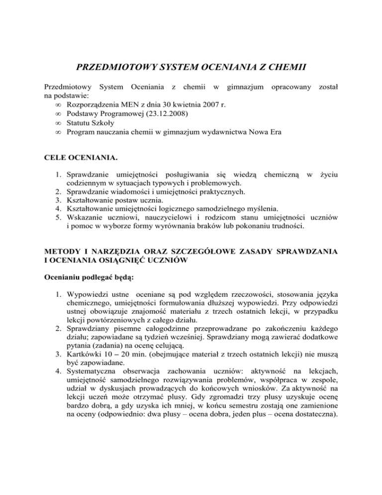 PRZEDMIOTOWY SYSTEM OCENIANIA Z CHEMII Przedmiotowy System Oceniania z chemii w gimnazjum opracowany został na podstawie: • Rozporządzenia MEN z dnia 30 kwietnia 2007 r. • Podstawy Programowej (23.12.2008) • Statutu Szkoły • Program nauczania chemii w gimnazjum wydawnictwa Nowa Era CELE OCENIANIA. 1. Sprawdzanie umiejętności posługiwania się wiedzą chemiczną w Ŝyciu codziennym w sytuacjach typowych i problemowych. 2. Sprawdzanie wiadomości i umiejętności praktycznych. 3. Kształtowanie postaw ucznia. 4. Kształtowanie umiejętności logicznego samodzielnego myślenia. 5. Wskazanie uczniowi, nauczycielowi i rodzicom stanu umiejętności uczniów i pomoc w wyborze formy wyrównania braków lub pokonaniu trudności. METODY I NARZĘDZIA ORAZ SZCZEGÓŁOWE ZASADY SPRAWDZANIA I OCENIANIA OSIĄGNIĘĆ UCZNIÓW Ocenianiu podlegać będą: 1. Wypowiedzi ustne oceniane są pod względem rzeczowości, stosowania języka chemicznego, umiejętności formułowania dłuŜszej wypowiedzi. Przy odpowiedzi ustnej obowiązuje znajomość materiału z trzech ostatnich lekcji, w przypadku lekcji powtórzeniowych z całego działu. 2. Sprawdziany pisemne całogodzinne przeprowadzane po zakończeniu kaŜdego działu; zapowiadane są tydzień wcześniej. Sprawdziany mogą zawierać dodatkowe pytania (zadania) na ocenę celującą. 3. Kartkówki 10 – 20 min. (obejmujące materiał z trzech ostatnich lekcji) nie muszą być zapowiadane. 4. Systematyczna obserwacja zachowania uczniów: aktywność na lekcjach, umiejętność samodzielnego rozwiązywania problemów, współpraca w zespole, udział w dyskusjach prowadzących do końcowych wniosków. Za aktywność na lekcji uczeń moŜe otrzymać plusy. Gdy zgromadzi trzy plusy uzyskuje ocenę bardzo dobrą, a gdy uzyska ich mniej, w końcu semestru zostają one zamienione na oceny (odpowiednio: dwa plusy – ocena dobra, jeden plus – ocena dostateczna). W przypadku duŜej aktywności na lekcji uczeń moŜe otrzymać ocenę bardzo dobrą. 5. Podczas oceny sprawdzianów pisemnych lub kartkówek przyjmuje się następującą skalę punktową: bardzo dobra............................100% - 91% dobra........................................90% - 71% dostateczna..............................70% - 51% dopuszczająca..........................50% - 30% niedostateczna.........................29% - 0% 6. Uczeń moŜe uzyskać ocenę za inne formy aktywności, np. opracowanie ciekawych materiałów, referaty, zeszyt, prezentacje multimedialne, zadania domowe, plakaty, albumy, udział w konkursach i aktywność na kółku chemicznym (np. rozwiązywanie zadań). SPOSOBY DOKUMENTOWANIA OSIĄGNIĘĆ UCZNIÓW 1. Przy kaŜdej ocenie w dzienniku lekcyjnym jest wpis określający rodzaj aktywności ucznia, zakres materiału i forma sprawdzianu. Przy kaŜdej pracy sprawdzającej stopień opanowania większej partii materiału (klasówka), nauczyciel wskazuje ustnie uczniom ich osiągnięcia i braki. 2. Wystawienie oceny semestralnej i końcoworocznej dokonuje się na podstawie ocen cząstkowych, przy czym większą wagę mają oceny ze sprawdzianów, w drugiej kolejności są odpowiedzi ustne i kartkówki. Pozostałe oceny są wspomagające. SPOSOBY KORYGOWANIA NIEPOWODZEŃ SZKOLNYCH 1. Uczeń po uzyskaniu oceny niedostatecznej z kartkówek moŜe ją poprawić pozytywną oceną na całogodzinnym sprawdzianie z danego rozdziału. JeŜeli z tego sprawdzianu uzyska ocenę negatywną, ma szansę poprawić ją na lekcji przeznaczonej na omówienie i poprawę. Lekcja taka odbywa się najpóźniej 2 tygodnie od pisania całogodzinnego sprawdzianu. MoŜe teŜ poprawić sprawdzian na zajęciach zespołu wyrównawczego w dowolnie wybranym przez siebie terminie (w którym odbywają się zajęcia), nie później jednak niŜ tydzień przed terminem, w którym nauczyciel musi wystawić ocenę semestralną. 2. Do dziennika obok oceny uzyskanej poprzednio wpisuje się ocenę uzyskaną z poprawy. 3. Uczeń moŜe być zwolniony przez nauczyciela z pisania pracy klasowej, kartkówki lub odpowiedzi ustnej w wyjątkowych sytuacjach losowych. 4. Istnieje moŜliwość konsultacji z nauczycielem w przypadku, gdy uczeń zgłosi chęć uzupełnienia braków z przedmiotu. 5. Pomoc koleŜeńska. Uczeń moŜe być pozbawiony przywileju poprawiania ocen jeŜeli: stwierdzi się nieuczciwość ucznia (odpisywanie, zmiana grupy na sprawdzianie, wykorzystywanie cudzych prac jako własnych, np.: kopiowanie informacji z internetu, odpisywanie zadań domowych, a takŜe odrabianie prac domowych w szkole) – nauczyciel wystawia wówczas uczniowi ocenę niedostateczną bez moŜliwości jej poprawienia, zostanie mu udowodnione inne raŜące zaniedbanie obowiązków uczniowskich – w tym nagminne łamanie zasad szkolnego regulaminu. SPOSOBY INFORMOWANIA UCZNIÓW I RODZICÓW (PRAWNYCH OPIEKUNÓW). 1. Na pierwszej godzinie lekcyjnej uczniowie są zapoznawani z Przedmiotowym Systemem Oceniania. 2. Nauczyciel na początku kaŜdego roku szkolnego informuje rodziców o: a) wymaganiach edukacyjnych niezbędnych do uzyskania poszczególnych śródrocznych i rocznych (semestralnych) ocen klasyfikacyjnych wynikających z realizowanego przez siebie programu nauczania, b) sposobach sprawdzania osiągnięć edukacyjnych uczniów; c) warunkach i trybie uzyskania wyŜszej niŜ przewidywana rocznej (semestralnej) oceny klasyfikacyjnej z obowiązkowych i dodatkowych zajęć edukacyjnych. Sposób informowania zawarty jest w Statucie Szkoły. 3. O ocenach cząstkowych lub końcowych informuje rodziców: a) wychowawca klasy na zebraniach rodzicielskich indywidualnych spotkań, b) nauczyciel uczący czasie dyŜurów nauczycielskich. lub w czasie INNE 1. Oceny są jawne dla ucznia i jego rodziców (prawnych opiekunów). 2. Na wniosek ucznia lub jego rodziców (prawnych opiekunów) nauczyciel uzasadnia ustaloną ocenę. 3. Na wniosek ucznia lub jego rodziców (prawnych opiekunów), sprawdzone i ocenione pisemne prace kontro