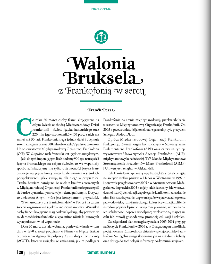 frankofonia Walonia Bruksela z Frankofonią w sercu C Franck Pezza [ 28 ] temat numeru o roku 20 marca osoby francuskojęzyczne na całym świecie obchodzą Międzynarodowy Dzień Frankofonii – święto języka francuskiego oraz 220 mln jego użytkowników (60 proc. z nich ma mniej niż 30 lat). Frankofonia sięga jednak dalej i obejmuje swoim zasięgiem prawie 900 mln obywateli 77 państw, członków lub obserwatorów Międzynarodowej Organizacji Frankofonii (OIF). W 32 spośród nich francuski jest językiem urzędowym. Jeśli do tych imponujących liczb dodamy 900 tys. nauczycieli języka francuskiego na całym świecie, to we wspaniały sposób zaświadczymy nie tylko o żywotności języka francuskiego na pięciu kontynentach, ale również o szerokich perspektywach, jakie rysują się dla niego w przyszłości. Trzeba bowiem pamiętać, że wiele z krajów zrzeszonych w Międzynarodowej Organizacji Frankofonii może poszczycić się bardzo dynamicznym rozwojem demograficznym. Dotyczy to zwłaszcza Afryki, która jest kontynentem przyszłości. W ten uroczysty dla Frankofonii dzień w Polsce i na całym świecie organizowane są okolicznościowe imprezy. Wszystkie osoby francuskojęzyczne mają doskonałą okazję, aby potwierdzić solidarność świata frankofońskiego, mimo różnic kulturowych występujących w tej wspólnocie. Data 20 marca została wybrana, ponieważ właśnie w tym dniu w 1970 r. został podpisany w Niamey w Nigrze Traktat o utworzeniu Agencji Współpracy Kulturalnej i Technicznej (ACCT), która w związku ze zmianami, jakim podlegała Frankofonia na arenie międzynarodowej, przekształciła się z czasem w Międzynarodową Organizację Frankofonii. Od 2003 r. przewodniczy jej jako sekretarz generalny były prezydent Senegalu Abdou Diouf. Oprócz Międzynarodowej Organizacji Frankofonii funkcjonują również: organ konsultacyjny – Stowarzyszenie Parlamentarne Frankofonii (APF) oraz cztery instytucje wykonawcze: Uniwersytecka Agencja Frankofonii (AUF), międzynarodowy kanał telewizji TV5 Monde, Międzynarodowe Stowarzyszenie Prezydentów Miast Frankofonii (AIMF) i Uniwersytet Senghor w Aleksandrii. Cele Frankofonii zapisane są w jej Karcie, która została przyjęta na szczycie szefów państw w Hanoi w Wietnamie w 1997 r. i ponownie przegłosowana w 2005 r. w Antananarywie na Madagaskarze. Poprawki z 2005 r. objęły takie dziedziny, jak: wprowadzanie i rozwój demokracji, zapobieganie konfliktom, zarządzanie nimi i ich rozwiązywanie, wspieranie państwa praworządnego oraz praw człowieka, rozwijanie dialogu kultur i cywilizacji, zbliżenie narodów poprzez lepsze ich wzajemne poznanie, wzmocnienie ich solidarności poprzez współpracę wielostronną mającą na celu ich rozwój gospodarczy, promocję edukacji i szkoleń. Dziesięcioletni plan strategiczny na lata 2005-2014 przyjęty na Szczycie Frankofonii w 2004 r. w Ouagadougou umożliwia podejmowanie różnorodnych działań wspierających ideę Frankofonii. Szczególna uwaga skierowana jest na młodzież i kobiety oraz dostęp do technologii informacyjno-komunikacyjnych. frankofonia Międzynarodowa Organizacja Frankofonii, stworzona początkowo w celu rozwijania współpracy, stała się z biegiem czasu instytucją coraz bardziej polityczną, broniącą pokoju, wspierającą rozwój i dialog kultur. Dziś zrzesza ponad jedną trzecią państw członkowskich ONZ oraz większość państw Unii Europejskiej. Walonia-Bruksela w sercu Frankofonii W ramach belgijskiego systemu federalnego Federacja Walonia-Bruksela łączy w zakresie powierzonych jej kompetencji osoby francuskojęzyczne mieszkające w Walonii i w Brukseli (w sumie około 4,5 mln obywateli). Język francuski pozostaje więc w centrum jej tożsamości, a frankofonia w centrum jej działań. W polityce międzynarodowej język francuski jest jednym z najważniejszych elementów jej działań zarówno w stosunkach wielostronnych (jako trzeci po Francji i Kanadzie płatnik składek na Frankofonię Walonia-Bruksela współdziała z Międzynarodową Organizacją Frankofonii na całym świecie, czego przykładem jest Wieloletni Plan na rzecz Obecności Języka Francuskiego w Instytucjach Europejskich), jak i w stosunkach dwustronnych (warto przywołać spośród wielu przykładów sieć lektorów języka francuskiego z Walonii-Brukseli pracujących na uniwersytetach i w liceach w Europie oraz na całym świecie). Zachowując w Międzynarodowej Organizacji Frankofonii status obserwatora, Polska pozostaje priorytetowym partnerem Walonii-Brukseli ze względu na prowadzoną współpracę. W Warszawie ma swoją siedzibę jedno w 15. Przedstawicielstw Walonia-Bruksela. Ze względu za zakres wsparcia udzielonego przez Walonię-Brukselę można powiedzieć, że Polska korzysta z niego bardziej niż inne kraje. Pięciu naszych lektorów pracuje na Uniwersytecie Warszawskim, Uniwersytecie Jagiellońskim, Uniwersytecie A. Mickiewicza w Poznaniu, Uniwersytecie Śląskim w Sosnowcu, w Sieci Klas Frankofońskich na Śląsku i w dwujęzycznym Liceum Ogólnokształcącym nr 17 w Krakowie. Wiele projektów z aktualnego Programu Wykonawczego Umowy o Współpracy, podpisanego przez przedstawicieli naszych dwóch rządów, obejmuje dziedziny powiązane z językiem francuskim. Są to stypendia i projekty wymiany oraz zasługujący na szczególną uwagę projekt klas frankofońskich na Śląsku, który można uznać za cud na mapie edukacyjnej Polski. Przedstawicielstwo Walonia-Bruksela wspiera na miarę swoich możliwości wszelkie inicjatywy promujące język francuski i jego nauczanie. Z okazji Święta Frankofonii z przyjemnością wspieramy szkolne konkursy poświęcone Walonii-Brukseli i językowi francuskiemu. Organizując przez cały rok różne wydarzenia kulturalne, Przedstawicielstwo Walonia-Bruksela wspiera jedną z najważniejszych wartości Frankofonii, jaką jest dialog kultur i cywilizacji oraz wzajemne poznanie się narodów. Mam przyjemność za