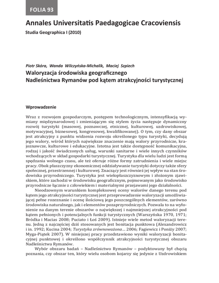 Folia 93 Annales Universitatis Paedagogicae Cracoviensis Studia Geographica I (2010) Piotr Skóra, Wanda Wilczyńska-Michalik, Maciej Szpiech Waloryzacja środowiska geograficznego Nadleśnictwa Rymanów pod kątem atrakcyjności turystycznej Wprowadzenie Wraz z rozwojem gospodarczym, postępem technologicznym, intensyfikacją wymiany międzynarodowej i zmieniającym się stylem życia następuje dynamiczny rozwój turystyki (masowej, poznawczej, etnicznej, kulturowej, uzdrowiskowej, motywacyjnej, biznesowej, kongresowej, kwalifikowanej). O tym, czy dany obszar jest atrakcyjny z punktu widzenia rozwoju określonego typu turystyki, decydują jego walory, wśród których największe znaczenie mają walory przyrodnicze, krajoznawcze, kulturowe i edukacyjne. Istotna jest także dostępność komunikacyjna, rodzaj i jakość świadczonych usług, warunki sanitarne i wiele innych czynników wchodzących w skład gospodarki turystycznej. Turystyka dla wielu ludzi jest formą spędzania wolnego czasu, ale też oferuje różne formy zatrudnienia i wiele miejsc pracy. Obok płaszczyzny ekonomicznej oddziaływanie turystyki dotyczy także sfery społecznej, przestrzennej i kulturowej. Znaczący jest również jej wpływ na stan środowiska przyrodniczego. Turystyka jest wielopłaszczyznowym i złożonym zjawiskiem, które zachodzi w środowisku geograficznym, pojmowanym jako środowisko przyrodnicze łącznie z człowiekiem i materialnymi przejawami jego działalności. Nieodzownym warunkiem kompleksowej oceny walorów danego terenu pod kątem jego atrakcyjności turystycznej jest przeprowadzenie waloryzacji umożliwiającej pełne rozeznanie i ocenę ilościową jego poszczególnych elementów, zarówno środowiska naturalnego, jak i elementów pozaprzyrodniczych. Pozwala to na wyłonienie na danym terenie obszarów o największej i najmniejszej atrakcyjności pod kątem pełnionych i potencjalnych funkcji turystycznych (Warszyńska 1970, 1971; Bródka i Macias 2008; Puciato i Łoś 2009). Istnieje wiele metod waloryzacji terenu. Jedną z najczęściej dziś stosowanych jest bonitacja punktowa (Alexandrowicz i in. 1992; Kucina 2004; Turystyka zrównoważona… 2006; Fagiewicz i Poniży 2007; Myga-Piątek 2007). W niniejszej pracy przedstawiono wyniki waloryzacji bonitacyjnej punktowej i określono współczynnik atrakcyjności turystycznej obszaru Nadleśnictwa Rymanów. Wybór obszaru badań – Nadleśnictwo Rymanów – podyktowany był chęcią poznania, czy obszar ten, który wielu osobom kojarzy się jedynie z Uzdrowiskiem Waloryzacja środowiska geograficznego Nadleśnictwa Rymanów… [41] Rymanów, ma do zaproponowania turystom coś więcej niż pijalnie wód i lecznicze kąpiele. Dzięki przyjętej metodzie waloryzacji opartej głównie na schemacie zaproponowanym przez Kucinę (2004) w pracy Projekt waloryzacji nadleśnictw pod kątem turystycznej atrakcyjności środowiska możliwe będzie w przyszłości porównanie atrakcyjności turystycznej Nadleśnictwa Rymanów z innymi nadleśnictwami w Polsce. Projekt ten został bowiem zaakceptowany i przedstawiony do wdrożenia przez Dyrekcję Generalną Lasów Państwowych z siedzibą w Warszawie, jako klucz do przeprowadzania waloryzacji przyrodniczo-krajobrazowej pod kątem atrakcyjności turystycznej na szczeblu nadleśnictw. Teren badań Nadleśnictwo Rymanów leży w południowej części województwa podkarpackiego. Obejmuje 6 gmin: Rymanów, Iwonicz Zdrój, Dukla, Komańcza, Besko, Zarszyn. Organizacyjnie należy do Regionalnej Dyrekcji Lasów Państwowych z siedzibą w Krośnie. Jego powierzchnia wynosi ok. 207,3 km2 (wszystkie grunty należące do Lasów Państwowych). Obszar zasięgu Nadleśnictwa (tereny należące do Lasów Państwowych i lasy niepaństwowe, nad którymi Nadleśnictwo sprawuje zarząd w imieniu wojewody) zajmuje powierzchnię około 510 km2. Lasy stanowią ponad 97% pokrycia terenu Nadleśnictwa. Znajdują się one w bardzo dobrej kondycji i są cennym elementem krajobrazu. Metody badań Podstawową metodą, służącą do określenia atrakcyjności turystycznej terenu Nadleśnictwa Rymanów, była metoda waloryzacji w oparciu o system bonitacji punktowej. W zastosowanej metodzie przyjęto skalę, która jest funkcją określającą związek pomiędzy badaną cechą a liczbą punktów. Konkretnym cechom środowiska geograficznego przypisano wartości punktowe (od 0 do 5 punktów). Ponieważ zastosowanie tej metody jest możliwe tylko na podstawie dobrej znajomości cech środowiska fizyczno-geograficznego badanego terenu, przed przystąpieniem do waloryzacji dokonano inwentaryzacji przyrodniczej oraz analizy wielu opracowań kartograficznych. Podczas waloryzacji wzięto pod uwagę dziewięć cech środowiska geograficznego: ukształtowanie terenu (1), wody (2), florę i faunę (3), elementy specjalistyczne środowiska przyrodniczego (4), elementy monitoringu środowiska (5), zagospodarowanie turystyczne (6), elementy środowiska kulturowego (7), elementy kształtujące walor atrakcyjności turystycznej (8), dostępność komunikacyjną (9). W obrębie każdej cechy do oceny bonitacyjnej brano pod uwagę kilka elementów. Niektórych elementów uwzględnionych przez Kucinę (2004) nie rozważano lub brano je pod uwagę w zmienionym zakresie ze względu na brak danych. Dotyczy to szczególnie stanu środowiska (jakość wód, gleb, powietrza atmosferycznego). Do oceny zanieczyszczenia powietrza atmosferycznego dwutlenkiem siarki (SO2) zastosowano metodę bioindykacji przy użyciu skali porostowej (Bielczyk, 1994). Do elementów flory i fauny została dodana klasyfikacja opracowana na podstawie Polskiej Czerwonej [42] Piotr Skóra, Wanda Wilczyńska-Michalik, Maciej Szpiech Księgi Zwierząt (Głowaciński, 2001) dotycząca występowania gatunków zagrożonych. Do oceny stopnia złożoności podłoża w aspekcie zagospodarowania terenu wzięto elementy wyszczególnione przez Falkowskiego (2007). W elementach środo