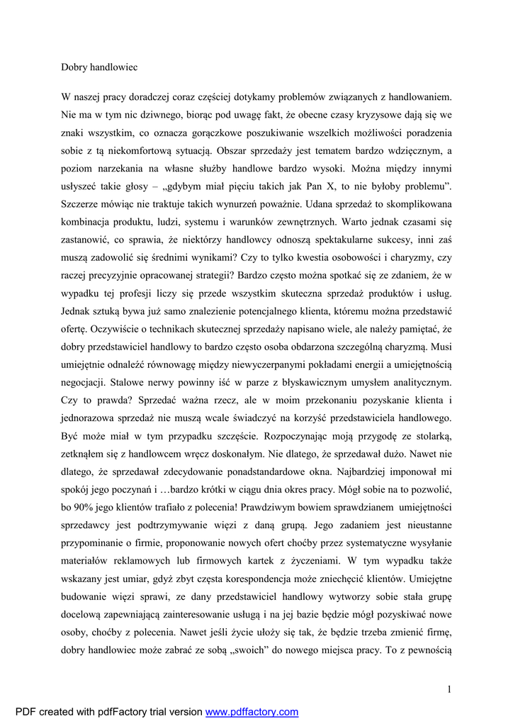 Dobry handlowiec W naszej pracy doradczej coraz częściej dotykamy problemów związanych z handlowaniem. Nie ma w tym nic dziwnego, biorąc pod uwagę fakt, że obecne czasy kryzysowe dają się we znaki wszystkim, co oznacza gorączkowe poszukiwanie wszelkich możliwości poradzenia sobie z tą niekomfortową sytuacją. Obszar sprzedaży jest tematem bardzo wdzięcznym, a poziom narzekania na własne służby handlowe bardzo wysoki. Można między innymi usłyszeć takie głosy – „gdybym miał pięciu takich jak Pan X, to nie byłoby problemu”. Szczerze mówiąc nie traktuje takich wynurzeń poważnie. Udana sprzedaż to skomplikowana kombinacja produktu, ludzi, systemu i warunków zewnętrznych. Warto jednak czasami się zastanowić, co sprawia, że niektórzy handlowcy odnoszą spektakularne sukcesy, inni zaś muszą zadowolić się średnimi wynikami? Czy to tylko kwestia osobowości i charyzmy, czy raczej precyzyjnie opracowanej strategii? Bardzo często można spotkać się ze zdaniem, że w wypadku tej profesji liczy się przede wszystkim skuteczna sprzedaż produktów i usług. Jednak sztuką bywa już samo znalezienie potencjalnego klienta, któremu można przedstawić ofertę. Oczywiście o technikach skutecznej sprzedaży napisano wiele, ale należy pamiętać, że dobry przedstawiciel handlowy to bardzo często osoba obdarzona szczególną charyzmą. Musi umiejętnie odnaleźć równowagę między niewyczerpanymi pokładami energii a umiejętnością negocjacji. Stalowe nerwy powinny iść w parze z błyskawicznym umysłem analitycznym. Czy to prawda? Sprzedać ważna rzecz, ale w moim przekonaniu pozyskanie klienta i jednorazowa sprzedaż nie muszą wcale świadczyć na korzyść przedstawiciela handlowego. Być może miał w tym przypadku szczęście. Rozpoczynając moją przygodę ze stolarką, zetknąłem się z handlowcem wręcz doskonałym. Nie dlatego, że sprzedawał dużo. Nawet nie dlatego, że sprzedawał zdecydowanie ponadstandardowe okna. Najbardziej imponował mi spokój jego poczynań i …bardzo krótki w ciągu dnia okres pracy. Mógł sobie na to pozwolić, bo 90% jego klientów trafiało z polecenia! Prawdziwym bowiem sprawdzianem umiejętności sprzedawcy jest podtrzymywanie więzi z daną grupą. Jego zadaniem jest nieustanne przypominanie o firmie, proponowanie nowych ofert choćby przez systematyczne wysyłanie materiałów reklamowych lub firmowych kartek z życzeniami. W tym wypadku także wskazany jest umiar, gdyż zbyt częsta korespondencja może zniechęcić klientów. Umiejętne budowanie więzi sprawi, ze dany przedstawiciel handlowy wytworzy sobie stała grupę docelową zapewniającą zainteresowanie usługą i na jej bazie będzie mógł pozyskiwać nowe osoby, choćby z polecenia. Nawet jeśli życie ułoży się tak, że będzie trzeba zmienić firmę, dobry handlowiec może zabrać ze sobą „swoich” do nowego miejsca pracy. To z pewnością 1 PDF created with pdfFactory trial version www.pdffactory.com zawód dla ludzi towarzyskich, bystrych i odpornych na stres, którzy na rzecz swojej pracy potrafią poświęcić spory obszar życia prywatnego. Łatwo jednak wpaść w pułapkę myślenia o handlowaniu jako o pewnego rodzaju manipulacji. Często słychać – „Jaki on wygadany, powinien być sprzedawcą”. Nic bardziej mylnego! Wielkim błędem jaki popełniają handlowcy jest właśnie gadulstwo. Chcą koniecznie przekonać klienta do swoich usług, zauroczyć go i zaciekawić swoim produktem. Zapominają przy tym o prostej zasadzie, że kiedy mówisz, to niczego się nie dowiesz. A kiedy zadajesz pytania i uważnie słuchasz, zdobywasz istotne informacje na temat klienta. Ujmując sprawę najprościej, jak to możliwe – dobry handlowiec zna się na ludziach i chce ich poznać. Potrafi w błyskawicznym tempie rozpoznać typ i status osoby, z którą przyszło mu rozmawiać i dopasować swoją strategię sprzedaży właśnie do tej konkretnej jednostki. Nie wystarczą wyuczone regułki ze szkoleń. Cały dyskurs powinniśmy zindywidualizować na potrzeby danego klienta. Argument, że „koszt abonamentu wynosi równowartość kwoty przeznaczanej miesięcznie na papierosy”, nie trafi do wyobraźni osoby prowadzącej zdrowy tryb życia. Żadna reakcja nie powinna zaskoczyć dobrego handlowca, nawet jeśli będzie to całkowite zaprzeczenie paradygmatu słowiańskiej gościnności. On wie, jak postępować z rozdrażnionym klientem, co więcej potrafi wysłuchać jego narzekań i wykorzystać je na swoją korzyść. To mistrz dobrego wrażenia. Z należytą pieczołowitością dba o swój wizerunek, żeby nikt, ale to absolutnie nikt nie śmiał posądzać go o złe intencje. Oczywiście wspomniane wyżej umiejętności nie są jedynymi, jakie powinny cechować dobrego sprzedawcę. Mamy wręcz do czynienia z wysypem wskazówek na ten temat. Kilka z nich się przewija we wszystkich publikacjach. O jednej na pewno warto wspomnieć szerzej. Jest nią wiedza. Znajomość produktu, konkurencji, branży i rynku to fundament, na którym można budować sprzedaż czegokolwiek. Być może jestem w tym względzie ortodoksyjny, jednakże będę się upierał, że brak wiedzy produktowej to największy grzech sprzedawcy. Oczywiście i bez niej można sprzedawać, jednakże wtenczas przypomina to malowanie bez przygotowania podłoża: z czasem farba będzie odchodzić od źle przygotowanej powierzchni. Podobnie jest ze sprzedażą: klienci niezadowoleni z usług zrobią sprzedawcy antyreklamę i nie zakupią ponownie, ale przede wszystkim, nie polecą go dalej. Myślenie o sukcesie, to myślenie długofalowe, oparte na zaufaniu i autorytecie. Chcesz być wiarygodny w tym co robisz, rób to najlepiej jak tylko możesz. Bądź ekspertem od tego co sprzedajesz, bądź niezastąpionym doradcą, który myśli kategoriami swojego klienta. Dawaj mu więcej niż oczekuje, wykazuj się inicjatywą, kreatywnością i elastycznością w obsłudze