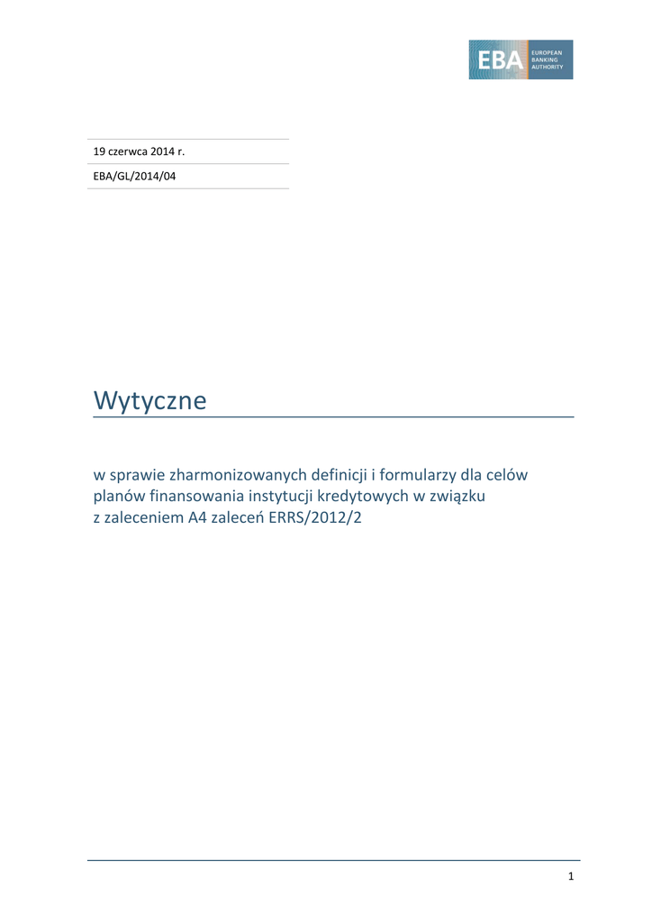 19 czerwca 2014 r. EBA/GL/2014/04 Wytyczne w sprawie zharmonizowanych definicji i formularzy dla celów planów finansowania instytucji kredytowych w związku z zaleceniem A4 zaleceń ERRS/2012/2 1 Wytyczne EUNB w sprawie zharmonizowanych definicji i formularzy dla celów planów finansowania instytucji kredytowych w związku z zaleceniem A4 zaleceń ERRS/2012/2 Status niniejszych wytycznych Niniejszy dokument zawiera wytyczne wydane zgodnie z art. 16 rozporządzenia (UE) nr 1093/2010 Parlamentu Europejskiego i Rady z dnia 24 listopada 2010 r. w sprawie ustanowienia Europejskiego Urzędu Nadzoru (Europejskiego Urzędu Nadzoru Bankowego), zmiany decyzji nr 716/2009/WE oraz uchylenia decyzji Komisji 2009/78/WE (dalej zwanego „rozporządzeniem w sprawie EUNB“). Zgodnie z art. 16 ust. 3 rozporządzenia w sprawie EUNB właściwe organy i instytucje finansowe są obowiązane dołożyć wszelkich starań, aby zastosować się do wytycznych. W treści wytycznych przedstawiono stanowisko EUNB w kwestii odpowiednich praktyk nadzorczych w ramach Europejskiego Systemu Nadzoru Finansowego lub sposób stosowania prawa unijnego w określonym obszarze. W związku z tym EUNB oczekuje zastosowania się do niniejszych wytycznych od wszystkich właściwych organów i instytucji finansowych, do których są one kierowane. Właściwe organy, których dotyczą niniejsze wytyczne, powinny zastosować się do nich poprzez odpowiednie włączenie ich do własnych praktyk nadzorczych (np. poprzez zmianę własnych ram prawnych lub procesów nadzorczych), również wówczas, gdy wytyczne kierowane są w pierwszym rzędzie do instytucji. Wymogi w zakresie sprawozdawczości Zgodnie z art. 16 ust. 3 rozporządzenia w sprawie EUNB właściwe organy mają obowiązek powiadomić Urząd do dnia 31 października 2014 r. o tym, czy stosują się lub zamierzają zastosować się do niniejszych wytycznych bądź o przyczynach ich niestosowania lub braku zamiaru ich stosowania. W przypadku nieprzekazania Urzędowi powiadomienia w wyznaczonym terminie Urząd przyjmuje, że dane właściwe organy nie stosują się do wytycznych. Powiadomienia należy przesyłać za pomocą formularza znajdującego się w pkt 5 na adres [email protected] z dopiskiem „EBA/GL/2014/04“. Powiadomienia powinny składać osoby posiadające odpowiednie uprawnienia do zgłaszania zgodności w imieniu swojego właściwego organu. 2 Powiadomienia zostaną opublikowane na stronie internetowej EUNB zgodnie z art. 16 ust. 3 rozporządzenia w sprawie EUNB. 3 Tytuł I– Przedmiot, zakres i definicje 1. Celem niniejszych wytycznych jest ustanowienie spójnych, wydajnych i skutecznych praktyk nadzorczych poprzez harmonizację formularzy i definicji dla ułatwienia przekazywania danych o planach finansowania właściwym organom przez instytucje kredytowe w celu zapewniania zgodności z pkt 1–4 zalecania A zaleceń ERRS z dnia 20 grudnia 2012 r. w sprawie planów finansowania instytucji kredytowych (dalej zwanych „zaleceniami ERRS“ i „zaleceniem A“). 2. Niniejsze wytyczne kierowane są do właściwych organów w rozumieniu art. 4 ust. 2 rozporządzenia w sprawie EUNB oraz do instytucji przekazujących dane o planach finansowania właściwym organom zgodnie z krajowymi ramami wdrożenia zaleceń ERSS 2012/2 w sprawie finansowania instytucji kredytowych. Tytuł II – Wymogi w zakresie przekazywania danych o planach finansowania 3. Właściwe organy powinny zadbać o to, by instytucje przekazywały dane o własnych planach finansowania w oparciu o zharmonizowane formularze i definicje, o których mowa w formularzu załączonym (załącznik I) do niniejszych wytycznych. 4. Właściwe organy powinny zadbać o to, by instytucje składały formularz planu finansowania co najmniej w odstępach rocznych, z podaniem odpowiednich danych liczbowych według stanu na dzień odniesienia i w terminach składania określonych w pkt 8. 5. Właściwe organy powinny określić odpowiedni poziom konsolidacji dla celów przekazywania danych o planach finansowych z uwzględnieniem następujących aspektów: • Adekwatność informacji: właściwe organy powinny zadbać o to, by gromadzone informacje umożliwiały im uzyskanie jednoznacznego obrazu finansowania krajowego systemu bankowego, oraz potencjalnego wpływu realizacji planów finansowania na podaż kredytów dla krajowej gospodarki realnej; ponadto właściwe organy powinny określić, czy mają być gromadzone dane dodatkowe dotyczące głównie finansowania innych (szczególnie pozaunijnych) krajowych systemów bankowych. • Proporcjonalność: właściwe organy powinny zadbać o to, by przy ustalaniu poziomu konsolidacji dla celów zastosowania formularza planu finansowego brano pod uwagę zasoby danej instytucji. Właściwe organy powinny zwrócić szczególną uwagę na istnienie podgrup płynnościowych przy ustaleniu odpowiedniego poziomu konsolidacji dla celów płynności. 4 6. Właściwe organy powinny również zapewnić EUNB pełną przejrzystość w kwestii poziomu konsolidacji oraz wyjaśnienia dotyczące dokonanych wyborów, aby ułatwić EUNB zagregowanie danych dla celów ogólnounijnych. Tytuł III – Postanowienia końcowe i wdrożenie 7. Właściwe organy powinny zadbać o skuteczne stosowanie wytycznych przez instytucje w celu umożliwienia przekazywania danych o planach finansowania za rok 2014 i lata kolejne w sposób zgodny z wytycznymi. 8. W przypadku lat 2014–2015 właściwe organy powinny zadbać o to, by instytucje przekazywały dane o swoich planach finansowania na dzień odniesienia nie późniejszy niż 30 czerwca 2015 r., w terminie do dnia 30 września 2015 r, oraz by plany zostały przekazane 1 do EUNB w terminie do dnia 15 listopada 2015 r. W przypadku lat kolejnych właściwe organy powinny zadbać o to, by instytucje przekazywały dane o własnych planach finansowania zgodnie z niniejszymi wytycznymi w terminie do dnia 31 marca z dniem odniesienia 31 grudnia roku poprz