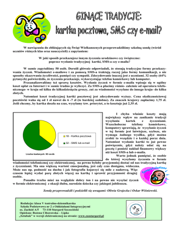 W nawiązaniu do zbliżających się Świąt Wielkanocnych przeprowadziliśmy szkolną sondę (wśród uczniów różnych klas oraz nauczycieli) z zapytaniem: W jaki sposób przekazujesz innym życzenia urodzinowe czy świąteczne: poprzez wysłanie tradycyjnej kartki, SMS-a czy e-maila? W sumie zapytaliśmy 50 osób. Dorośli głównie odpowiadali, że stosują tradycyjne formy przekazywania życzeń. Wiadomości e-mailowe i za pomocą SMS-a traktują raczej jako formy komunikacji, a nie sposoby okazywania życzliwości, pamięci czy sympatii. Zdecydowanie inaczej jest z uczniami. 32 osoby (64% pytanych) potwierdziło, że życzenia przekazuje, wykorzystując telefon komórkowy lub komputer. Przeanalizowaliśmy też sprawę kosztów. Wysłanie życzeń w formie e-maila wpisuje się w ogólny koszt opłat za Internet i w sumie trudno je wyliczyć. Za SMS-a płacimy różnie- zależnie od operatora telefonicznego- w kraju od kilku do kilkudziesięciu groszy, zaś za wiadomości wysyłane do innego kraju- do kilku złotych. Natomiast koszt tradycyjnej kartki pocztowej jest zdecydowanie wyższy. Cena okolicznościowej pocztówki waha się od 1 zł nawet do 6 -7 zł (te bardziej ozdobne). Za znaczek krajowy zapłacimy 1,75 zł. Jeśli chcemy, by kartka doszła na czas, wysyłamy tzw. priorytet, a to kosztuje już 2,35 zł. I chyba właśnie koszty mają największy wpływ na zanikanie tradycji wysyłania kartek z życzeniami. Wszechobecne telefony komórkowe, komputery sprawiają, że wysyłanie życzeń w tej formie jest łatwiejsze, szybsze, nie wymaga żadnego wysiłku, gdyż można 18 - Kartka pocztowa zrobić to wszędzie i o każdej porze dnia. Natomiast wysłanie kartki to już pewne 32 - SMS lub e-mail poświęcenie, gdyż należy udać się na pocztę i ponieść nakład finansowy większy niż koszt SMS-a lub e-maila. Liczba badanych: 50 osób Warto jednak pamiętać, że osobie do której wysyłamy życzenia w formie wiadomości telefonicznej czy elektronicznej, na pewno byłoby przyjemniej dostać od nas tradycyjną kartkę z życzeniami. Ma ona większą wartość emocjonalną, jest cały czas dostępna, widoczna. Może nas np. podnosić na duchu i jak fotografia kojarzyć się mile z nadawcą. Więc czasem lepiej wydać parę złotych więcej na kartkę i sprawić przyjemność drugiej osobie. Ponadto trzeba mieć na względzie dobry ton i na pewno nie wysyłać życzeń w formie elektronicznej z okazji ślubu, narodzin dziecka czy jakiegoś jubileuszu. Sondę przeprowadzili i podzielili się uwagami: Oliwia Grojecka i Oskar Wiśniewski. Redakcja: klasa V teatralno-dziennikarska Szkoła Podstawowa nr 2 z Oddziałami Integracyjnymi os. Zachód A/5 73-110 Stargard Szczeciński Opiekun: Bożena Ciborowska – Lipko „Sztubak” w wersji elektronicznej na stronie: www.zsostargard.pl