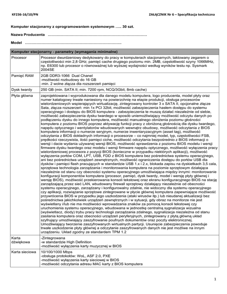 KF236-16/10/PN ZAŁĄCZNIK Nr 6 – Specyfikacja techniczna Komputer stacjonarny z oprogramowaniem systemowym ….. 30 szt. Nazwa Producenta …………………………………………………………………… Model …………………………………………………………………. Komputer stacjonarny - parametry (wymagania minimalne) Procesor Procesor dwurdzeniowy dedykowany do pracy w komputerach stacjonarnych, taktowany zegarem o częstotliwości min 2,8 GHz; pamięć cache drugiego poziomu min. 2MB, częstotliwość szyny 1066MHz, np. E6300 lub procesor o równoważnej lub wyższej wydajności według wyników testu np. Sysmark 2004SE Pamięć RAM 2GB DDR3-1066 Dual Chanel -możliwość rozbudowy do 16 GB -min. 2 wolne złącza dla rozszerzeń pamięci Dysk twardy 250 GB (min. SATA II; min. 7200 rpm, NCQ/3Gbit, 8mb cache) Płyta główna zaprojektowana i wyprodukowana dla danego modelu komputera, logo producenta, model płyty oraz numer katalogowy trwale naniesiony na powierzchnię na etapie produkcji, obsługa procesorów wielordzeniowych wspierających wirtualizację, zintegrowany kontroler 3 x SATA II, opcjonalne złącze Sata, złącza rozszerzeń: min 1x PCI 32bit, możliwość zabezpieczenia hasłem dostępu do systemu operacyjnego i dostępu do BIOS komputera - zabezpieczenia te muszą działać niezależnie od siebie, możliwość zabezpieczenia dysku twardego w sposób uniemożliwiający możliwość odczytu danych po podłączeniu dysku do innego komputera, możliwość manualnego obniżenia poziomu głośności komputera z poziomu BIOS poprzez aktywację funkcji pracy z obniżoną głośnością dla dysku twardego, napędu optycznego i wentylatorów wbudowanych wewnątrz obudowy, możliwość odczytania z BIOS komputera informacji o numerze seryjnym, numerze inwentaryzacyjnym (asset tag), możliwość odczytania z BIOS dokładnych informacji o procesorze – co najmniej model, typ, częstotliwości FSB, prędkości rzeczywista, ilość pamięci ciche, możliwość odczytania bezpośrednio z BIOS informacji o wersji i dacie wydania używanej wersji BIOS, możliwość sprawdzenia z poziomu BIOS modelu i wersji firmware dysku twardego oraz modelu i wersji firmware napędu optycznego, możliwość wyłączenia pracy wielordzeniowej procesora z pozycji BIOS (konieczne w przypadku niektórych aplikacji), możliwość wyłączenia portów COM, LPT, USB, FDD z BIOS komputera bez pośrednictwa systemu operacyjnego, ani bez pośrednictwa urządzeń zewnętrznych, możliwość ograniczenia dostępu do portów USB dla dysków i pamięci flash pracujących w standardzie USB 1.x i 2.x, blokada zapisu na dyskietkach 3,5 cala, sprzętowa technologia zarządzania i monitorowania komputera na poziomie sprzętowym działająca niezależnie od stanu czy obecności systemu operacyjnego umożliwiająca między innymi: monitorowanie konfiguracji komponentów komputera (procesor, pamięć, dysk twardy, model i wersję płyty głównej i wersję BIOS), możliwość przekierowania konsoli tekstowej oraz ekranu konfiguracyjnego BIOS na stację zarządzającą przez sieć LAN, wbudowany firewall sprzętowy działający niezależnie od obecności systemu operacyjnego, zarządzany i konfigurowalny zdalnie, nie widoczny dla systemu operacyjnego czy aplikacji, rozwiązanie sprzętowe zintegrowane w płycie głównej komputera zapewniające możliwość przywrócenia BIOS w przypadku jego uszkodzenia (ataki wirusów itp.) lub nieudanej aktualizacji bez pośrednictwa jakichkolwiek urządzeń zewnętrznych i w sytuacji, gdy obraz na monitorze nie jest wyświetlany i/lub nie ma możliwości wprowadzania znaków za pomocą konsoli tekstowej czy uruchomienia systemu operacyjnego, wbudowana w jednostkę centralną sygnalizacja wizualna (wyświetlacz, diody) trybu pracy technologii zarządzania zdalnego, sygnalizacja niezależna od stanu zasilania komputera oraz obecności urządzeń peryferyjnych, zintegrowany z płytą główną układ szyfrujący umożliwiający zaszyfrowanie poufnych dokumentów oraz poczty elektronicznej. Umożliwiający tworzenie zaszyfrowanych wirtualnych partycji. Usunięcie zabezpieczenia powoduje trwałe uszkodzenie płyty głównej a odczytanie zaszyfrowanych danych nie jest możliwe na innym urządzeniu. Układ zgodny ze standardem TPM 1.2 Karta dźwiękowa -Zintegrowana -w standardzie High Definition -możliwość wyłączenia karty muzycznej w BIOS Karta sieciowa 10/100/1000 Mbps -obsługa protokołów: WoL, ASF 2.0, PXE -możliwość wyłączenia karty sieciowej w BIOS -możliwość odczytania adresu MAC karty z BIOS komputera 1 KF236-16/10/PN Karta graficzna -do 256 MB pamięci współdzielonej z pamięcią systemową -1x VGA -1x DVI ZAŁĄCZNIK Nr 6 – Specyfikacja techniczna Porty I/O min. 10 portów USB 2.0 (w tym min. 3 na panelu przednim) min. 2x RS-232 2x porty PS2, 1x audio line-in, 2x audio line-out, 2x wejście mikrofonowe (wejście mikrofonowe i line-out zdublowane na panelu przednim obudowy), nie dopuszcza się możliwości zasłonięcia złączy USB znajdujących się na panelu przednim jakimikolwiek zaślepkami, maskownicami utrudniającymi wzrokową weryfikację ich użycia – np. obecności klucza USB czy innego urządzenia podłączonego do złączy na panelu przednim obudowy komputera System operacyjny System operacyjny - Licencja dla Windows 7 PRO z prawami do instalacji Windows XP Proffesional w polskiej wersji językowej, Windows 7 PRO Business Muli B, OEM (preinstalowany na dysku twardym) wraz z nośnikiem 32bit oraz 64 bit pozwalającym na ponowną instalację systemu niewymagającą wpisywania klucza rejestracyjnego lub rejestracji poprzez Internet czy telefon, nośnik Windows XP Proffesional 32bit w polskiej wersji językowej - płyta przygotowana przez producenta komputera do automatycznej instalacji na danej jednostce (system wraz ze sterownikami), niewymagająca wpisywania klucza rejestracyjnego lub rejestracji poprzez Internet cz