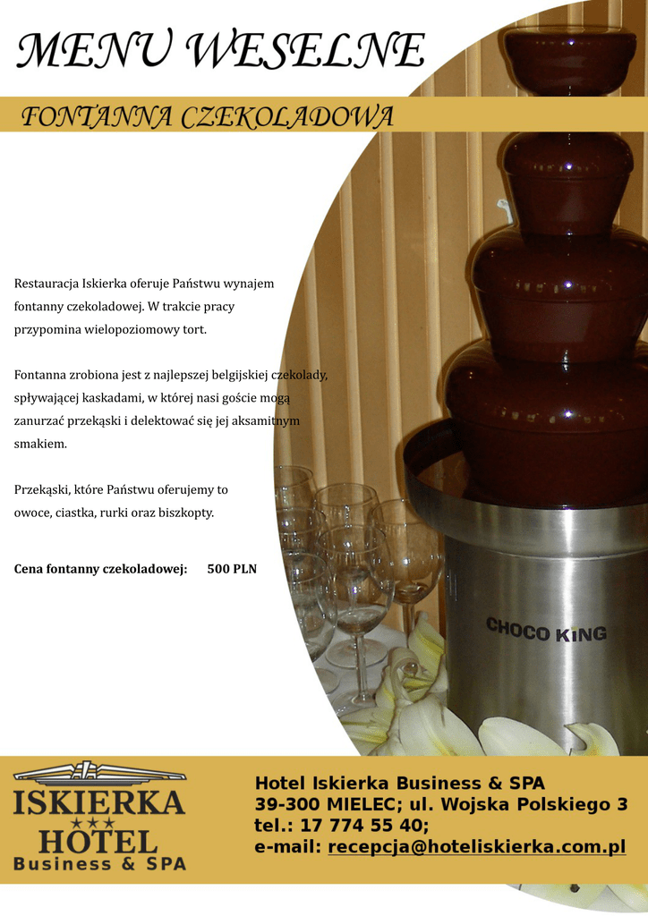 Restauracja Iskierka oferuje Państwu wynajem fontanny czekoladowej. W trakcie pracy przypomina wielopoziomowy tort. Fontanna zrobiona jest z najlepszej belgijskiej czekolady, spływającej kaskadami, w której nasi goście mogą zanurzać przekąski i delektować się jej aksamitnym smakiem. Przekąski, które Państwu oferujemy to owoce, ciastka, rurki oraz biszkopty. Cena fontanny czekoladowej: 500 PLN