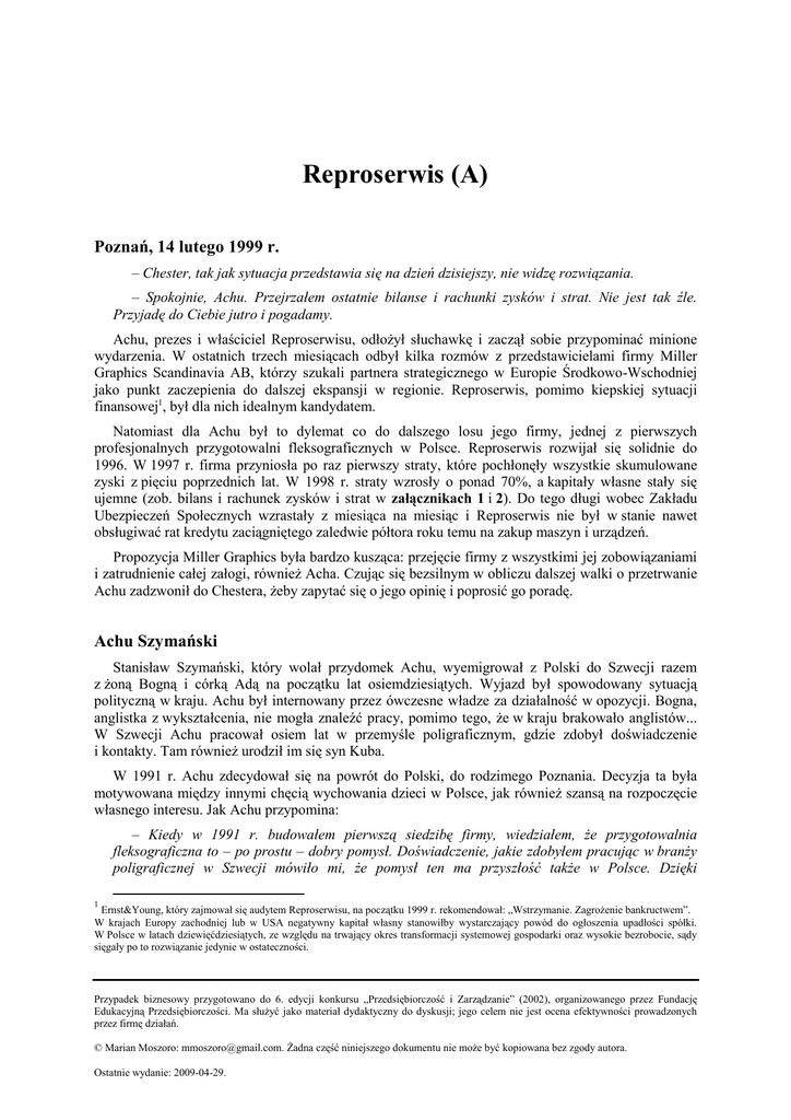 Reproserwis (A) Poznań, 14 lutego 1999 r. – Chester, tak jak sytuacja przedstawia się na dzień dzisiejszy, nie widzę rozwiązania. – Spokojnie, Achu. Przejrzałem ostatnie bilanse i rachunki zysków i strat. Nie jest tak źle. Przyjadę do Ciebie jutro i pogadamy. Achu, prezes i właściciel Reproserwisu, odłoŜył słuchawkę i zaczął sobie przypominać minione wydarzenia. W ostatnich trzech miesiącach odbył kilka rozmów z przedstawicielami firmy Miller Graphics Scandinavia AB, którzy szukali partnera strategicznego w Europie Środkowo-Wschodniej jako punkt zaczepienia do dalszej ekspansji w regionie. Reproserwis, pomimo kiepskiej sytuacji finansowej1, był dla nich idealnym kandydatem. Natomiast dla Achu był to dylemat co do dalszego losu jego firmy, jednej z pierwszych profesjonalnych przygotowalni fleksograficznych w Polsce. Reproserwis rozwijał się solidnie do 1996. W 1997 r. firma przyniosła po raz pierwszy straty, które pochłonęły wszystkie skumulowane zyski z pięciu poprzednich lat. W 1998 r. straty wzrosły o ponad 70%, a kapitały własne stały się ujemne (zob. bilans i rachunek zysków i strat w załącznikach 1 i 2). Do tego długi wobec Zakładu Ubezpieczeń Społecznych wzrastały z miesiąca na miesiąc i Reproserwis nie był w stanie nawet obsługiwać rat kredytu zaciągniętego zaledwie półtora roku temu na zakup maszyn i urządzeń. Propozycja Miller Graphics była bardzo kusząca: przejęcie firmy z wszystkimi jej zobowiązaniami i zatrudnienie całej załogi, równieŜ Acha. Czując się bezsilnym w obliczu dalszej walki o przetrwanie Achu zadzwonił do Chestera, Ŝeby zapytać się o jego opinię i poprosić go poradę. Achu Szymański Stanisław Szymański, który wolał przydomek Achu, wyemigrował z Polski do Szwecji razem z Ŝoną Bogną i córką Adą na początku lat osiemdziesiątych. Wyjazd był spowodowany sytuacją polityczną w kraju. Achu był internowany przez ówczesne władze za działalność w opozycji. Bogna, anglistka z wykształcenia, nie mogła znaleźć pracy, pomimo tego, Ŝe w kraju brakowało anglistów... W Szwecji Achu pracował osiem lat w przemyśle poligraficznym, gdzie zdobył doświadczenie i kontakty. Tam równieŜ urodził im się syn Kuba. W 1991 r. Achu zdecydował się na powrót do Polski, do rodzimego Poznania. Decyzja ta była motywowana między innymi chęcią wychowania dzieci w Polsce, jak równieŜ szansą na rozpoczęcie własnego interesu. Jak Achu przypomina: – Kiedy w 1991 r. budowałem pierwszą siedzibę firmy, wiedziałem, Ŝe przygotowalnia fleksograficzna to – po prostu – dobry pomysł. Doświadczenie, jakie zdobyłem pracując w branŜy poligraficznej w Szwecji mówiło mi, Ŝe pomysł ten ma przyszłość takŜe w Polsce. Dzięki 1 Ernst&Young, który zajmował się audytem Reproserwisu, na początku 1999 r. rekomendował: „Wstrzymanie. ZagroŜenie bankructwem”. W krajach Europy zachodniej lub w USA negatywny kapitał własny stanowiłby wystarczający powód do ogłoszenia upadłości spółki. W Polsce w latach dziewięćdziesiątych, ze względu na trwający okres transformacji systemowej gospodarki oraz wysokie bezrobocie, sądy sięgały po to rozwiązanie jedynie w ostateczności. Przypadek biznesowy przygotowano do 6. edycji konkursu „Przedsiębiorczość i Zarządzanie” (2002), organizowanego przez Fundację Edukacyjną Przedsiębiorczości. Ma słuŜyć jako materiał dydaktyczny do dyskusji; jego celem nie jest ocena efektywności prowadzonych przez firmę działań. © Marian Moszoro: [email protected]. śadna część niniejszego dokumentu nie moŜe być kopiowana bez zgody autora. Ostatnie wydanie: 2009-04-29. Reproserwis (A) wieloletniej praktyce i przy pomocy dobrego sprzętu udało mi się wyprzedzić o krok wiele podobnych polskich przedsiębiorstw. Reproserwis Reproserwis Sp. z o.o. powstał w lipcu 1991 r. jako firma wysokospecjalizowana w przygotowaniu opakowań drukowanych techniką fleksograficzną. Kapitał załoŜycielski spółki wynosił 31.500 zł i dzielił się na 63 udziały, z czego 43 udziały podsiadał Achu, a po 10 udziałów jego dwaj bracia. W 1993 r. Bogna Szymańska wykupiła udziały od jednego szwagra, a dwa lata później od drugiego. W 1996 r. Reproserwis przeprowadził się do nowo wybudowanej hali w Suchym Lesie na przedmieściach Poznania. Tempo rozwoju poligrafii nakazywało firmie podąŜanie za światową myślą techniczną. Achu zdecydował się zatem na zakup komputera Silicon Graphics, naświetlarki i oprogramowania firmy Barco Graphics. Achu mówił o sobie, Ŝe są „przygotowalnią” do drukarni dla opakowań miękkich, jak na przykład kubki plastykowe, jogurty, folie, etc. Reproserwis był współtwórcą opakowań dla wielu firm branŜy spoŜywczej takich jak np. Danone, Bakoma, Malma, Augusto, Iglozbyt, Wytwórnia Tub Laminowanych (zob. załącznik 3). Reproserwis realizował cały proces przygotowawczy: od projektu do formy drukującej. Fleksografia2 Fleksografia jest to technika rotacyjnego druku wypukłego przy uŜyciu elastycznych form drukowych i ciekłych i szybkoschnących farb. Początki procesu druku fleksograficznego sięgają wczesnych lat dwudziestych obecnego wieku, chociaŜ niektórzy historycy dowodzą, Ŝe w latach 60-tych XIX wieku znane juŜ były w USA drukarki anilinowe. Proces ten znany był wtedy pod nazwą druku anilinowego, od struktury chemicznej barwników uŜywanych w stosowanych farbach. Były one produkowane ze smoły węglowej i miały właściwości na tyle toksyczne, Ŝe zostały zakazane przez Urząd śywności i Leków Stanów Zjednoczonych do kontaktów z artykułami Ŝywnościowymi. Zostały one niebawem zastąpione innymi barwnikami, lecz nazwa procesu: druk anilinowy – pozostała jeszcze na długo w uŜyciu. Pierwsze motywy drukarskie były proste, głównie pismo i rysunki kreskowe, bez nakładania kolorów. Brak jakości druku był charakterystyczny dla tego procesu, a