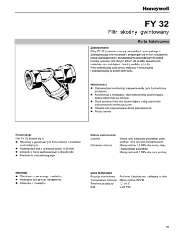 FY 32 Filtr skośny gwintowany Karta katalogowa Zastosowanie Filtry FY 32 przeznaczone są do instalacji przemysłowych. Zabezpieczają one instalacje i znajdujące się w nich urządzenia przed uszkodzeniem i zniszczeniami spowodowanymi przez korozję wskutek ciał obcych takich jak resztki spawalnicze, materiały uszczelniające, drobiny metalu, rdza itp. Filtry przedłużają czas pracy instalacji hydraulicznej i zabezpieczają ją przed usterkami. Właściwości z Odpowiednia konstrukcja zapewnia mały opór hydrauliczny przepływu z Konstrukcja z mosiądzu i stali nierdzewnej zapewniająca dobrą odporność na korozję z Duża powierzchnia sita zapewniająca dużą pojemność zatrzymanych zanieczyszczeń z Obsada sita zapewniająca dobre uszczelnienie z Prosty serwis Konstrukcja Filtr FY 32 składa się z: z Obudowy z gwintowanymi końcówkami o kształcie sześciokątnym z Podwójnego sita o wielkości oczka 0.25 mm z Zaślepki z łbem sześciokątnym i obsadą sita z Pierścienia uszczelniającego Zakres zastosowań Czynnik Materiały z Obudowa z czerwonego mosiądzu z Podwójne sito ze stali nierdzewnej z Zaślepka z mosiądzu Dane techniczne Pozycja montażowa Temperatura robocza Średnice przyłączy Sito Ciśnienie robocze Woda, olej, sprężone powietrze, para wodna i inne czynniki nieagresywne Maksymalnie 1,6 MPa dla wody, oleju i sprężonego powietrza Maksymalnie 0,6 MPa dla pary wodnej Pozioma lub pionowa, zaślepką u dołu Maksymalnie 225°C 1 /4" do 2" 0.25 mm 49 Zasada działania Czynnik przepływając przez filtr FY 32 w kierunku oznaczonym strzałką przechodzi przez podwójne sito o dużej powierzchni od wewnątrz na zewnątrz pozostawiając zanieczyszczenia na ściance sita. Zgromadzone zanieczyszczenia mogą być w prosty sposób usunięte podczas czyszczenia sita. Oznaczenie: FY 32 - ... C = Z podwójnym sitem, wielkość oczek 0.25 mm Wielkość przyłącza R Wielkość przyłączy Nominalna wielkość Przybliżony ciężar Wymiary Wartość Zeta 50 R DN (kg) (mm) L H R1 1 /4 " 8 0.16 3 /8 " 10 0.15 1 /2 " 15 0.21 3 /4 " 20 0.36 1" 25 0.61 11/4" 32 0.88 11/2" 40 1.25 2" 50 1.9 56 32 1 /2 " 5.0 64 32 1 /2 " 14.7 67 36 3 /4 " 9.2 77 45 1" 7.4 90 58 11/4" 7.3 112 70 13/4" 6.2 120 72 2" 6.5 150 92 21/2" 5.6 Przykład instalacji Zasady instalacji z W miarę możliwości należy instalować poziomo z zaślepką skierowaną ku dołowi Położenie takie zapewnia największą efektywność filtrowania Przy instalacji na wznoszących się przewodach rurowych brud nie będzie zbierał się na sicie z Zamontowanie zaworów odcinających Umożliwia to szybkie czyszczenie filtra z Zapewnienie dostępu do urządzenia Tak by możliwe było łatwe wyjęcie sita Ułatwia konserwację i kontrolę Typowe zastosowania Filtry FY 32 powinny być montowane na wejściach do instalacji i urządzeń. Mogą one być stosowane w przemyśle, gdzie wykorzystywane są w ramach swoich parametrów technicznych. Filtry powinny zostać zainstalowane: z W miejscach, w których obecność zanieczyszczeń może spowodować wcześniejsze zniszczenie urządzeń i instalacji z W miejscach, w których istnieje możliwość zablokowania urządzeń lub instalacji z W miejscach, w których obecność zanieczyszczeń może spowodować korozję Kontrola i konserwacja Norma DIN 1988, Część 8 określa że powyższe operacje powinny być przeprowadzane regularnie. Zalecane jest określenie terminarza konserwacji. Działania Okres Wykonane przez Kontrola Kontrola położenia i szczelności wkładu sita i pierścienia uszczelniającego Zgodnie z warunkami pracy Użytkownik lub specjalista Kontrola i konserwacja Czyszczenie lub wymiana sita Zgodnie z warunkami pracy Użytkownik lub specjalista Czyszczenie lub wymiana pierścienia uszczelniającego 51 Części zamienne dla filtrów FY 32 Opis c Wymienne sito z pierścieniem uszczelniającym Wielkość oczek 0.25 mm Honeywell Sp. z o. o. ul. Domaniewska 41, 02-672 WARSZAWA (48)(22) 606 09 00; Fax (48)(22) 606 09 01 http://www.honeywell.com.pl 52 Nominalne wielkości 3 /8" 1 /2" 3 /4" 1" 11/4" 11/2" 2" Nr części ES 32 -3/8 A ES 32 -1/2 A ES 32 -3/4 A ES 32 -1A ES 32 -11/4 A ES 32 -11/2 A ES 32 -2A Komfort i oszczêdnoœæ 53