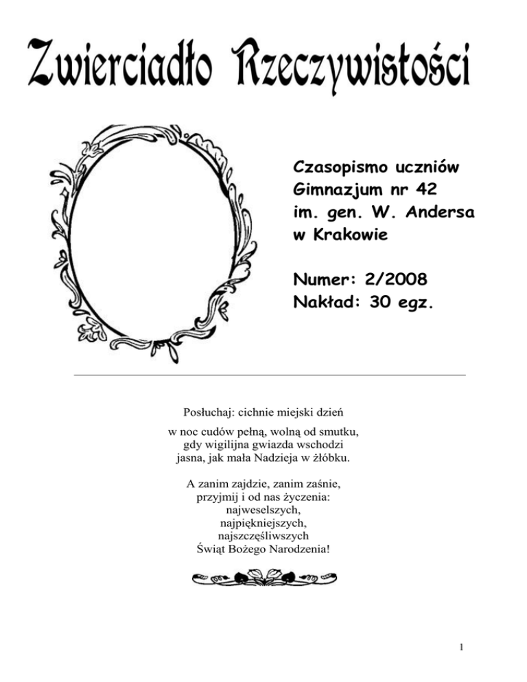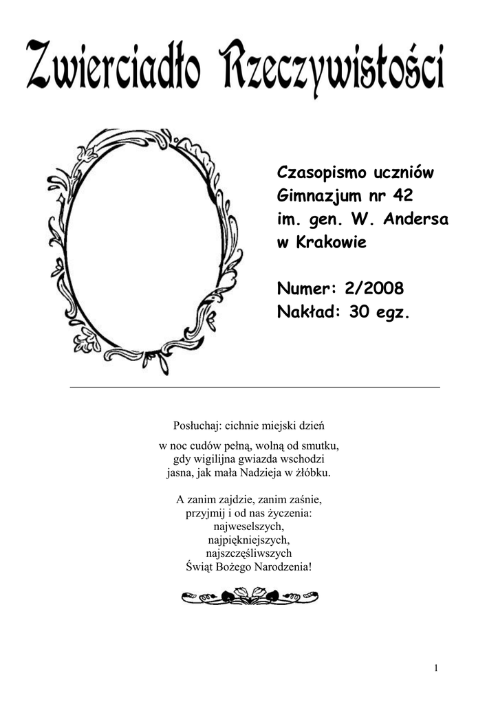 Czasopismo uczniów Gimnazjum nr 42 im. gen. W. Andersa w Krakowie Numer: 2/2008 Nakład: 30 egz. Posłuchaj: cichnie miejski dzień w noc cudów pełną, wolną od smutku, gdy wigilijna gwiazda wschodzi jasna, jak mała Nadzieja w Ŝłóbku. A zanim zajdzie, zanim zaśnie, przyjmij i od nas Ŝyczenia: najweselszych, najpiękniejszych, najszczęśliwszych Świąt BoŜego Narodzenia! 1 ks. Sławomir Chwałek Miły. sutannę. To Zabawny. nasz Nosi ksiądz, czarną młodzieŜą. Choć nie gra w piłkę noŜną jak Sławomir Euzebiusz Smolarek, to dla wielu z nas jest Chwałek. W Gimnazjum nr 42 im. gen. prawdziwym Władysława Andersa uczy juŜ kilka lat. ciekawe Na co dzień jest uśmiechnięty. Widujemy przygotowuje go często na korytarzu podczas przerw, jak Panią Małgosią i MłodzieŜową Grupą dyskutuje Teatralną działającą przy Parafii św. otoczony z uśmiechem przez grono na twarzy uczniów. Na lekcjach religii, które chętnie prowadzi, jest radosny, ale stanowczy. Chce nas nauczyć uczciwości, przygotować do „dorosłego Ŝycia”. Często autorytetem. obozy w Organizuje czasie przedstawienia wakacji, razem z Józefa. MoŜemy z Nim poŜartować i porozmawiać na róŜne tematy. Dziś moŜemy Mu podziękować za dobre słowo, uśmiech, trud i pracę, którą wykonuje z ogromnym zaangaŜowaniem i nasi nauczyciele i wychowawcy proszą Go o interwencję w sercem. Dziękujemy! Łobuzy z 2d jakiejś sprawie, rozmowę z uczniem, mediację z zespołem klasowym. Ksiądz Sławek bardzo lubi współpracę z 2 Daria: Jak ksiądz spędzał Święta BoŜego Narodzenia w dzieciństwie? Ksiądz Sławomir: Spędzałem te święta bardzo rodzinnie, pamiętam, Ŝe czekałem na nie z wielką niecierpliwością. Pamiętam wspólne wigilie – obowiązkowo dwie u moich babci. Zawsze kolędowaliśmy, zasiadając przy choince. Było gwarno – mnóstwo ludzi, cała rodzinka. A potem, odkąd pamiętam, dreptałem z rodzicami a z czasem juŜ sam na Pasterkę. Wspomnienia dotyczące tych dni są bardzo piękne, przyznam, Ŝe brak mi tego teraz. Daria: Jakie dania pojawiały się na rodzinnym stole w rodzinnym domu? Ksiądz Sławomir: Jak wspomniałem, bywałem na dwóch kolacjach wigilijnych, na szczęście babcie w swoich specjałach nie dublowały się, zawsze jednak u kaŜdej musiały być obowiązkowo kluski z makiem – tylko raz w roku tak smakują! A ponadto: karp, zupa grzybowa, barszczyk z uszkami, kompot z suszonych śliwek.… Przynajmniej te potrawy najbardziej mi smakowały. Daria: Dlaczego na kaŜdym stole powinno się znaleźć 12 potraw? Ksiądz Sławomir: Dlaczego? To tradycja nawiązująca do 12 apostołów. Właściwie nigdy się nad tym nie zastanawiałem. WaŜne jest, by wszystkie dania spoŜywane podczas wigilii były postne. Taką tradycję teŜ warto pielęgnować! Daria: Pomagał ksiądz w przygotowaniach wigilijnych? Ksiądz Sławomir: W przygotowaniach kolacji to prawdę powiedziawszy nigdy, jednak moim obowiązkiem były dekoracje świąteczne. Choinki, stroiki itp… Daria: Lubi ksiądz święta BoŜego Narodzenia? Ksiądz Sławomir: Kiedyś inaczej do nich podchodziłem, miałem czas się nimi nacieszyć. Dziś, kiedy jestem księdzem, jest to dla mnie czas wzmoŜonej pracy duszpasterskiej. Adwent, co za tym idzie roraty, duŜo spowiedzi przedświątecznych - to wszystko pochłania sporo energii. Same święta, to teŜ słuŜba wiernym, a to sprawia, Ŝe teraz te święta jakoś tak szybko mi umykają. Trochę mi brakuje tego, by spokojnie poodwiedzać rodzinkę. Daria: Czy jest jakaś róŜnica w sposobie obchodzenia świąt teraz, a kiedyś? Ksiądz Sławomir: Jeśli chodzi o moją rodzinę w zasadzie nie. Tyle tylko, Ŝe teraz dojeŜdŜam do rodziców po zakończeniu obowiązków na parafii i po kolacji wigilijnej, do jakiej równieŜ zasiadam w gronie kapłańskim. Daria: Czego ksiądz Ŝyczyłby sobie i naszym czytelnikom na święta BoŜego Narodzenia? Ksiądz Sławomir: Przede wszystkim, aby kaŜdy z nas umiał w tych świętach odkryć ich najgłębszy sens. To nie gwiazdka, prezenty pod choinką, szaleństwo zakupów, siedzenie przed telewizorem, bo moŜe lepszy program puszczą, ale to, Ŝe Bóg tak bardzo ukochał człowieka, Ŝe chciał być blisko niego. Tak bardzo nas umiłował, Ŝe pokonał wszystkie przeciwności. śyczę Wam i sobie, abyśmy tę miłość Boga przyjęli i nią się dzielili. Niech te święta będą okazją, by i w naszych sercach narodził się nowy człowiek, nowe nadzieje na lepsze jutro jeśli nie zawsze „wczoraj” było dobre. Daria Kuśmierz kl. 3d 3 Święta, Wigilia, śnieg, prezenty…Ten zimowy, świąteczny nastrój nie zwalnia nas z nienagannego, kulturalnego zachowania, jest on nawet bardziej wskazany, bo BoŜe Narodzenie jest tylko raz w roku. Powinniśmy pomóc starszym w przygotowaniach, np. utrzeć masę do ciasta lub przekręcić mak przez maszynkę. PoniewaŜ mamy zwyczaj składania prezentów pod choinkę, nikt z obecnych na Wigilii nie powinien zostać bez upominku. W rodzinie wszyscy obdarowują wszystkich, dlatego prezenty większych dzieci i nastolatków mogą być całkiem skromne. Łamanie się opłatkiem, przepisowe menu, podarki, kolędy naleŜą do wigilijnych zwyczajów. Do nich dochodzą zwyczaje pielęgnowane w poszczególnych rodzinach. Nie wymigujmy się od tego. Tradycja - rzecz bez uŜytku praktycznego jest luksusem, na który mało jest miejsca w codziennym, zabieganym Ŝyciu. Ten jeden wieczór w roku jest jej szczególnie poświęcony, a luksus tradycji jest dla starych ludzi czasem jedynym, jakiego mogą doznać, więc nie wolno psuć im przyjemności. Tradycją nakazuje zapraszanie ludzi samotnych do wspólnego, wigilijnego stołu. Pamiętajmy, Ŝe są teŜ samotne nastolatki z jakiś przyczyn rozdzielone ze swoimi rodzinami. Jeśli mamy takiego kolegę, koleŜankę, zaprośmy ich na Wigilię. KOLEJNOŚĆ SKŁADANIA śYCZEŃ śyczenia złóŜ najpierw babci, potem mamie, potem dziadkowi i 