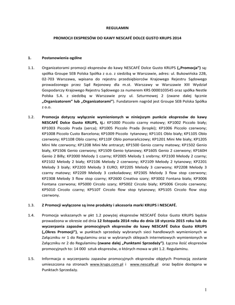 REGULAMIN PROMOCJI EKSPRESÓW DO KAWY NESCAFÉ DOLCE GUSTO KRUPS 2014 1. Postanowienia ogólne 1.1. Organizatorami promocji ekspresów do kawy NESCAFÉ Dolce Gusto KRUPS („Promocja”) są: spółka Groupe SEB Polska Spółka z o.o. z siedzibą w Warszawie, adres: ul. Bukowińska 22B, 02-703 Warszawa, wpisana do rejestru przedsiębiorców Krajowego Rejestru Sądowego prowadzonego przez Sąd Rejonowy dla m.st. Warszawy w Warszawie XIII Wydział Gospodarczy Krajowego Rejestru Sądowego za numerem KRS 0000103545 oraz spółka Nestle Polska S.A. z siedzibą w Warszawie przy ul. Szturmowej 2 (zwane dalej łącznie „Organizatorem” lub „Organizatorami”). Fundatorem nagród jest Groupe SEB Polska Spółka z o.o. 1.2. Promocja dotyczy wyłącznie wymienionych w niniejszym punkcie ekspresów do kawy NESCAFÉ Dolce Gusto KRUPS, tj.: KP1000 Piccolo czarny matowy; KP1002 Piccolo biały; KP1003 Piccolo Prada (serca); KP1005 Piccolo Prada (kropki); KP1006 Piccolo czerwony; KP1008 Piccolo Custo Barcelona; KP1009 Piccolo tytanowy; KP1101 Oblo biały; KP1105 Oblo czerwony; KP1108 Oblo czarny; KP110F Oblo pomarańczowy; KP1201 Mini Me biały; KP1205 Mini Me czerwony; KP1208 Mini Me antracyt; KP1500 Genio czarny matowy; KP1502 Genio biały, KP1506 Genio czerwony; KP1509 Genio tytanowy; KP1605 Genio 2 czerwony; KP160H Genio 2 Billy; KP2000 Melody 1 czarny; KP2005 Melody 1 srebrny; KP2100 Melody 2 czarny; KP2102 Melody 2 biały; KP2106 Melody 2 czerwony; KP2109 Melody 2 tytanowy; KP2201 Melody 3 biały; KP2203 Melody 3 EURO; KP2205 Melody 3 czerwony; KP2208 Melody 3 czarny matowy; KP2209 Melody 3 czekoladowy; KP2305 Melody 3 flow stop czerwony; KP2308 Melody 3 flow stop czarny; KP2600 Creativa szary; KP3002 Fontana biała; KP3006 Fontana czerwona; KP5000 Circolo szary; KP5002 Circolo biały; KP5006 Circolo czerwony; KP5010 Circolo czarny; KP510T Circolo flow stop tytanowy; KP5105 Circolo flow stop czerwony. 1.3. Z Promocji wyłączone są inne produkty i akcesoria marki KRUPS i NESCAFÉ. 1.4. Promocja wskazanych w pkt 1.2 powyżej ekspresów NESCAFÉ Dolce Gusto KRUPS będzie prowadzona w okresie od dnia 12 listopada 2014 roku do dnia 18 stycznia 2015 roku lub do wyczerpania zapasów promocyjnych ekspresów do kawy NESCAFÉ Dolce Gusto KRUPS („Okres Promocji”), w punktach sprzedaży wybranych sieci handlowych wymienionych w Załączniku nr 1 do Regulaminu oraz w wybranych sklepach internetowych wymienionych w Załączniku nr 2 do Regulaminu (zwane dalej „Punktami Sprzedaży”). Łączna ilość ekspresów promocyjnych to: 14 000 sztuk ekspresów, o których mowa w pkt 1.2. Regulaminu. 1.5. Informacja o wyczerpaniu zapasów promocyjnych ekspresów objętych Promocją zostanie umieszczona na stronach www.krups.com.pl i www.nescafe.pl oraz będzie dostępna w Punktach Sprzedaży. 1 1.6. Miejscem Promocji jest terytorium Rzeczypospolitej Polskiej. 1.7. Czynności związane z przeprowadzeniem Promocji, wykonuje firma Cursor S.A. z siedzibą w Warszawie, adres: ul. Równoległa 4a, 02-235 Warszawa, wpisana do rejestru przedsiębiorców Krajowego Rejestru Sądowego prowadzonego przez Sąd Rejonowy dla m.st. Warszawy w Warszawie XIII Wydział Gospodarczy Krajowego Rejestru Sądowego za numerem KRS 0000338509, działająca w imieniu i na rzecz Organizatorów (zwana dalej „Agencją”). 2. Zasady udziału w Promocji 2.1. Uczestnikami Promocji mogą być wyłącznie pełnoletnie osoby fizyczne, zamieszkałe na terytorium Rzeczypospolitej Polskiej, posiadające pełną zdolność do czynności prawnych oraz dokonujące zakupu produktu objętego Promocją jako osoba fizyczna, a nie jako przedsiębiorca w rozumieniu art. 4 Ustawy o swobodzie działalności gospodarczej („Uczestnik”). 2.2. Uczestnictwo w Promocji jest dobrowolne. 2.3. Każdy Uczestnik może wziąć udział w Promocji wielokrotnie, spełniając wszystkie warunki konieczne uczestnictwa w Promocji. 2.4. Uczestnictwo w Promocji nie wyłącza możliwości brania udziału w innych promocjach organizowanych przez Organizatora w Okresie Promocji dotyczących ekspresów do kawy NESCAFÉ Dolce Gusto KRUPS. 2.5. Warunkiem koniecznym udziału w Promocji jest zakup przez Uczestnika w sprzedaży detalicznej, tj. w sklepach wskazanych w Załączniku nr 1 lub Załączniku nr 2 do Regulaminu, w Okresie Promocji jednego z następujących ekspresów do kawy NESCAFÉ Dolce Gusto KRUPS, tj.: KP1000 Piccolo czarny matowy; KP1002 Piccolo biały; KP1003 Piccolo Prada (serca); KP1005 Piccolo Prada (kropki); KP1006 Piccolo czerwony; KP1008 Piccolo Custo Barcelona; KP1009 Piccolo tytanowy; KP1101 Oblo biały; KP1105 Oblo czerwony; KP1108 Oblo czarny; KP110F Oblo pomarańczowy; KP1201 Mini Me biały; KP1205 Mini Me czerwony; KP1208 Mini Me antracyt; KP1500 Genio czarny matowy; KP1502 Genio biały, KP1506 Genio czerwony; KP1509 Genio tytanowy; KP1605 Genio 2 czerwony; KP160H Genio 2 Billy; KP2000 Melody 1 czarny; KP2005 Melody 1 srebrny; KP2100 Melody 2 czarny; KP2102 Melody 2 biały; KP2106 Melody 2 czerwony; KP2109 Melody 2 tytanowy; KP2201 Melody 3 biały; KP2203 Melody 3 EURO; KP2205 Melody 3 czerwony; KP2208 Melody 3 czarny matowy; KP2209 Melody 3 czekoladowy; KP2305 Melody 3 flow stop czerwony; KP2308 Melody 3 flow stop czarny; KP2600 Creativa szary; KP3002 Fontana biała; KP3006 Fontana czerwona; KP5000 Circolo szary; KP5002 Circolo biały; KP5006 Circolo czerwony; KP5010 Circolo czarny; KP510T Circolo flow stop tytanowy; KP5105 Circolo flow stop czerwony. 2.6. Uczestnik Promocji, który w Okresie Promocji kupi ekspres NESCAFÉ Dolce Gusto KRUPS objęty Promocją zgodnie z pkt. 2.5. powyżej, może uzyskać rabat przy kasie w wysokości 150 zł brutto w momencie zakupu ekspresu. 2 2.7. Organizator Promocji zastrzega, że kwota 150 zł brutto nie podlega zamianie na inne nagrody rzeczowe lub pieniężne. 3. Postępowanie reklamacyjne 3.1. Reklamacje dotyczące przebiegu Promocji mogą być zgłaszane do agencji reklamowej Cursor S.A. z siedzibą w Warszawie