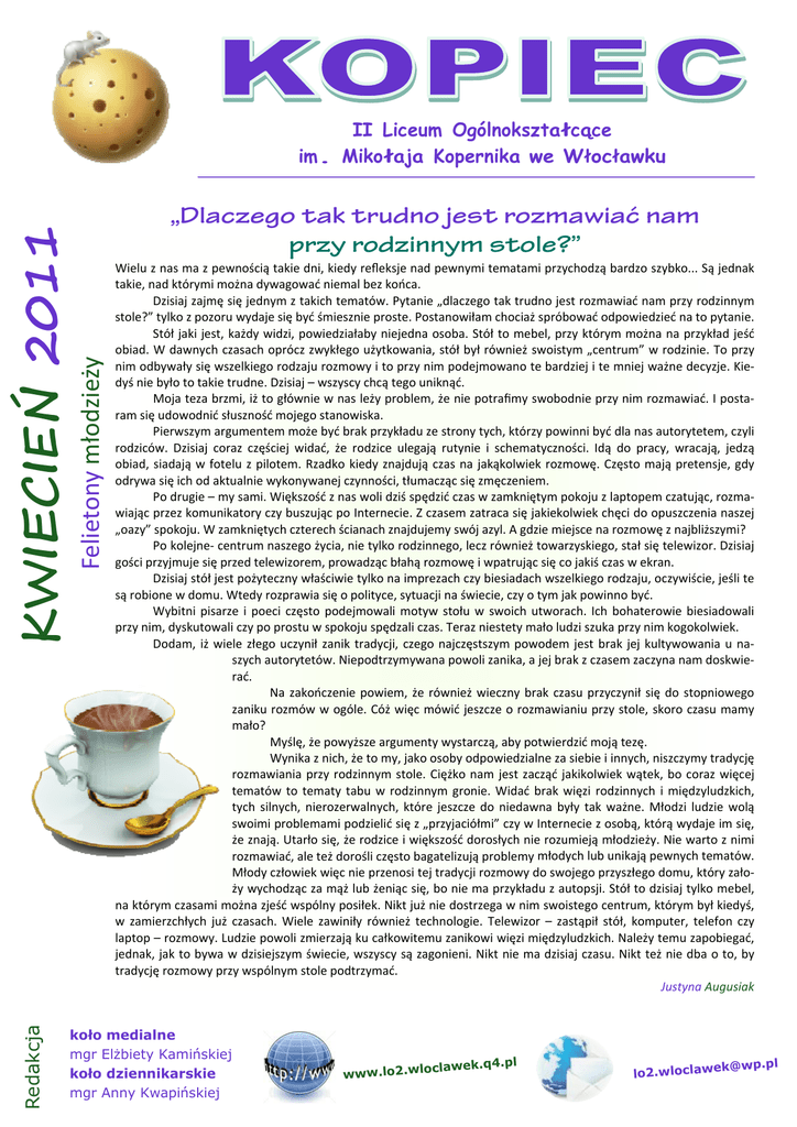 Redakcja Felietony młodzieży KWIECIEŃ 2011 II Liceum Ogólnokształcące im. Mikołaja Kopernika we Włocławku „Dlaczego tak trudno jest rozmawiać nam przy rodzinnym stole?” Wielu z nas ma z pewnością takie dni, kiedy refleksje nad pewnymi tematami przychodzą bardzo szybko... Są jednak takie, nad którymi można dywagować niemal bez końca. Dzisiaj zajmę się jednym z takich tematów. Pytanie „dlaczego tak trudno jest rozmawiać nam przy rodzinnym stole?” tylko z pozoru wydaje się być śmiesznie proste. Postanowiłam chociaż spróbować odpowiedzieć na to pytanie. Stół jaki jest, każdy widzi, powiedziałaby niejedna osoba. Stół to mebel, przy którym można na przykład jeść obiad. W dawnych czasach oprócz zwykłego użytkowania, stół był również swoistym „centrum” w rodzinie. To przy nim odbywały się wszelkiego rodzaju rozmowy i to przy nim podejmowano te bardziej i te mniej ważne decyzje. Kie‐ dyś nie było to takie trudne. Dzisiaj – wszyscy chcą tego uniknąć. Moja teza brzmi, iż to głównie w nas leży problem, że nie potrafimy swobodnie przy nim rozmawiać. I posta‐ ram się udowodnić słuszność mojego stanowiska. Pierwszym argumentem może być brak przykładu ze strony tych, którzy powinni być dla nas autorytetem, czyli rodziców. Dzisiaj coraz częściej widać, że rodzice ulegają rutynie i schematyczności. Idą do pracy, wracają, jedzą obiad, siadają w fotelu z pilotem. Rzadko kiedy znajdują czas na jakąkolwiek rozmowę. Często mają pretensje, gdy odrywa się ich od aktualnie wykonywanej czynności, tłumacząc się zmęczeniem. Po drugie – my sami. Większość z nas woli dziś spędzić czas w zamkniętym pokoju z laptopem czatując, rozma‐ wiając przez komunikatory czy buszując po Internecie. Z czasem zatraca się jakiekolwiek chęci do opuszczenia naszej „oazy” spokoju. W zamkniętych czterech ścianach znajdujemy swój azyl. A gdzie miejsce na rozmowę z najbliższymi? Po kolejne‐ centrum naszego życia, nie tylko rodzinnego, lecz również towarzyskiego, stał się telewizor. Dzisiaj gości przyjmuje się przed telewizorem, prowadząc błahą rozmowę i wpatrując się co jakiś czas w ekran. Dzisiaj stół jest pożyteczny właściwie tylko na imprezach czy biesiadach wszelkiego rodzaju, oczywiście, jeśli te są robione w domu. Wtedy rozprawia się o polityce, sytuacji na świecie, czy o tym jak powinno być. Wybitni pisarze i poeci często podejmowali motyw stołu w swoich utworach. Ich bohaterowie biesiadowali przy nim, dyskutowali czy po prostu w spokoju spędzali czas. Teraz niestety mało ludzi szuka przy nim kogokolwiek. Dodam, iż wiele złego uczynił zanik tradycji, czego najczęstszym powodem jest brak jej kultywowania u na‐ szych autorytetów. Niepodtrzymywana powoli zanika, a jej brak z czasem zaczyna nam doskwie‐ rać. Na zakończenie powiem, że również wieczny brak czasu przyczynił się do stopniowego zaniku rozmów w ogóle. Cóż więc mówić jeszcze o rozmawianiu przy stole, skoro czasu mamy mało? Myślę, że powyższe argumenty wystarczą, aby potwierdzić moją tezę. Wynika z nich, że to my, jako osoby odpowiedzialne za siebie i innych, niszczymy tradycję rozmawiania przy rodzinnym stole. Ciężko nam jest zacząć jakikolwiek wątek, bo coraz więcej tematów to tematy tabu w rodzinnym gronie. Widać brak więzi rodzinnych i międzyludzkich, tych silnych, nierozerwalnych, które jeszcze do niedawna były tak ważne. Młodzi ludzie wolą swoimi problemami podzielić się z „przyjaciółmi” czy w Internecie z osobą, którą wydaje im się, że znają. Utarło się, że rodzice i większość dorosłych nie rozumieją młodzieży. Nie warto z nimi rozmawiać, ale też dorośli często bagatelizują problemy młodych lub unikają pewnych tematów. Młody człowiek więc nie przenosi tej tradycji rozmowy do swojego przyszłego domu, który zało‐ ży wychodząc za mąż lub żeniąc się, bo nie ma przykładu z autopsji. Stół to dzisiaj tylko mebel, na którym czasami można zjeść wspólny posiłek. Nikt już nie dostrzega w nim swoistego centrum, którym był kiedyś, w zamierzchłych już czasach. Wiele zawiniły również technologie. Telewizor – zastąpił stół, komputer, telefon czy laptop – rozmowy. Ludzie powoli zmierzają ku całkowitemu zanikowi więzi międzyludzkich. Należy temu zapobiegać, jednak, jak to bywa w dzisiejszym świecie, wszyscy są zagonieni. Nikt nie ma dzisiaj czasu. Nikt też nie dba o to, by tradycję rozmowy przy wspólnym stole podtrzymać. Justyna Augusiak koło medialne mgr Elżbiety Kamińskiej koło dziennikarskie mgr Anny Kwapińskiej www.lo2.wlo l clawek.q4.p lo2.wloclaw [email protected]