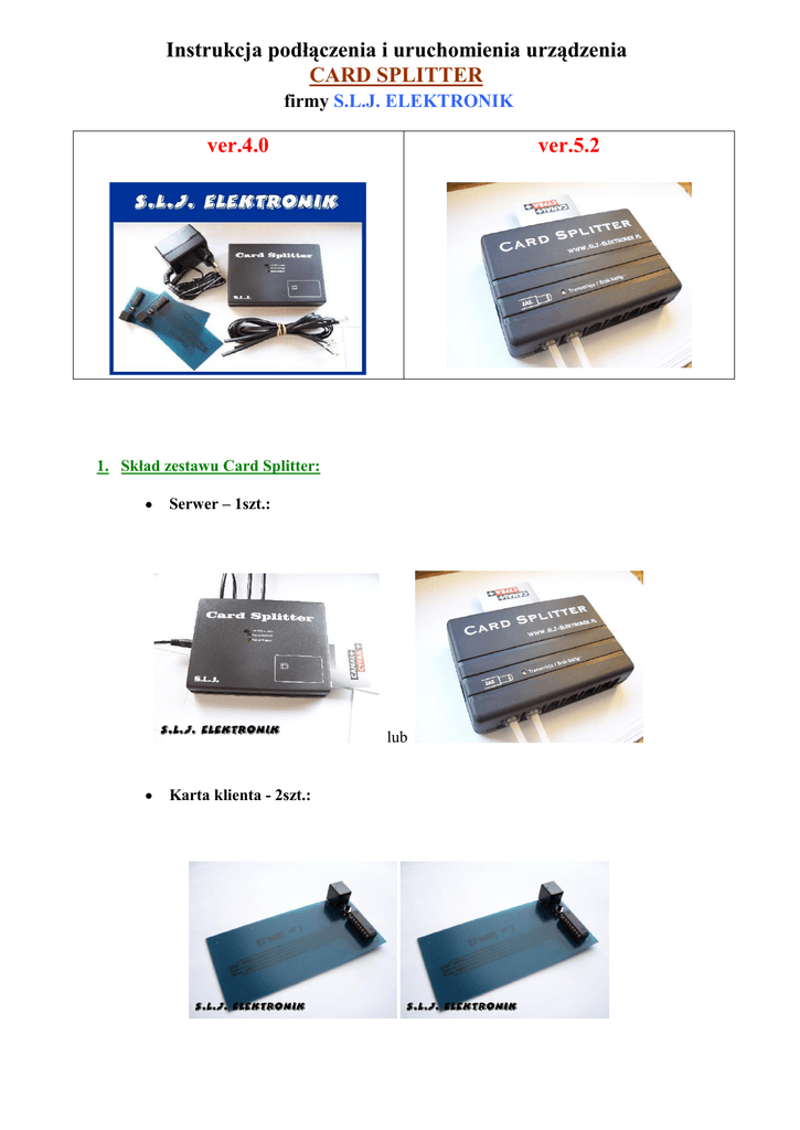 Instrukcja podłączenia i uruchomienia urządzenia CARD SPLITTER firmy S.L.J. ELEKTRONIK ver.4.0 ver.5.2 1. Skład zestawu Card Splitter: · Serwer – 1szt.: lub · Karta klienta - 2szt.: · Kable na wzór - 1szt.: · Zasilacz – 1szt.: 2. Instrukcja podłączenia: Splitter łączy się z kartami klienta za pomocą kabla telefonicznego lub skrętki z zakończonymi wtykami RJ-11. Wzór kabla umieszczony powyżej. Kable można przedłużyć na odległość ok. 30 metrów, przy większych długościach do 150 metrów należy zastosować skrętkę telefoniczną. Można także zrobić kabel samemu, poniżej wzór połączenia: Jedną stronę kabla z wtyczką RJ-11 wkłada się do splittera, a drugą do karty klienta. lub Przy odległości splittera a karty klienta większej niż 20 metrów należy podłączyć kabel w splitterze do jednego z zewnętrznych wyjść.: Uwaga: Niektóre tunery mają gniazdka telefoniczne z tyłu tunera, nie należy podłączać tam kabli od splittera, kable te łączy się wyłącznie z kartami klienta. Inne połączenie spowoduje, iż układ nie będzie działać. Trzeba pamiętać że każdy tuner musi mieć podłączoną swoją antenę satelitarną. Można zastosować jednak jedną antenę ale potrzeba dla podłączenia np. 4 tunerów konwerter z 4 wyjściami tzw. QUAD np. firmy GOLDEN INTERSTAR: WZÓR PODŁĄCZENIA Z ANTENĄ: Przy dwóch tunerach: Przy czterech tunerach: 3. Instrukcja uruchomienia: Do splittera należy podłączyć zasilanie. Do tego celu służy zasilacz zwarty w zestawie. Na poniższym zdjęciu pokazane jest prawidłowe podłączenie zasilacza.: Po podłączeniu zapali się czerwona dioda sygnalizująca zarówno brak karty jak i fakt że splitter jest zasilany. Następnie wkładamy kartę abonencką do splittera: lub Karta obonencka w wersji splittera 5.2 musi być wkładana odwrotnie ( stykami do dołu ). Po włożeniu karty do serwera czerwona dioda przygaśnie lecz nie zgaśnie całkowicie. Gdy tak się stanie jest to znak że karta abonencka prawidłowo jest włożona do splittera. Uruchamianie splittera w wersji 5.2 odbywa się tak samo, jedyną zmianą jest jedna dioda dwókolorowa. Gdy świeci na czerwono to oznacza BRAK KARTY, gdy czerwona dioda przygaśnie po włożeniu karty abonenckiej jest to znak że dobrze została włożona. Gdy świeci na zielono oznacza to transmisję. Następnie wkładamy kartę klienta do tunera. Kartę wkłada się w to miejsce gdzie kartę abonencką. Przed włożeniem karty do tunera należy nacisnąć na ok. 2 sekundy przycisk RESET umieszczony na karcie klienta. W momencie naciśniętego przycisku RESET w serwerze zgaśnie czerwona dioda. Oznacza to iż układ jest resetowany, po jego puszczeniu na splitterze zapali się z powrotem czerwona dioda. Następnie wkładamy kartę do tunera: Po jej włożeniu zacznie mrugać na przemian dioda zielona z czerwoną. I następnie przełączamy program w tunerze. Teraz co ok. 7 sekund będzie zapalać się zielona dioda sygnalizująca transmisję uprawnień, jednocześnie gdy dioda zielona będzie zapalona, czerwona dioda będzie gasnąć. Obraz powinien się już pojawić. Gdyby wystąpiły jakieś zacięcia obrazu należy jak w powyższym opisie wyciągnąć kartę klienta z tunera, następnie nacisnąć przycisk RESET umieszczony na karcie i włożyć kartę ponownie do tunera i następnie przełączyć program.