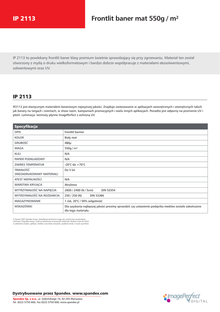 Frontlit baner mat 550g / m² IP 2113 IP 2113 to powlekany frontlit baner klasy premium świetnie sprawdzający się przy zgrzewaniu. Materiał ten został stworzony z myślą o druku wielkoformatowym i bardzo dobrze współpracuje z materiałami ekosolwentowymi, solwentowymi oraz UV. IP 2113 IP2113 jest elastycznym materiałem banerowym najwyższej jakości. Znajduje zastosowanie w aplikacjach wewnętrznych i zewnętrznych takich jak banery na targach i eventach, w show room, kampaniach promocyjnych i wielu innych aplikacjach. Ponadto jest odporny na promienie UV i pleśń. Laminacja: laminaty płynne ImagePerfect z ochroną UV. Specyfikacja Opis Frontlit banner Kolor Biały mat Grubość 480µ Waga 550g / m² Klej N/A Papier podkładowy N/A Zakres temperatur -20°C do +70°C Trwałość (niezadrukowany materiał) Do 5 lat Atest niepalności N/A Warstwa kryjąca Akrylowa Wytrzymałość na napięcia 2600 / 2400 (N / 5cm) Wytrzymałość na rozdarcia 250 / 250 (N) Magazynowanie 1 rok, 20°C / 50% wilgotność Wskazówki Dla uzyskania najlepszej jakości prosimy sprawdzić czy ustawienie podajnika mediów zostało zakończone dla tego materiału DIN 53354 DIN 53386 © Styczeń 2007 Spandex Group. Specyfikacje techniczne mogą ulec zmianie bez wcześniejszej informacji. Wszystkie nazwy i znaki są własnością ich prawnych właścicieli. Wydruk może się różnić w zależności od pliku, aplikacji, mediów, warunków otoczenia, prędkości druku i innych czynników Dystrybuowane przez Spandex. www.spandex.com Spandex Sp. z o.o., ul. Gidzińskiego 10, 02-293 Warszawa Tel. (022) 5750 666, Fax (022) 5750 600; www.spandex.pl