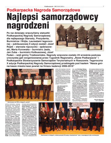 Podkarpacie p i 39/29-09-2010 39/ 9/29-09-2010 r. 7 Podkarpacka Nagroda Samorządowa Najlepsi j p samorządowcy nagrodzeni Po raz dziesiąty wręczyliśmy statuetki Podkarpackiej Nagrody Samorządowej dla najlepszego Starosty, Prezydenta, Burmistrza i Wójta. Laureatami tegorocznej – jubileuszowej X edycji zostali: Józef Rojek – starosta ropczycko - sędziszowski, Maria Kurowska – burmistrz Jasła, Jan Zuba – burmistrz Kolbuszowej, Józef Fedan – wójt gminy Trzebownisko. Nagrody wręczone zostały 23 września podczas uroczystej gali zorganizowanej przez Tygodnik Regionalny „Nowe Podkarpacie” i Podkarpackie Stowarzyszenie Samorządów Terytorialnych w Rzeszowie. Tegoroczna X edycja Podkarpackiej Nagrody Samorządowej przebiegała pod hasłem “Nasza gmina/nasze miasto/nasz powiat na finiszu kadencji 2006-2010” grody Samorządowej otrzymali pamiątkowe statuetki oraz po 10 tysięcy y ę y złotych y od Wojewódzkiego j g Funduszu Ochrony Środowiska i Gospodarki Wodnej w Rzeszowie dla samorządów przez nich kierowanych. Podkarpacka Nagroda Samorządowa odbywała się pod honorowym patronatem Prezydenta RP. Decyzja o przyjęciu honorowego patronatu i ufundowaniu dla laureatów pamiątkowych piór została podjęta 10 marca 2010 r. Lider Samorządności, najlepsze strony internetowe, najpopularniejsi samorządowcy Kapituła Podkarpackiej Nagrody Samorządowej przyznała jednostkom samorządowym, które przez trzy kolejne edycje konkursu były nominowane do wyróżnienia statuetką nagrody, honorowe wyróżnienia – dyplom Lider Samorządności w Województwie Podkarpackim. Otrzymali je w tym roku: wójt Stanisław Rokosz gmina Dębica, wójt Zbigniew Sawiński - gmina Solina, prezydent Piotr Przytocki - miasto Krosno, prezydent Tadeusz Ferenc - miasto Rzeszów, starosta Władysław Bielawa - powiat dębicki, starosta Józef Michalik - powiat lubaczowski. Wyróżniono również najlepsze strony internetowe. Profesjonalne jury w składzie: Ryszard Rzym – przewodniczący, prezes ZETO Rzeszów, Jan Jarosz – Urząd Marszałkowski w Rzeszowie, Paweł Jaworski – Podkarpacki Urząd Wojewódzki, Mirosław Zięba – ZETO Rzeszów, najwyżej oceniło strony internetowe Starostwa Powiatowego w Strzyżowie, Urzędu Miasta i Gminy w Lesku i Urzędu Gminy w Łańcucie. Natomiast internauci najwyżej ocenili strony internetowe: Starostwa Powiatowego w Nisku, Urzędu Miasta i Gminy w Lesku, Urzędu Gminy w Miejscu Piastowym. Również w tegorocznej edycji PNS mieszkańcy Podkarpacia mogli wybrać Najpopularniejszego Samorządowca Społeczności Podkarpackiej. Ten tytuł otrzymali: Józef Michalik k – starosta lubaczowski, Janusz Chodorowski – prezydent Mielca, Jacek Sołek k – burmistrz miasta i gminy Kańczuga, Zbigniew Sawiński – wójt gminy Solina. Uroczystości w Rzeszowie były również okazją do nagrodzenia najzdolniejszej młodzieży na Podkarpaciu. Wyróżniono po jednym uczniu z każdego powiatu i miast grodzkich na prawach powiatu. Lesław Wais podsumował VII Podkarpackie Forum Lokalnej Prasy Samorządowej. Podczas gali wyróżniono siedem czasopism: „Głos Tyczyna”, „Gazeta Łańcucka” „Gazeta Bieszczadzka”, „Waga i miecz”, „Dukla pl”, „Kurier Błażowski”, „Wiadomości Brzozowskie”. Uroczystość prowadził Marcin Pawlak k z Telewizji Rzeszów. Na scenie wspaniale zaprezentowali się uczniowie Zespołu Szkół Muzycznych im. W. Kilara w Rzeszowie. tekst M. Miśkiewicz fot. A. Józefczyk Nominowani do PNS w kategorii „powiat” ochrony środowiska i edukacji ekologicznej, przynależność do regionalnych oraz ogólnopolskich związków, stowarzyszeń i organizacji społecznych, udział w regionalnych, ogólnopolskich i międzynarodowych konkursach oraz rankingach dla jednostek samorządu terytorialnego. Kapituła na posiedzeniu w dniu 23 września br., w skład której wchodzili: Zdzisław Gawlik k – przewodniczący X edycji PNS, wiceminister skarbu państwa, Kazimierz Barczyk – przewodniczący Związku Gmin i Powiatów Polskich, Andrzej Czajka – prezes zarządu ZTS Gamrat S.A., Jarosław Gawlik – prezes Polskiego Radia Rzeszów, Jan Jarosz – zastępca dyrektora Departamentu Organizacyjnego Urzędu Marszałkowskiego w Rzeszowie, Marek Kot – doradca wojewody podkarpackiego, Zygmunt Nowak – dyrektor Podkarpackiego Stowarzyszenia Samorządów Terytorialnych w Rzeszowie, Stanisław Ożóg – poseł na Sejm RP, Robert Perlak – prezes Wojewódzkiego Funduszu Ochrony Środowiska i Gospodarki Wodnej w Rzeszowie, Henryk Pietrzak – główny specjalista TVP Rzeszów, Ryszard Rzym – prezes ZETO Rzeszów, Stanisław Telesz – zastępca ęp dyrektora Wydziału Środowiska i Rolnictwa Podkarpackiego Urzędu Wojewódzkiego, Wojciech Trzaska – zastępca dyrektora gabinetu marszałka województwa podkarpackiego, Tadeusz Więcek – prezes zarządu Tygodnika Regionalnego „Nowe Podkarpacie”, Ewa Zgłobicka a - dyrektor departamentu sprzedaży Podkarpackiego Banku Spółdzielczego w Sanoku dokonała wyboru laureatów Podkarpackiej Nagrody Samorządowej za 2009 rok. W kategorii „Powiat” laureatem został powiat ropczycko - sędziszowski – starosta Józef Rojek; w kategorii „Miasta duże” – miasto Jasło – burmistrz Maria Kurowska; w kategorii „Miasta małe” – miasto Kolbuszowa – burmistrz Jan Zuba; w kategorii „Gmina” – gmina Trzebownisko – wójt Józef Fedan. Laureaci Podkarpackiej Na- Nominowani w kategorii „miasta powyżej 35 tysięcy mieszkańców” wraz z wręczającymi akty nominacyjne