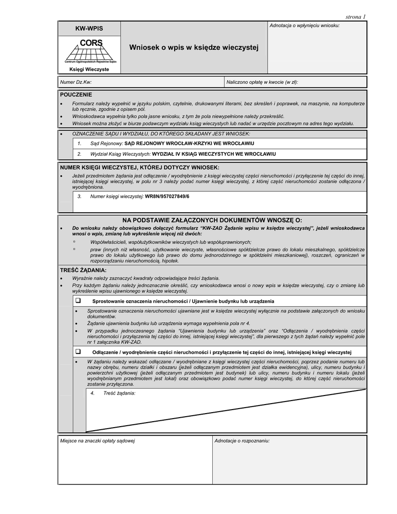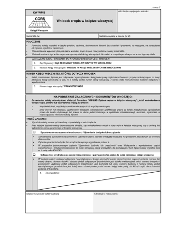 strona 1 Adnotacja o wpłynięciu wniosku: KW-WPIS CORS Wniosek o wpis w księdze wieczystej Centrum Ogólnopolskich Rejestrów Sądowych Księgi Wieczyste Numer Dz.Kw: Naliczono opłatę w kwocie (w zł): POUCZENIE Formularz należy wypełnić w języku polskim, czytelnie, drukowanymi literami, bez skreśleń i poprawek, na maszynie, na komputerze lub ręcznie, zgodnie z opisem pól. Wnioskodawca wypełnia tylko pola jasne wniosku, z tym że pola niewypełnione należy przekreślić. Wniosek można złożyć w biurze podawczym wydziału ksiąg wieczystych lub nadać w urzędzie pocztowym na adres tego wydziału. OZNACZENIE SĄDU I WYDZIAŁU, DO KTÓREGO SKŁADANY JEST WNIOSEK: 1. Sąd Rejonowy: SĄD REJONOWY WROCŁAW-KRZYKI WE WROCŁAWIU 2. Wydział Ksiąg Wieczystych: WYDZIAŁ IV KSIĄG WIECZYSTYCH WE WROCŁAWIU NUMER KSIĘGI WIECZYSTEJ, KTÓREJ DOTYCZY WNIOSEK: Jeżeli przedmiotem żądania jest odłączenie / wyodrębnienie z księgi wieczystej części nieruchomości i przyłączenie tej części do innej, istniejącej księgi wieczystej, w polu nr 3 należy podać numer księgi wieczystej, z której część nieruchomości zostanie odłączona / wyodrębniona. 3. Numer księgi wieczystej: WR8N/957027849/6 NA PODSTAWIE ZAŁĄCZONYCH DOKUMENTÓW WNOSZĘ O: Do wniosku należy obowiązkowo dołączyć formularz “KW-ZAD Żądanie wpisu w księdze wieczystej”, jeżeli wnioskodawca wnosi o wpis, zmianę lub wykreślenie więcej niż dwóch: ▫ ▫ Współwłaścicieli, współużytkowników wieczystych lub współuprawnionych; praw (innych niż własność, użytkowanie wieczyste, własnościowe spółdzielcze prawo do lokalu mieszkalnego, spółdzielcze prawo do lokalu użytkowego lub prawo do domu jednorodzinnego w spółdzielni mieszkaniowej), roszczeń, ograniczeń w rozporządzaniu nieruchomością, hipotek. TREŚĆ ŻĄDANIA: Wyraźnie należy zaznaczyć kwadraty odpowiadające treści żądania. Przy każdym żądaniu należy jednoznacznie określić, czy wnioskodawca wnosi o nowy wpis w księdze wieczystej, czy o zmianę lub wykreślenie wpisu ujawnionego w księdze wieczystej. Sprostowanie oznaczenia nieruchomości / Ujawnienie budynku lub urządzenia Sprostowanie oznaczenia nieruchomości ujawniane jest w księdze wieczystej wyłącznie na podstawie załączonych do wniosku dokumentów. Żądanie ujawnienia budynku lub urządzenia wymaga wypełnienia pola nr 4. W przypadku jednoczesnego żądania “Ujawnienia budynku lub urządzenia” oraz “Odłączenia / wyodrębnienia części nieruchomości i przyłączenia tej części do innej, istniejącej księgi wieczystej”, dla pierwszego z tych żądań należy wypełnić pole nr 1 załącznika KW-ZAD. Odłączenie / wyodrębnienie części nieruchomości i przyłączenie tej części do innej, istniejącej księgi wieczystej W żądaniu należy wskazać odłączane / wyodrębniane z księgi wieczystej części nieruchomości, poprzez podanie numeru lub nazwy obrębu, numeru działki i obszaru (jeżeli odłączanym przedmiotem jest działka ewidencyjna), ulicy, numeru budynku i powierzchni użytkowej (jeżeli odłączanym przedmiotem jest budynek) lub ulicy, numeru budynku i numeru lokalu (jeżeli wyodrębnianym przedmiotem jest lokal) oraz obowiązkowo podać numer księgi wieczystej, do której część nieruchomości zostanie przyłączona. 4. Treść żądania: Miejsce na znaczki opłaty sądowej Adnotacje o rozpoznaniu: strona 2 NA PODSTAWIE ZAŁĄCZONYCH DOKUMENTÓW WNOSZĘ O (c.d.): Wpis właściciela (współwłaściciela), użytkownika wieczystego (współużytkownika wieczystego), uprawnionego (współuprawnionego): W żądaniu powinno się w szczególności określić rodzaj przysługującego prawa, wpisać imię i nazwisko lub nazwę / firmę i siedzibę oraz określić wielkość przysługującego udziału w prawie. Jeżeli wnioskodawca żąda ujawnienia w księdze wieczystej kilku współwłaścicieli nieruchomości, współużytkowników wieczystych lub współuprawnionych z tytułu własnościowego spółdzielczego prawa do lokalu mieszkalnego, spółdzielczego prawa do lokalu użytkowego lub prawa do domu jednorodzinnego w spółdzielni mieszkaniowej, każdego z nich należy wskazać w osobnej rubryce. W jednej rubryce należy wskazać współmałżonków, którym przysługuje dane prawo na zasadzie wspólności ustawowej lub umownej małżeńskiej oraz spółki jawne i wspólników spółek cywilnych, którym przysługuje dane prawo na zasadzie współwłasności łącznej. 5. Wartość przedmiotu żądań (w zł): 6. Treść żądania: 7. Treść żądania: X Wpis prawa, ograniczenia w rozporządzaniu nieruchomością, roszczenia lub hipoteki: W żądaniu należy w szczególności określić rodzaj i treść hipoteki lub innego prawa, roszczenia lub ograniczenia, a także uprawnionych. W przypadku hipoteki łącznej lub innego prawa, roszczenia lub ograniczenia, które ma być wpisane w więcej niż jednej księdze wieczystej, należy obowiązkowo podać numery wszystkich ksiąg wieczystych, w których prawo, roszczenie lub ograniczenie ma być wpisane. Treść każdego żądania oraz wartość przedmiotu tego żądania należy wpisać w osobnej rubryce. 8. Treść żądania: W oparciu o umowę kredytową nr 095683795/10 z dnia 09.09.2010 r. oraz oświadczenie o ustanowieniu hipoteki z dnia 10.09.2010 r., wnoszę o ustanowienie hipoteki w wysokości 300 000,00 PLN (słownie: trzysta tysięcy złotych) na nieruchomości o numerze księgi wieczystej WR8N/957027849/6, na rzecz Banku ANX S.A. 9. Wartość przedmiotu żądania (w zł): 300 000,00 PLN (słownie: trzysta tysięcy złotych) 10. Treść żądania: 11. Wartość przedmiotu żądania (w zł): strona 3 WNIOSKODAWCY / UCZESTNICY POSTĘPOWANIA: Jeżeli wnioskodawca / uczestnik postępowania jest osobą fizyczną, odpowiednio w polu nr 12, 33, 54 należy podać numer PESEL, a w pozostałych przypadkach odpowiednio w polu nr 13, 34, 55 należy podać nume