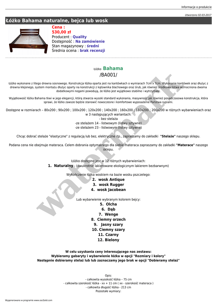 Informacje o produkcie Utworzono 02-03-2017 Łóżko Bahama naturalne, bejca lub wosk Cena : 530,00 zł Producent : Quality Dostępność : Na zamówienie Stan magazynowy : średni Średnia ocena : brak recenzji Bahama /BA001/ Łóżko er m ar k Łóżko wykonane z litego drewna sosnowego. Konstrukcja łóżka oparta jest na kantówkach o wymiarach 7cm x 7cm. Wykonanie kantówek oraz dłużyc z drewna klejonego, system montażu dłużyc oparty na konstrukcji z kątownika blachowego oraz śrub, jak również środkowa listwa wzmocniona dwoma dodatkowymi nogami powodują, że łóżko jest wyjątkowo stabilne i wytrzymałe. Wyjątkowość łóżka Bahama tkwi w jego elegancji, którą stwarza wysoki standard wykonania, masywność jak również ponadczasowa konstrukcja, która sprawi, że łóżko zawsze będzie stanowić nowoczesne i komfortowe wyposażenie Państwa sypialni. Dostępne w rozmiarach – 80x200 ; 90x200 ; 100x200 ; 120x200 ; 140x200 ; 160x200 ; 180x200 ; 200x200 w różnych wybarwieniach oraz w 3 następujących wariantach: - bez stelaża -ze stelażem 14 - listwowym (listwy sztywne) -ze stelażem 23 - listwowym (listwy sztywne) Chcąc dobrać stelaże "elastyczne" z regulacją lub bez, elektryczne itp., zapraszamy do zakładki "Stelaże" naszego sklepu. Podana cena nie obejmuje materaca. Celem dobrania optymalnego dla siebie materaca zapraszamy do zakładki "Materace" naszego sklepu. Łóżko dostępne jest w 12 różnych wybarwieniach: 1. Naturalny - (dwukrotnie lakierowane ekologicznym lakierem bezbarwnym) at Wykończenie łóżka woskiem na bazie wosku pszczelego: 2. wosk Antique 3. wosk Rugger 4. wosk Jacobean w Lub wybarwienie wybranym kolorem bejcy: 5. Olcha 6. Dąb 7. Wenge 8. Ciemny orzech 9. Jasny szary 10. Ciemny szary 11. Czarny 12. Bielony W celu uzyskania ceny interesującego nas zestawu: Wybieramy gabaryty i wybarwienie łóżka w opcji "Rozmiary i kolory" Następnie dobieramy stelaż lub lub zaznaczamy jego brak w opcji "Dobieramy stelaż" Opis: - całkowita wysokość łóżka – 75 cm - całkowita szerokość łóżka - xx + 11 cm ( xx - szerokość materaca ) - całkowita długość łóżka - 213 cm Pozostałe wymiary: Wygenerowano w programie www.oscGold.com - wymiary kantówki: 7 cm x 7 cm - szerokość dłużyc: 18 cm - szerokość dwóch górnych desek szczytu: 14 cm Łóżko może być wyposażone w szufladę dostępną w naszej ofercie. Łóżko wysyłane jest w częściach, bezpiecznie pakowane, co chroni produkt przed uszkodzeniami mechanicznymi w trakcie transportu. Do łóżka dołączona jest instrukcja montażu, oraz wszystkie potrzebne elementy (śruby, kluczyk). Montaż łóżka jest bardzo prosty zajmuje ok. 10 minut. Do ceny należy doliczyć koszt transportu 55 zł (do rozmiaru 100x200 włącznie), lub 90 zł (powyżej rozmiaru 100x200). TERMIN REALIZACJI ZAMÓWIENIA TO 3 - 4 TYGODNIE. er m ar k PRZY ZAMÓWIENIU PROSZĘ PODAĆ: - WYBRANY ROZMIAR ŁÓŻKA - WYBRANY KOLOR ŁÓŻKA - WYBRANY WARIANT - BEZ STELAŻA, STELAŻ 14-LISTWOWY LUB 23-LISTWOWY Dostępne opcje Łóżko Bahama naturalne, bejca lub wosk » Wybieramy rozmiar i kolor: 80x200 kolory od 1. do 12., 90x200 kolory od 1. do 12. (+35,00 zł), 100x200 kolory od 1. do 12. w at (+73,00 zł), 120x200 kolory od 1. do 12. (+186,00 zł), 140x200 kolory od 1. do 12. (+265,00 zł), 160x200 kolory od 1. do 12. (+345,00 zł), 180x200 kolory od 1. do 12. (+424,00 zł), 200x200 kolory od 1. do 12. (+503,00 zł). » Dobieramy stelaż: Bez stelaża, 80x200 stel. 14-list. (+41,00 zł), 80x200 stel. 23-list. (+74,00 zł), 90x200 stel. 14-list. (+47,00 zł), 90x200 stel. 23-list. (+76,00 zł), 100x200 stel. 14-list. (+53,00 zł), 100x200 stel. 23-list. (+86,00 zł), 120x200 stel. 14-list. (+62,00 zł), 120x200 stel. 23-list. (+102,00 zł), 140x200 stel. 14-list. (+74,00 zł), 140x200 stel. 23-list. (+120,00 zł), 160x200 stel. 14-list. (+84,00 zł), 160x200 stel. 23-list. (+138,00 zł), 180x200 stel. 14-list. (+95,00 zł), 180x200 stel. 23-list. (+153,00 zł), 200x200 stel. 14-list. (+105,00 zł), 200x200 stel. 23-list. (+170,00 zł). » Dostępne kolory: 1. Naturalny, 2. wosk Antique, 3. wosk Rugger, 4. wosk Jacobean, 5. Olcha, 6. Dąb, 7. Wenge, 8. Ciemny orzech, 9. Jasny szary, 10. Ciemny szary, 11. Czarny, 12. Bielony.