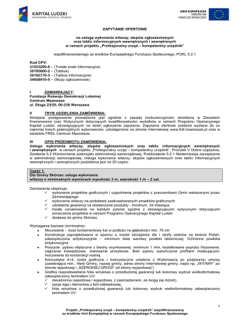 ZAPYTANIE OFERTOWE na usługę wykonania witaczy, słupów ogłoszeniowych oraz tablic informacyjnych wewnętrznych i zewnętrznych w ramach projektu „Profesjonalny urząd – kompetentny urzędnik” współfinansowanego ze środków Europejskiego Funduszu Społecznego, POKL 5.2.1 Kod CPV: 31523200-0 – (Trwałe znaki informacyjne) 30195000-2 – (Tablice) 30192170-3 – (Tablice informacyjne) 34928410-5 – (Słupy ogłoszeniowe) I ZAMAWIAJĄCY: Fundacja Rozwoju Demokracji Lokalnej Centrum Mazowsze ul. Długa 23/25, 00-238 Warszawa II TRYB UDZIELENIA ZAMÓWIENIA: Niniejsze postępowanie prowadzone jest zgodnie z zasadą konkurencyjności określoną w Zasadach finansowania oraz Wytycznych dotyczących kwalifikowalności wydatków w ramach Programu Operacyjnego Kapitał Ludzki, obowiązujących na dzień ogłoszenie zapytania. Zapytanie ofertowe zostanie wysłane do co najmniej trzech potencjalnych wykonawców, udostępnione na stronie internetowej www.frdl.mazowsze.pl oraz w siedzibie FRDL Centrum Mazowsze. III OPIS PRZEDMIOTU ZAMÓWIENIA: Usługa wykonania witaczy, słupów ogłoszeniowych oraz tablic informacyjnych wewnętrznych i zewnętrznych w ramach projektu „Profesjonalny urząd – kompetentny urzędnik”, Priorytet V Dobre rządzenie, Działanie 5.2 Wzmocnienie potencjału administracji samorządowej. Poddziałanie 5.2.1 Modernizacja zarządzania w administracji samorządowej. Usługa wykonania witaczy, słupów ogłoszeniowych oraz tablic informacyjnych wewnętrznych i zewnętrznych podzielona jest na 20 części. Część 1. Dla Gminy Skórzec usługa wykonania: witaczy o minimalnych wymiarach wysokość 3 m, szerokość 1 m – 2 szt. Zamówienie obejmuje: wykonanie projektów graficznych i uzgodnienie projektów z pracownikami Gmin wskazanymi przez Zamawiającego wykonanie witaczy na podstawie zaakceptowanych projektów graficznych udzielenie gwarancji na dostarczone produkty - minimum 24 miesiące trwałe oznakowanie na każdym pylonie zgodne z obowiązującymi wytycznymi dotyczącymi oznaczania projektów w ramach Programu Operacyjnego Kapitał Ludzki dostawa do gminy Skórzec. Wymagania bazowe (minimalne): Mocowanie - kosz fundamentowy lub w podłożu na głębokości min. 70 cm Konstrukcja zaprojektowana w oparciu o model obciążenia dla I strefy wiatrów na terenie Polski, zabezpieczona antykorozyjnie – minimum dwie warstwy powłoki lakierniczej. Ochronna powłoka antykorozyjna Poszycie pylonu eliptyczne z blachy ocynkowanej minimum 1 mm, kształtowane poprzez frezowanie, zaginanie krawędziowe, malowanie proszkowe. Boki pylonu wykończone profilami maskującymi, mocowania do konstrukcji nośnej. Kolorystyka 4+4, szata graficzna i kolorystyczna ustalana z Wykonawcą po podpisaniu umowy (zawierająca min.: Herb Gminy, nazwę gminy, adres strony internetowej gminy, napis np. „WITAMY” po stronie wjazdowej i „SZEROKIEJ DROGI” od strony wyjazdowej”) Grafika niepodświetlana folia winylowa o przedłużonej gwarancji lub kolorowy wydruk wielkoformatowy zabezpieczony laminatem UV: dwustronna (wjazdowa i wyjazdowa, z zastrzeżeniem, ze mogą się różnić), opcja logo i liternictwa z folii odblaskowej, folia winylowa o przedłużonej gwarancji lub kolorowy wydruk wielkoformatowy zabezpieczony laminatem UV. 1 Projekt „Profesjonalny urząd – kompetentny urzędnik” współfinansowany ze środków Unii Europejskiej w ramach Europejskiego Funduszu Społecznego Część 2. Dla Gminy Skórzec usługa wykonania: słupów ogłoszeniowych wg poniższej specyfikacji - 2 szt. Zamówienie obejmuje: wykonanie projektów graficznych i uzgodnienie projektów z pracownikami Gmin wskazanymi przez Zamawiającego wykonanie słupów ogłoszeniowych z gzymsami na podstawie zaakceptowanych projektów graficznych trwałe oznakowanie na każdym poniżej wskazanym produkcie, zgodne z obowiązującymi wytycznymi dotyczącymi oznaczania projektów w ramach Programu Operacyjnego Kapitał Ludzki udzielenie gwarancji na dostarczone produkty - minimum 24 miesiące dostawa do gminy Skórzec. Wymagania bazowe: wykonany z wysokogatunkowego gładkiego żelbetonu o wysokiej przyczepności. ciężar 1800 kg, grubość ściany 10 cm, słup ogłoszeniowy o średnicy 1000 mm, wysokość 2500 mm, plus zadaszenie 600 m 2 7,5 m² -10 m powierzchni reklamowej, kołnierz gzymsu montowany pod zadaszeniem, z herbem i nazwą miejscowości. Gzyms pod zadaszeniem w kolorze białym o wys. 30 cm, zakończenie słupa zadaszeniem, Zadaszenie wykonane z żywic epoksydowych zbrojone włóknem szklanym. Kolor zadaszenia i wykończenia do ustalenia z Zamawiającym. Część 3 Dla Gminy Stoczek usługa wykonania: witaczy o minimalnych wymiarach wysokość 4 m, szerokość 1,2 m, wg poniższej specyfikacji - 5 szt. Zamówienie obejmuje: wykonanie projektów graficznych i uzgodnienie projektów z pracownikami Gmin wskazanymi przez Zamawiającego wykonanie witaczy na podstawie zaakceptowanych projektów graficznych udzielenie gwarancji na dostarczone produkty - minimum 24 miesiące trwałe oznakowanie na każdym pylonie zgodne z obowiązującymi wytycznymi dotyczącymi oznaczania projektów w ramach Programu Operacyjnego Kapitał Ludzki dostawa do gminy Stoczek. Wymagania bazowe: Mocowanie - kosz fundamentowy lub w podłożu na głębokości min. 70 cm Konstrukcja zaprojektowana w oparciu o model obciążenia dla I strefy wiatrów na terenie Polski, zabezpieczona antykorozyjnie – minimum 2 warstwa powłoka lakiernicza. Ochrona powłoka antykorozyjną. Poszycie pylonu eliptyczne z blachy ocynkowanej minimum 1 mm, kształtowane poprzez frezowanie, zaginanie krawędziowe, malowanie proszkowe. Boki pylonu wykończone profilami maskującymi, mocowania do konstrukcji nośnej. Kolorystyka 4+4, szata graficzna i kolorystyczna ustalana z Wykonawcą po podpisaniu umowy (zawierająca min.: Herb Gminy, nazwę gminy, adres strony internetowej gminy, napis np. „WITAMY” po stronie wjazdowej i „SZEROKIEJ DROGI” od stro