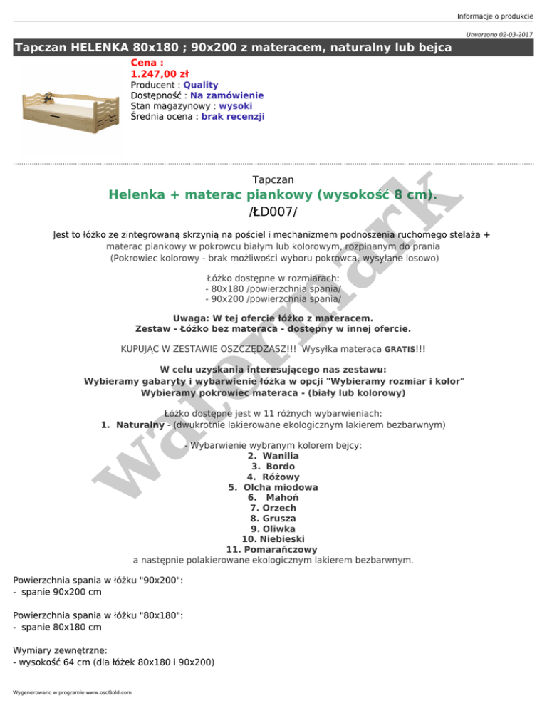 Informacje o produkcie Utworzono 02-03-2017 Tapczan HELENKA 80x180 ; 90x200 z materacem, naturalny lub bejca Cena : 1.247,00 zł Producent : Quality Dostępność : Na zamówienie Stan magazynowy : wysoki Średnia ocena : brak recenzji Tapczan er m ar k Helenka + materac piankowy (wysokość 8 cm). /ŁD007/ Jest to łóżko ze zintegrowaną skrzynią na pościel i mechanizmem podnoszenia ruchomego stelaża + materac piankowy w pokrowcu białym lub kolorowym, rozpinanym do prania (Pokrowiec kolorowy - brak możliwości wyboru pokrowca, wysyłane losowo) Łóżko dostępne w rozmiarach: - 80x180 /powierzchnia spania/ - 90x200 /powierzchnia spania/ Uwaga: W tej ofercie łóżko z materacem. Zestaw - Łóżko bez materaca - dostępny w innej ofercie. KUPUJĄC W ZESTAWIE OSZCZĘDZASZ!!! Wysyłka materaca GRATIS!!! at W celu uzyskania interesującego nas zestawu: Wybieramy gabaryty i wybarwienie łóżka w opcji "Wybieramy rozmiar i kolor" Wybieramy pokrowiec materaca - (biały lub kolorowy) Łóżko dostępne jest w 11 różnych wybarwieniach: 1. Naturalny - (dwukrotnie lakierowane ekologicznym lakierem bezbarwnym) w - Wybarwienie wybranym kolorem bejcy: 2. Wanilia 3. Bordo 4. Różowy 5. Olcha miodowa 6. Mahoń 7. Orzech 8. Grusza 9. Oliwka 10. Niebieski 11. Pomarańczowy a następnie polakierowane ekologicznym lakierem bezbarwnym. Powierzchnia spania w łóżku "90x200": - spanie 90x200 cm Powierzchnia spania w łóżku "80x180": - spanie 80x180 cm Wymiary zewnętrzne: - wysokość 64 cm (dla łóżek 80x180 i 90x200) Wygenerowano w programie www.oscGold.com - szerokość 97 cm (dla łóżka 90x200) - długość 210 cm (dla łóżka 90x200) - szerokość 87 cm (dla łóżka 80x180) - długość 190 cm (dla łóżka 80x180) TERMIN REALIZACJI ZAMÓWIENIA TO 3 - 4 TYGODNIE. ● ● ● ● ● ● ● ● w całości z litego drewna wysoki standard wykonania wytrzymałe stabilne funkcjonalne nie uczulające - lakiery na bazie wody, nie powodujące alergii ciekawa kolorystyka atrakcyjny wygląd er m ar k UWAGA: PRZY ZAMÓWIENIU 1 SZT NALEŻY DOLICZYĆ 90,00 ZŁ - KOSZT WYSYŁKI ŁÓŻKA KURIEREM, PRZY WIĘKSZYCH ILOŚCIACH KOSZT TRANSPORTU JEST OBLICZANY INDYWIDUALNIE. ( WYSYŁKA MATERACA - GRATIS ). PRZY ZAMÓWIENIU PROSZĘ PODAĆ: - WYBRANY ROZMIAR ŁÓŻKA (W TEJ OFERCIE ŁÓŻKO WRAZ Z MATERACEM PIANKOWYM WYSOKOŚCI 8 CM). WYBRANY POKROWIEC MATERACA (BIAŁY LUB KOLOROWY) - WYBRANY KOLOR ŁÓŻKA Dostępne opcje Tapczan HELENKA 80x180 ; 90x200 z materacem, naturalny lub bejca » Wybieramy rozmiar i kolor: 80x180 kolor: 1. Naturalny, 80x200 - kolory od 2. do 11. (+108,00 zł), 90x200 kolor: 1. Naturalny w at (+61,00 zł), 90x200 kolory od 2. do 11. (+176,00 zł). » Wybieramy pokrowiec materaca: 1. Biały, 2. Kolorowy. » Dostępne kolory: 1. Naturalny, 2. Wanilia, 3. Bordo, 4. Różowy, 5. Olcha miodowa, 6. Mahoń, 7. Orzech, 8. Grusza, 9. Oliwka, 10. Niebieski, 11. Pomarańczowy.
