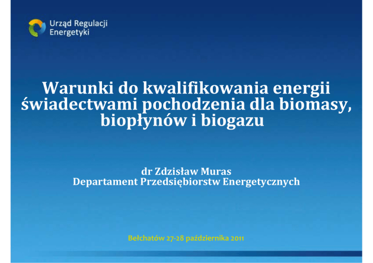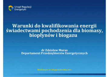 Warunki do kwalifikowania energii świadectwami pochodzenia dla biomasy, biopłynów i biogazu dr Zdzisław Muras Departament Przedsiębiorstw Energetycznych Bełchatów 27‐28 października 2011 Zawartość prezentacji 1. Podstawy prawne 2. Definicja i rodzaje biomasy na cele energetyczne 3. Wytwarzanie energii z odpadów komunalnych 4. Rodzaje kolorów 2 Podstawowe dokumenty prawne z Ustawa - Prawo energetyczne – z dnia 10 kwietnia 1997 r. ¾Ustawa z dnia 8 stycznia 2010 r. – o zmianie ustawy Prawo energetyczne oraz o zmianie niektórych innych ustaw (Dz. U. z 2010 r. Nr 21 poz. 104); ¾Ustawa z dnia 19 sierpnia 2011 r. o zamianie ustawy Prawo energetyczne (Dz. U. Nr 205 poz. 1208) • Ustawa o odpadach - z dnia 27 kwietnia 2001 r. (Dz.U.10.185.1243 j.t.) 3 Podstawowe dokumenty prawne • Rozporządzenie Ministra Gospodarki z dnia 14 sierpnia 2008 r. w sprawie szczegółowego zakresu obowiązków uzyskania i przedstawienia do umorzenia świadectw pochodzenia, uiszczenia opłatyzastępczej, zakupu energii elektrycznej i ciepła wytworzonych w odnawialnych źródłach energii oraz obowiązku potwierdzania danych dotyczących ilości energii elektrycznej wytworzonej w odnawialnym źródle energii (Dz. U. z 2008 r. Nr 156, poz. 969) • Projekt rozporządzenia Ministra Gospodarki z dnia 17 lutego 2011 r. 4 Projekt rozporządzenia Ministra Gospodarki z dnia 17 lutego 2011 r. (1) • Wprowadzenie definicji: ¾ paliwa pomocniczego, ¾ drewna pełnowartościowego, ¾ kotła. • Określenie zakresu obowiązku dla wszystkich podmiotów, •Zmiana progów procentowych dla współspalaczy, hybryd i biomasowców. •Wyjątki dla hybryd i biomasowców – oddanie do użytku, przebudowa, w tym część jednostki będąca kotłem – 31.12.2015 r. 5 Projekt rozporządzenia Ministra Gospodarki z dnia 17 lutego 2010 r. (2) •Brak zaliczenia do OZE energii wytwarzanej z drewna pełnowartościowego, •Zmian podejścia w odniesieniu do odpadów drewna spalanych w miejscu ich powstawania, •Ustalanie procentowe udziału biomasy agro i leśnej, w sytuacji niedochowania udziału z rozporządzenia, •Wspólne rozliczenie jednostek wytwórczych jednego podmiotu współspalajacych, hybryd i biomasowych, • Zmiana regulacji dotyczących rozruchu technologicznego. 6 Podstawowe dokumenty prawne •Rozporządzenie Ministra Gospodarki z dnia 26 lipca 2011 r. w sprawie sposobu obliczania danych podanych we wniosku o wydanie świadectw pochodzenia z kogeneracji oraz szczegółowego zakresu obowiązku uzyskania i przedstawienia do umorzenia tych świadectw, uiszczenia opłaty zastępczej i obowiązku potwierdzania danych dotyczących ilości energii elektrycznej wytworzonej w wysokosprawnej kogeneracji. (Dz. U. z 2011 Nr 176, poz. 1052). 7 Podstawowe dokumenty prawne • Rozporządzenie Ministra Środowiska z dnia 2 czerwca 2010 r. w sprawie szczegółowych warunków technicznych kwalifikowania części energii odzyskanej z termicznego przekształcania odpadów komunalnych (Dz.U.10.117.788) • Rozporządzenie Ministra Gospodarki z dnia 24 sierpnia 2011 r. w sprawie potwierdzania danych dotyczących ilości wytworzonego biogazu rolniczego wprowadzonego do sieci dystrybucyjnej gazowej (Dz. U. z 2011 Nr 187, poz. 1117) 8 Uzyskanie koncesji/rejestracji, oraz paliwa 9 Obowiązek koncesyjny/rejestracyjny •Koncesję muszą posiadać niezależnie od mocy zainstalowanej: ¾ źródła odnawialne, ¾ źródła kogenercyjne, • Wpis do rejestru: ¾ wytwórcy e.e ¾ paliw gazowych – z biogazu rolniczego 10 ‐ z wyłączeniem biogazu rolniczego Rodzaje źródeł • Rodzaje źródeł wykorzystujących biomasę lub biogaz: ¾ Źródła „czysto” biomasowe/biogazowe ¾ Źródła wykorzystujące technologię spalania biomasy lub biogazu z innymi paliwami ‐ współspalanie ¾ Źródła wykorzystujące technologię spalania biomasy lub biogazu z innymi paliwami – hybrydowe ¾ Źródła spalające odpady komunalne 11 Rodzaje biomasy na cele energetyczne Biomasa to najstarsze i najszerzej obecnie wykorzystywane odnawialne źródło energii odnawialnej. 12 • Niewątpliwą zaletą wykorzystania biomasy w energetyce jest fakt, że na potrzeby emisji przyjmuje się, że paliwo to jest neutralne dla środowiska. • Wskaźnik emisji biomasy wynosi zero (Mg CO2/TJ lub Mg, lub m3). 13 Wymogi dotyczące biomasy (1) Definicje • „Biomasa” oznacza ulegającą biodegradacji część produktów, odpadów lub pozostałości pochodzenia biologicznego z rolnictwa (łącznie z substancjami roślinnymi i zwierzęcymi), leśnictwa i związanych działów przemysłu, w tym rybołówstwa i akwakultury, a także ulegającą biodegradacji część odpadów przemysłowych i miejskich (Dyrektywa 2009/28/WE). • Biomasą sensu largo są zatem biodegradowalne frakcje produktów, pozostałości i odpadów z produkcji rolnej czy leśnej, a zatem rośliny „dziko” rosnące jak i uprawiane, ale także odpadów przemysłowych i komunalnych. • Dyrektywa zawiera także definicję biopłynów oznaczającą ciekłe paliwa dla celów energetycznych, innych niż w transporcie, w tym do wytwarzania energii elektrycznej oraz energii ciepła i chłodu, produkowane z biomasy. 14 Wymogi dotyczące biomasy (2) Definicje • Biopaliwa ciekłe w rozumieniu ustawy o biopal. i biokom., spełniające normy zawarte w odrębnych przepisach, nie mogą zostać zaliczone do biomasy, której spalenie w procesie wytwarzania energii elektrycznej stanowi przesłankę do uzyskania świadectw pochodzenia energii ze źródeł odnawialnych. • Uwzględniając regulacje prawne dotyczące pojęcia biomasy jak i biopaliw ciekłych należy przyjąć, że czysty, nieuszlachetniony (surowy) olej roślinny można zaliczyć do biomasy na cele energetyczne. • W odniesieniu natomiast do estrów (metylowego i etylowego) wskazać należy, że spełniają one definicję biopaliwa ciekłego, stanowiącego samoistne paliwo, zatem nie mogą być kwalifikowane na cele energety