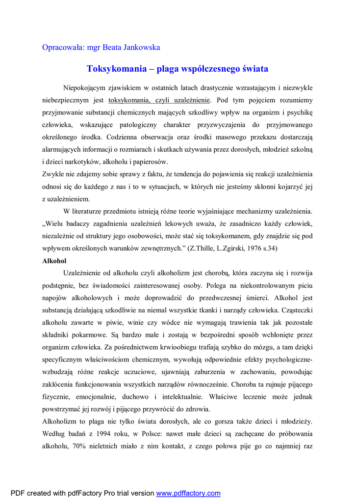 Opracowała: mgr Beata Jankowska Toksykomania – plaga współczesnego świata Niepokojącym zjawiskiem w ostatnich latach drastycznie wzrastającym i niezwykle niebezpiecznym jest toksykomania, czyli uzależnienie. Pod tym pojęciem rozumiemy przyjmowanie substancji chemicznych mających szkodliwy wpływ na organizm i psychikę człowieka, wskazujące patologiczny charakter przyzwyczajenia do przyjmowanego określonego środka. Codzienna obserwacja oraz środki masowego przekazu dostarczają alarmujących informacji o rozmiarach i skutkach używania przez dorosłych, młodzież szkolną i dzieci narkotyków, alkoholu i papierosów. Zwykle nie zdajemy sobie sprawy z faktu, że tendencja do pojawienia się reakcji uzależnienia odnosi się do każdego z nas i to w sytuacjach, w których nie jesteśmy skłonni kojarzyć jej z uzależnieniem. W literaturze przedmiotu istnieją różne teorie wyjaśniające mechanizmy uzależnienia. „Wielu badaczy zagadnienia uzależnień lekowych uważa, że zasadniczo każdy człowiek, niezależnie od struktury jego osobowości, może stać się toksykomanem, gdy znajdzie się pod wpływem określonych warunków zewnętrznych.” (Z.Thille, L.Zgirski, 1976 s.34) Alkohol Uzależnienie od alkoholu czyli alkoholizm jest chorobą, która zaczyna się i rozwija podstępnie, bez świadomości zainteresowanej osoby. Polega na niekontrolowanym piciu napojów alkoholowych i może doprowadzić do przedwczesnej śmierci. Alkohol jest substancją działającą szkodliwie na niemal wszystkie tkanki i narządy człowieka. Cząsteczki alkoholu zawarte w piwie, winie czy wódce nie wymagają trawienia tak jak pozostałe składniki pokarmowe. Są bardzo małe i zostają w bezpośredni sposób wchłonięte przez organizm człowieka. Za pośrednictwem krwioobiegu trafiają szybko do mózgu, a tam dzięki specyficznym właściwościom chemicznym, wywołują odpowiednie efekty psychologicznewzbudzają różne reakcje uczuciowe, ujawniają zaburzenia w zachowaniu, powodując zakłócenia funkcjonowania wszystkich narządów równocześnie. Choroba ta rujnuje pijącego fizycznie, emocjonalnie, duchowo i intelektualnie. Właściwe leczenie może jednak powstrzymać jej rozwój i pijącego przywrócić do zdrowia. Alkoholizm to plaga nie tylko świata dorosłych, ale co gorsza także dzieci i młodzieży. Według badań z 1994 roku, w Polsce: nawet małe dzieci są zachęcane do próbowania alkoholu, 70% nieletnich miało z nim kontakt, z czego połowa pije go co najmniej raz PDF created with pdfFactory Pro trial version www.pdffactory.com w tygodniu. Wśród uczniów szkoły średniej jest zaledwie 15% abstynentów, piwo pije 75% chłopców, a wódkę 14%. Przyczyny alkoholizmu nie są znane, alkoholikiem może stać się każdy. Wielu uzależnionych piło tylko okresowo, wielu piło tylko piwo. Trudno jest przewidzieć, jak długo ktoś utrzyma się w granicach picia towarzyskiego, a kiedy stanie się alkoholikiem. Nikotyna W genezie i patologii uzależnień poważnym problemem jest również uzależnienie od nikotyny. Nikotynizm, chociaż jest bardzo dawnym zjawiskiem, obecnie jednak staje się bardzo aktualnym, rosnącym w sposób dynamiczny i dającym szkodliwe, rakotwórcze skutki powodujące wzrost śmiertelności. „W Polsce produkcja papierosów wzrosła o 13 razy. Statystyczny Polak wypala rocznie 2700 papierosów, co stawia Polskę na trzecim miejscu po Stanach Zjednoczonych i Japonii” (Cekiera, 1993r.). Nałóg palenia tytoniu jest nałogiem natury psychologicznej, a dodatkowo utrwalony jest i wzmożony działaniem nikotyny. Dlatego odzwyczajanie od palenia ma charakter kompleksowy, w którym najważniejsza rola przypada psychoterapii. U ludzi zaczynających palenie przeważa wrodzona ciekawość i chęć naśladowania starszych, wiara w szybkie zdobycie dojrzałości i pozytywnej opinii ogółu, potrzeba zaakcentowania swojej rzekomej wyższości nad niepalącym otoczeniem, chęć zaimponowania kolegom. Wydaje się, że nikotyna uśmierza łaknienie w czasie głodu, ułatwia trawienie posiłku, pomaga na zdenerwowanie i zmartwienia, zły nastrój, pobudza umysł do intensywnej pracy, czasem uśmierza ból czy złe samopoczucie. Palenie tytoniu jest niebezpieczne zwłaszcza dla młodzieży w okresie dojrzewania płciowego, ze względu na szkodliwy wpływ na gruczoły dokrewne. Ochrona młodzieży przed nałogiem tytoniowym to jedno z ważniejszych zadań opiekuńczo – wychowawczych. Jego realizacji powinny służyć wszystkie inicjatywy podejmowane w trakcie pracy z młodzieżą, choć dane statystyczne alarmują, że w 90% przypadkach o problemach tych wiedzą rodzice lub najbliższa rodzina i wychowawcy. Środowisko rodzinne często akceptuje taką sytuację, a nauczyciele, jak stwierdziła młodzież, czasami próbują z tym walczyć. Podstawę wszelkich działań, zmierzających do ograniczania palenia papierosów stanowi wiedza o zagrożeniach zdrowotnych, jakie się z nimi wiążą. Ważne jest również informowanie młodzieży o mechanizmach uzależnienia się od nikotyny oraz o trudnościach związanych z powrotem do abstynencji. PDF created with pdfFactory Pro trial version www.pdffactory.com Narkotyki Codzienność pracy z młodzieżą może zaskakiwać różnorodnością problematyki, z którą przychodzi nam się stykać. Problem odurzania się młodzieży różnego rodzaju środkami jest niebezpieczny szczególnie dla tych, którzy nie mając silnego oparcia w rodzinie, chcąc być akceptowanym i przynależeć do grupy, chętnie sięgają po środki odurzające. Biorąc pod uwagę kryterium efektów farmakologicznych można wyróżnić narkotyki działające: 1 depresyjnie na ośrodkowy układ nerwowy (opium i jego pochodne – morfina, heroina) 2 stymulująco na ośrodkowy układ nerwowy (amfetamina, kokaina, crack) 3 halucynogennie na ośrodkowy układ nerwowy (konopie indyjskie – marihuana, haszysz, LSD 25, środki wziewne) Obecnie najbardzie