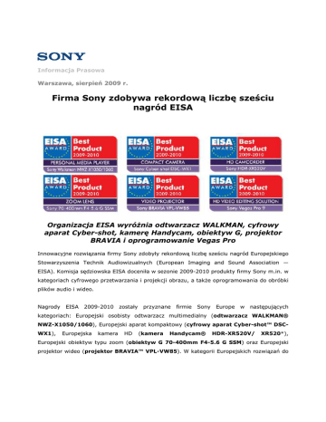 Informacja Prasowa Warszawa, sierpień 2009 r. Firma Sony zdobywa rekordową liczbę sześciu nagród EISA Organizacja EISA wyróŜnia odtwarzacz WALKMAN, cyfrowy aparat Cyber-shot, kamerę Handycam, obiektyw G, projektor BRAVIA i oprogramowanie Vegas Pro Innowacyjne rozwiązania firmy Sony zdobyły rekordową liczbę sześciu nagród Europejskiego Stowarzyszenia Technik Audiowizualnych (European Imaging and Sound Association — EISA). Komisja sędziowska EISA doceniła w sezonie 2009-2010 produkty firmy Sony m.in. w kategoriach cyfrowego przetwarzania i projekcji obrazu, a takŜe oprogramowania do obróbki plików audio i wideo. Nagrody EISA 2009-2010 zostały przyznane firmie Sony Europe w następujących kategoriach: Europejski osobisty odtwarzacz multimedialny (odtwarzacz WALKMAN® NWZ-X1050/1060), Europejski aparat kompaktowy (cyfrowy aparat Cyber-shot™ DSCWX1), Europejska kamera HD (kamera Handycam® HDR-XR520V/ XR520*), Europejski obiektyw typu zoom (obiektyw G 70-400mm F4-5.6 G SSM) oraz Europejski projektor wideo (projektor BRAVIA™ VPL-VW85). W kategorii Europejskich rozwiązań do edycji wideo HD nagrodę zdobyło teŜ opracowane przez Sony Creative Software oprogramowanie Vegas™ Pro 9. „Uzyskana przez nas w tym roku rekordowa liczba nagród EISA dowodzi, Ŝe innowacje firmy Sony idą w dobrym kierunku” — powiedział Fujio Nishida, prezes firmy Sony Europe. „Jesteśmy zaszczyceni wyróŜnieniem pracy naszych projektantów i inŜynierów przez to stowarzyszenie EISA, którego nagrody są coraz wyŜej cenione na całym świecie. Kładziemy większy niŜ dotąd nacisk na opracowywanie nowych produktów, które mają dostarczyć naszym klientom wyjątkowych wraŜeń. Bardzo cieszymy się, Ŝe komisja sędziowska EISA doceniła nasze starania, przyznając nam aŜ sześć nagród”. EISA jest największym stowarzyszeniem wydawców magazynów multimedialnych w Europie. NaleŜy do niego prawie 50 czasopism o tematyce poświęconej urządzeniom audio, elektronicznym urządzeniom mobilnym, urządzeniom wideo oraz fotografii, wydawanym w 20 krajach Europy. Tegoroczne nagrodzone produkty zostały wybrane po naradach komisji sędziowskiej składającej się z dziennikarzy oraz niezaleŜnych ekspertów technicznych. Nagrody EISA 2009-2010 zostaną wręczone na specjalnej gali, która odbędzie się 4 września 2009 r. w Berlinie. -** Model HDR-XR520 jest dostępny w Rosji, na Ukrainie, w Kazachstanie i w niektórych krajach Azji Środkowej. Model HDR-XR520V jest dostępny w pozostałych krajach europejskich. Notatki dla prasy — materiały dodatkowe dotyczące nagrodzonych przez EISA w tym roku produktów firmy Sony Europe: 1 — Odtwarzacz WALKMAN® NWZ-X1050/1060 (Europejski osobisty odtwarzacz multimedialny 2009-2010): Zaawansowany odtwarzacz MP3 i wideo WALKMAN® z 3calowym ekranem dotykowym OLED zapewnia wyjątkową jakość wideo. Wbudowany system Digital Noise Cancelling, cyfrowy wzmacniacz S-Master, mechanizm DSEE i technologie Clear Audio gwarantują świetna jakość dźwięku. Urządzenie obsługuje wszystkie popularne standardy zapisu plików multimedialnych. Zintegrowane łącze Wi-Fi umoŜliwia natomiast odtwarzanie filmów z serwisu YouTube™ i korzystanie z Internetu. Komisja sędziowska EISA wystawiła następującą ocenę: „Na pierwszy rzut oka nie widać bogatego zestawu funkcji odtwarzacza NWZ-X1050, wystarczy jednak dotknąć 3-calowego ekranu OLED, aby poznać jego moŜliwości. Nowe urządzenie Walkman serii X to pierwszy na świecie odtwarzacz multimedialny, który zapewnia redukcję zakłóceń w słuchawkach i skutecznie odcina zakłócenia tła. Ładowanie plików do urządzenia jest proste i przejrzyste. Bez trudu moŜna teŜ poruszać się wśród zgromadzonych plików i odtwarzać wybrane utwory. Urządzenie wyposaŜone jest w łącze Wi-Fi, które umoŜliwia korzystanie z Internetu, bezpośrednie pobieranie transmisji podcast lub oglądanie filmów z serwisu YouTube np. podczas słuchania radia. Odtwarzacz obsługuje wiele formatów plików multimedialnych, m.in. MP3, liniowe PCM i AVC (H.264/AVC). Aby podwyŜszyć jakość dźwięku, inŜynierowie firmy Sony wbudowali w urządzenie specjalne technologie audio, np. Clear Stereo, Clear Bass i DSEE. Obie wersje odtwarzacza — model z pamięcią 16 GB (NWZ-X1050) i 32 GB (NWZ-X1060) — oferują doskonały dźwięk, stylowy graficzny interfejs uŜytkownika i bardzo dobrą jakość wideo. Walkman X firmy Sony bez wątpienia zasługuje na nagrodę EISA!” 2 — Cyfrowy aparat Cyber-shot™ WX1 (Europejski aparat kompaktowy 2009-10): Ten zaawansowany cyfrowy aparat fotograficzny wyposaŜono w innowacyjną, wykonaną w technologii CMOS matrycę Exmor R™ o rozdzielczości 10,2 megapiksela, a takŜe w opracowany przez firmę Sony wydajny procesor BIONZ. Dzięki temu urządzenie gwarantuje szybką pracę oraz znakomite zdjęcia nawet w warunkach słabego oświetlenia. Wśród innych istotnych cech aparatu warto wymienić najwyŜszej jakości szerokokątny obiektyw G, zoom optyczny 5x, tryb Sweep Panorama i moŜliwość rejestrowania wyraźnych filmów w wysokiej rozdzielczości z prędkością 30 klatek na sekundę. Komisja sędziowska EISA wystawiła następującą ocenę: „Urządzenie Cyber-shot DSC-WX1 firmy Sony to bardzo mały aparat wyposaŜony w wysokiej jakości obiektyw G o jasności f/2,4 — 5,9 i uŜytecznym zakresie ogniskowych 24 — 120 mm. Urządzenie zawiera wykonaną w technologii CMOS matrycę Exmor R, która zapewnia świetną jakość obrazu i niski poziom szumów. Przy ustawieniu maksymalnej rozdzielczości 10 mln pikseli aparat moŜe w ciągu sekundy wykonać serię 10 zdjęć. Dzięki wyjątkowej funkcji Sweep Panorama wystarczy przesunąć urządzenie wzdłuŜ fotografowanego obiektu, aby uzyskać wspaniały obraz panoramiczny, który zostanie połączony wewnątrz aparatu. Nowy tryb Twilight (Zmierzch) umoŜliwia nałoŜenie kilku wykonanych bez statywu ujęć w celu u