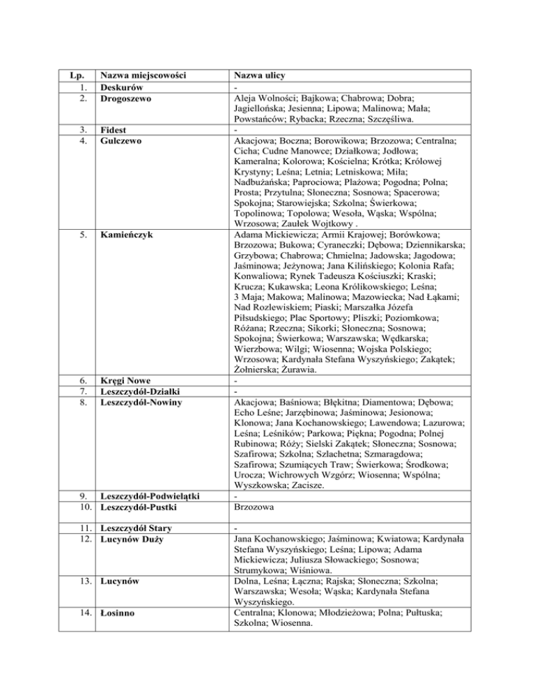 Lp. 1. 2. Nazwa miejscowości Deskurów Drogoszewo 3. 4. Fidest Gulczewo 5. Kamieńczyk 6. 7. 8. Kręgi Nowe Leszczydół-Działki Leszczydół-Nowiny 9. Leszczydół-Podwielątki 10. Leszczydół-Pustki 11. Leszczydół Stary 12. Lucynów Duży 13. Lucynów 14. Łosinno Nazwa ulicy Aleja Wolności; Bajkowa; Chabrowa; Dobra; Jagiellońska; Jesienna; Lipowa; Malinowa; Mała; Powstańców; Rybacka; Rzeczna; Szczęśliwa. Akacjowa; Boczna; Borowikowa; Brzozowa; Centralna; Cicha; Cudne Manowce; Działkowa; Jodłowa; Kameralna; Kolorowa; Kościelna; Krótka; Królowej Krystyny; Leśna; Letnia; Letniskowa; Miła; Nadbużańska; Paprociowa; Plażowa; Pogodna; Polna; Prosta; Przytulna; Słoneczna; Sosnowa; Spacerowa; Spokojna; Starowiejska; Szkolna; Świerkowa; Topolinowa; Topolowa; Wesoła, Wąska; Wspólna; Wrzosowa; Zaułek Wojtkowy . Adama Mickiewicza; Armii Krajowej; Borówkowa; Brzozowa; Bukowa; Cyraneczki; Dębowa; Dziennikarska; Grzybowa; Chabrowa; Chmielna; Jadowska; Jagodowa; Jaśminowa; Jeżynowa; Jana Kilińskiego; Kolonia Rafa; Konwaliowa; Rynek Tadeusza Kościuszki; Kraski; Krucza; Kukawska; Leona Królikowskiego; Leśna; 3 Maja; Makowa; Malinowa; Mazowiecka; Nad Łąkami; Nad Rozlewiskiem; Piaski; Marszałka Józefa Piłsudskiego; Plac Sportowy; Pliszki; Poziomkowa; Różana; Rzeczna; Sikorki; Słoneczna; Sosnowa; Spokojna; Świerkowa; Warszawska; Wędkarska; Wierzbowa; Wilgi; Wiosenna; Wojska Polskiego; Wrzosowa; Kardynała Stefana Wyszyńskiego; Zakątek; Żołnierska; Żurawia. Akacjowa; Baśniowa; Błękitna; Diamentowa; Dębowa; Echo Leśne; Jarzębinowa; Jaśminowa; Jesionowa; Klonowa; Jana Kochanowskiego; Lawendowa; Lazurowa; Leśna; Leśników; Parkowa; Piękna; Pogodna; Polnej Rubinowa; Róży; Sielski Zakątek; Słoneczna; Sosnowa; Szafirowa; Szkolna; Szlachetna; Szmaragdowa; Szafirowa; Szumiących Traw; Świerkowa; Środkowa; Urocza; Wichrowych Wzgórz; Wiosenna; Wspólna; Wyszkowska; Zacisze. Brzozowa Jana Kochanowskiego; Jaśminowa; Kwiatowa; Kardynała Stefana Wyszyńskiego; Leśna; Lipowa; Adama Mickiewicza; Juliusza Słowackiego; Sosnowa; Strumykowa; Wiśniowa. Dolna, Leśna; Łączna; Rajska; Słoneczna; Szkolna; Warszawska; Wesoła; Wąska; Kardynała Stefana Wyszyńskiego. Centralna; Klonowa; Młodzieżowa; Polna; Pułtuska; Szkolna; Wiosenna. 15. Natalin 16. Olszanka 17. Puste Łąki 18. Rybienko Nowe 19. Rybienko Stare 20. Rybno 21. Sitno 22. Skuszew 23. Ślubów 24. Świniotop 25. Tulewo Białostocka; Kwiatowa; Jana Matejki; Miętowa; Nadziei; Niedźwiedzia; Polna; Przyszłość; Studzienna; Szkolna; Wyszkowska. Pułtuska Akacjowa; Dębowa; Grzybowa; Jadowska; Jeżynowa; Kalinowa; Leśna; Letniskowa; Liwcowa; Loretańska; Poziomkowa; Rzeczna; Słoneczna; Sosnowa; Spacerowa; Szeroka; Wczasowa. Bukowa; Calineczki; Czerwonego Kapturka; Dębowa; Dobra; Dobrej Wróżki; Handlowa; Kasztanowa; Klonowa; Krasnoludków; Królowej Śniegu; Kryształowa; Księżycowa; Kubusia Puchatka; 3-go Maja; Małego Księcia; Magnoliowa; Meliorantów; Św. Mikołaja; Misia Uszatka; Orzechowa; Pinokia; Piotrusia Pana; Platynowa; Pszczółki Mai; Serocka; Smocza; Sezamkowa; Starej Baśni; Złota; Żytnia. Diamentowa; Pastelowa; Rubinowa; Srebrna; Szafirowa; Szmaragdowa; Złota; Księżycowa; Turkusowa. Jesionowa; Jeziorna; Leśna; Nadbużańska; Ogrodowa; Osiedlowa; Polna; Przemysłowa; Strażacka; Wyszkowska. Bociania; Bukowa; Dębowa; Jesionowa; Kamieńczykowska; Kręta; Kółko; Lipowa; Lotników; Łochowska; Malownicza; Przejazdowa; Rozdroże; Równa; Rzepichówka; Skrajna; Turystyczna; Wschodnia; Wspólna; Zaolszynie; Ziołowa. Aleja Białych Brzóz; Leszczynowa; Sosnowa; Spacerowa. Brzozowa; Dzięcioła; Jaworowa; Kukawska; Liwcowa; Leśna; Modrzewiowa; Na Skraju; Nadrzeczna; Nadziei; Olchowa; Pod Lasem; Piękna; Polna; Prosta; Przy Kruszynie; Radosna; Rybacka; Sosnowa; Słoneczna; Świerkowa; Środkowa; Tęczowa; Topolowa; Wąska; Wrzosowa. Familijna; Wyszkowska