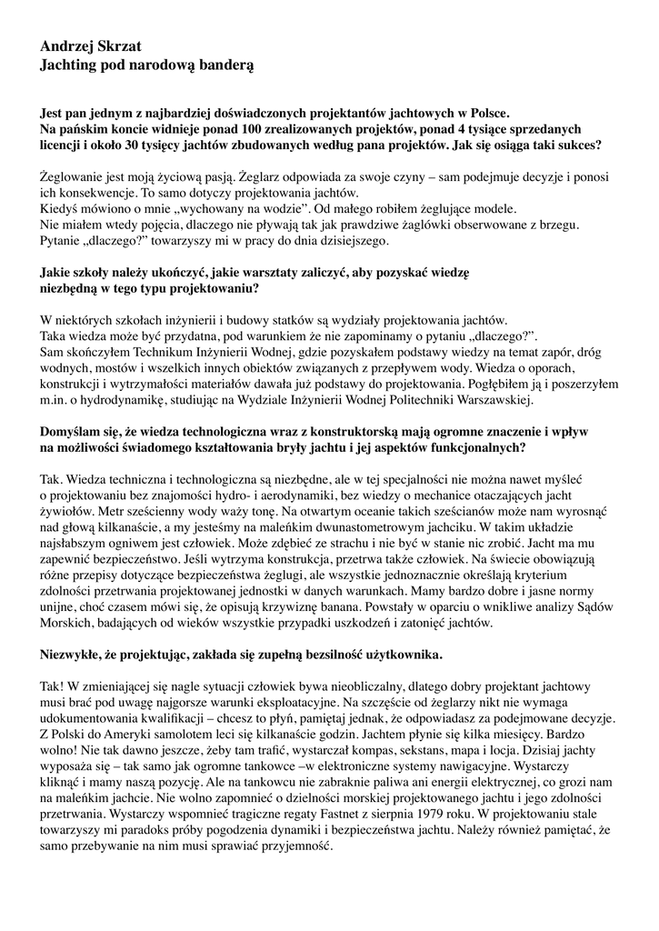 Andrzej Skrzat Jachting pod narodową banderą Jest pan jednym z najbardziej doświadczonych projektantów jachtowych w Polsce. Na pańskim koncie widnieje ponad 100 zrealizowanych projektów, ponad 4 tysiące sprzedanych licencji i około 30 tysięcy jachtów zbudowanych według pana projektów. Jak się osiąga taki sukces? Żeglowanie jest moją życiową pasją. Żeglarz odpowiada za swoje czyny – sam podejmuje decyzje i ponosi ich konsekwencje. To samo dotyczy projektowania jachtów. Kiedyś mówiono o mnie „wychowany na wodzie”. Od małego robiłem żeglujące modele. Nie miałem wtedy pojęcia, dlaczego nie pływają tak jak prawdziwe żaglówki obserwowane z brzegu. Pytanie „dlaczego?” towarzyszy mi w pracy do dnia dzisiejszego. Jakie szkoły należy ukończyć, jakie warsztaty zaliczyć, aby pozyskać wiedzę niezbędną w tego typu projektowaniu? W niektórych szkołach inżynierii i budowy statków są wydziały projektowania jachtów. Taka wiedza może być przydatna, pod warunkiem że nie zapominamy o pytaniu „dlaczego?”. Sam skończyłem Technikum Inżynierii Wodnej, gdzie pozyskałem podstawy wiedzy na temat zapór, dróg wodnych, mostów i wszelkich innych obiektów związanych z przepływem wody. Wiedza o oporach, konstrukcji i wytrzymałości materiałów dawała już podstawy do projektowania. Pogłębiłem ją i poszerzyłem m.in. o hydrodynamikę, studiując na Wydziale Inżynierii Wodnej Politechniki Warszawskiej. Domyślam się, że wiedza technologiczna wraz z konstruktorską mają ogromne znaczenie i wpływ na możliwości świadomego kształtowania bryły jachtu i jej aspektów funkcjonalnych? Tak. Wiedza techniczna i technologiczna są niezbędne, ale w tej specjalności nie można nawet myśleć o projektowaniu bez znajomości hydro- i aerodynamiki, bez wiedzy o mechanice otaczających jacht żywiołów. Metr sześcienny wody waży tonę. Na otwartym oceanie takich sześcianów może nam wyrosnąć nad głową kilkanaście, a my jesteśmy na maleńkim dwunastometrowym jachciku. W takim układzie najsłabszym ogniwem jest człowiek. Może zdębieć ze strachu i nie być w stanie nic zrobić. Jacht ma mu zapewnić bezpieczeństwo. Jeśli wytrzyma konstrukcja, przetrwa także człowiek. Na świecie obowiązują różne przepisy dotyczące bezpieczeństwa żeglugi, ale wszystkie jednoznacznie określają kryterium zdolności przetrwania projektowanej jednostki w danych warunkach. Mamy bardzo dobre i jasne normy unijne, choć czasem mówi się, że opisują krzywiznę banana. Powstały w oparciu o wnikliwe analizy Sądów Morskich, badających od wieków wszystkie przypadki uszkodzeń i zatonięć jachtów. Niezwykłe, że projektując, zakłada się zupełną bezsilność użytkownika. Tak! W zmieniającej się nagle sytuacji człowiek bywa nieobliczalny, dlatego dobry projektant jachtowy musi brać pod uwagę najgorsze warunki eksploatacyjne. Na szczęście od żeglarzy nikt nie wymaga udokumentowania kwalifikacji – chcesz to płyń, pamiętaj jednak, że odpowiadasz za podejmowane decyzje. Z Polski do Ameryki samolotem leci się kilkanaście godzin. Jachtem płynie się kilka miesięcy. Bardzo wolno! Nie tak dawno jeszcze, żeby tam trafić, wystarczał kompas, sekstans, mapa i locja. Dzisiaj jachty wyposaża się – tak samo jak ogromne tankowce –w elektroniczne systemy nawigacyjne. Wystarczy kliknąć i mamy naszą pozycję. Ale na tankowcu nie zabraknie paliwa ani energii elektrycznej, co grozi nam na maleńkim jachcie. Nie wolno zapomnieć o dzielności morskiej projektowanego jachtu i jego zdolności przetrwania. Wystarczy wspomnieć tragiczne regaty Fastnet z sierpnia 1979 roku. W projektowaniu stale towarzyszy mi paradoks próby pogodzenia dynamiki i bezpieczeństwa jachtu. Należy również pamiętać, że samo przebywanie na nim musi sprawiać przyjemność. Czy zdarza się, że trzeba dokonać przewartościowania na rzecz jednego z tych dwóch aspektów, stawiając na jednej szali przyjemność i rozrywkę, a na drugiej bezpieczeństwo? W przypadku jachtów sportowych – tak. Tam liczą się przede wszystkim osiągi. Nie ma znaczenia, jak daleko taka łódź popłynie i ile wytrzyma. Jak w samochodowej Formule 1. Przeciętnemu użytkownikowi natomiast potrzebny jest samochód oszczędny, w miarę szybki, ale nie przesadnie, bo nie chodzi mu o bicie rekordów ani o przeżycia ekstremalne. Podobnie jest z jachtami. Ludzie zakochani w żeglarstwie często mieszkają w swoich łodziach, przemieszczają się nimi z miejsca na miejsce, więc muszą im one gwarantować bezpieczeństwo. Laik często nie potrafi dostrzec różnic między poszczególnymi jednostkami. Z czego to wynika? Czy tu też zachodzi podobieństwo do branży samochodowej? Jak we wszystkich dziedzinach, także w projektowaniu jachtów są mody, a ostatnio modny jest wygląd sportowy. Prawdziwe jednostki sportowe są prawie identyczne z powodu podporządkowania ich geometrii wysokim osiągom, a przede wszystkim formułom pomiarowym. Zwykli użytkownicy jachtów też pragną przeżywać emocje, które się odczuwa na zawodach, dlatego sportowe linie kopiuje się czasem do projektów jachtów turystycznych. Bywa, że przez nierozważne przeniesienie rozwiązań wprowadza się również złe cechy jednostek sportowych, które np. powodują, że przy dużym zafalowaniu trudno jachtem odejść od brzegu. Wbrew pozorom stwarza to dla łodzi i załogi największe zagrożenie. Podążanie za modą ma również i inne negatywne następstwa: prowokuje do „wyścigu zbrojeń”. Koszty wdrażania nowych, ekstrawaganckich i często zmieniających się wzorów są czasami nie do udźwignięcia dla małego producenta, a i wielkie konsorcja mają z tym kłopoty. Czy rynek wymaga aż tak częstych zmian w estetyce jachtów, czy może producenci chcą więcej sprzedawać? To zależy, do kogo się adresuje własny produkt. Są dwie grupy klientów bardzo różniące się wymaganiami i gus