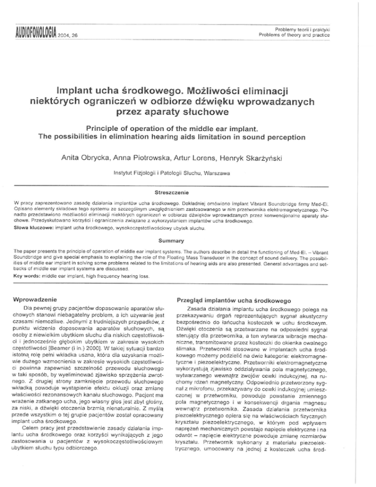 Problemy teorii i praktyki Problems ot theory and practice Implant ucha środkowego. Możliwości eliminacji niektórych ograniczeń w odbiorze dźwięku wprowadzanych przez aparaty słuchowe Principle ot operation ot the middle ear implant. Th e possibilities in elimination hearing aids limitation in sound perception Anita Obrycka , Anna Piotrowska, Artur Lore ns, Henryk Instytut Fizjologii i Patologii Słuchu, Skarżyński Warszawa Streszczenie W pracy za prezentowano zasadę dz i ałan i a implantów ucha środkowego . Dokładniej omówiono implant Vibrant Soundbridge firmy Med-EI. Opisano elementy składowe tego systemu ze szczególnym uwzg lędnieniem zastosowanego w nim przetwornika elektromagnetycznego. Ponadto przedstawiono możliwości eliminacji niektórych ograniczeń w odbiorze dźwięków wprowadzanych przez konwencjonalne aparaty słu chowe. Przedyskutowano ko rzy ści i ograniczenia zw iązane z wykorzystaniem implantów ucha środkowego . Slowa kluczowe: implant ucha środkowego, wysokoczęslotliwościowy ubytek słuchu . Summary The paper presents Ihe principle of operation ot middle ear impl ant systems . The authors describe in delail the functioning of Med-EI. - Vibrant Soundbridge and give special emphasis to explaining the role of the Floating Mass Tra nsducer in the concept of sound delivery. The possibilities of middle ear implant in solving same problems related to the limitations of hearing aids are also presented . Genera l advantages and setbacks of middle ear implant systems are discussed. Key words: middle ear implant, high frequency hearing lass. Wprowadzenie Przegląd Dla pewnej grupy pacjentów dopasowanie aparatów słu chowych stanowi niebagatelny problem, a ich używanie jest czasami niemożliwe. Jednymi z trudniejszych przypadków, z punktu widzenia dopasowania aparatów słuchowych, są osoby z niewielkim ubytkiem słuchu dla niskich częs to t l iwo ś ci i jednoczesnie głębokim ubytkiem w zakresie wysokich częstotli woś ci [Beamer (i in.) 20001. W takiej sytuacji bardzo istot ną rolę pełni wkładka uszna , która dla uzyskania możl i wie dużego wzmocnienia w zakresie wysokich częstotli woś ci powinna zapewniać sz czelnosć przewodu słuchowego w taki sposób, by wye l iminować zjawisko sprzęże n ia zwrotnego. Z drugiej strony zamknięcie przewodu słuchowego wkła dką powoduje wystąpienie efektu okluzji ora z zmianę właściwości rezon ansowych kanału słuchowego . Pacjent ma wrażenie zatkanego ucha, jego wlasny głos jest zbyt głośny, za niski, a dźw ięki otoczenia brzmią nie naturalnie. Z myślą przede wszystkim o tej grupie pacjentów został opracowany implant ucha środkowego. Celem pra cy jest przedstawienie zasady dz iała nia implantu ucha środkowego oraz korzyści wynikających z jeg o zastosowania u pacjentów z wysokoc z ęstotliwościowym ubytkiem słuchu typu odbiorczego. Zasada działania implantu ucha srodkowego polega na przekazywaniu drgań reprezentujących sygnał akustyczny bezposrednio do łańcucha kosteczek w uchu środkowym. Dźw ię k i otoczenia są przetwarzane na odpowiedni sygnał ste rujący dla przetwornika, a ten wytwarza wibra cje mechaniczne, transmitowane przez kosteczki do okienka owalnego ślim aka. Przetworniki stosowane w implantach ucha środ kowego mozemy podz iel ić na dwie kategorie: elektromagnetyczne i piezoelektryczne . Przetworniki elektromagnetyczne wykorzystują zjawisko oddziaływania pola magnetycznego, wytwarzanego wewnąt rz zwojów cewki indukcyjnej, na ruchomy rdze ń magnetyczny. Odpowiednio przetworzony sygnał z mikrofonu , przekazywany do cewki indukcyjnej umieszczonej w przetworniku, powoduje powstanie zmienne go pol a magnetycznego i w konsekwencj i drgania magnesu wewnątrz przetwornika. Zasada dz i ałania przetworn ika piezoelektrycznego opiera się na właściwościach fizycznych kryształu piezoelektrycznego, w którym pod wpływem naprężeń mechanicznych powstaje napięcie elektryczne i na odwrót - napięcie elektryczne powoduje zmianę rozmiarów kryształu. Przetwornik wykonany z mate r ia ł u piezoelektrycznego, umocowany na jednej z kosteczek ucha srod- implantów ucha środkowego Anita Obrycka, Anna Piotrowska, Artur Lorens, Henryk Skarżyński 92 kowego i pobudzony zmiennym napięciem, wprawia w drgania cały układ kosteczek słuchowych. Podobnie jak w przypadku przetwornika elektromagnetycznego, sygnał z mikrofonu jest odpowiednio wzmacniany i przetwarzany. Obecnie pięć ośrodków na świecie prowadzi zaawansowane badania w zakresie implantów ucha środkowego, stosując różne technologie i rozwiązania konstrukcyjne. W trzech z nich wykorzystuje się przetworniki elektromagnetyczne, a w dwóch przetworniki piezoelektryczne. Implanty ucha środkowego, wykorzystujące przetworniki piezoelek- tryczne, to systemy: Envoy firmy Sl. Croix Medical oraz TICA (To/ally /mp/an/ab/e Coch/ear Amplifier) firmy Implex. Implant że zastosowanie słuchawki aparatu powoduje utratę wysoko- częstotliwościowej składowej sygnału (powyżej czas gdy użycie Zaletą FMT zapewnia 4 kHz), pod7 kHz. transmisję powyżej implantów z przetwornikiem elektromagnety- cznym jest możliwość uzyskania większego efektywnego poziomu sygnału wyjściowego niż przy zastosowaniu przetwornika piezoelektrycznego. Maksymalny poziom wyjściowy przetworzonego sygnału, w zakresie wysokich częstotliwoś ci, stanowi w przypadku przetworników piezoelektrycznych ekwiwalent 110 dB SPL. Powoduje to możliwość zastosowania ich dla średnich do średnio-głębokich ubytków słuchu . z główką strzemiączka przekształca przetworzony przez procesor sygnał z mikrofonu na drgania strzemiączka. Takie rozwiązanie wymaga jednak przerwania łańcucha kosteczek Zastosowan ie przetwornika elektromagnetycznego pozwala na uzyskanie sygnału odpowiadającego poziomowi 140 dB SPL, co umożliwia zastosowanie go u pacjentów z ubytkiem głębokim na wysokich częstotliwościach. Na nie