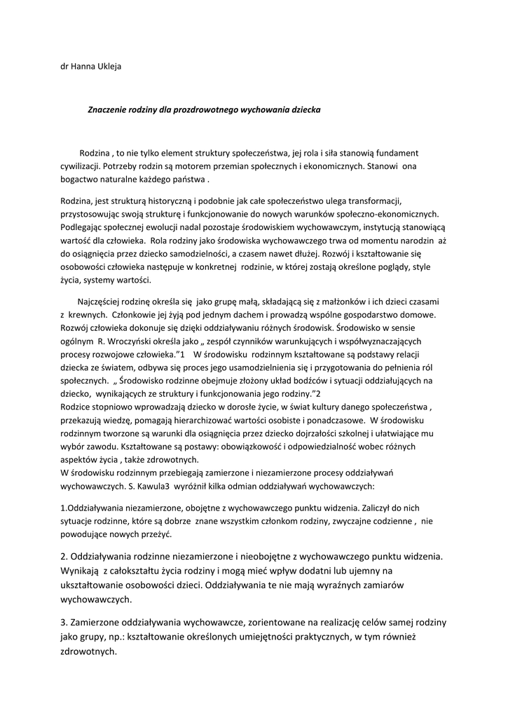 dr Hanna Ukleja Znaczenie rodziny dla prozdrowotnego wychowania dziecka Rodzina , to nie tylko element struktury społeczeństwa, jej rola i siła stanowią fundament cywilizacji. Potrzeby rodzin są motorem przemian społecznych i ekonomicznych. Stanowi ona bogactwo naturalne każdego państwa . Rodzina, jest strukturą historyczną i podobnie jak całe społeczeństwo ulega transformacji, przystosowując swoją strukturę i funkcjonowanie do nowych warunków społeczno-ekonomicznych. Podlegając społecznej ewolucji nadal pozostaje środowiskiem wychowawczym, instytucją stanowiącą wartość dla człowieka. Rola rodziny jako środowiska wychowawczego trwa od momentu narodzin aż do osiągnięcia przez dziecko samodzielności, a czasem nawet dłużej. Rozwój i kształtowanie się osobowości człowieka następuje w konkretnej rodzinie, w której zostają określone poglądy, style życia, systemy wartości. Najczęściej rodzinę określa się jako grupę małą, składającą się z małżonków i ich dzieci czasami z krewnych. Członkowie jej żyją pod jednym dachem i prowadzą wspólne gospodarstwo domowe. Rozwój człowieka dokonuje się dzięki oddziaływaniu różnych środowisk. Środowisko w sensie ogólnym R. Wroczyński określa jako „ zespół czynników warunkujących i współwyznaczających procesy rozwojowe człowieka.”1 W środowisku rodzinnym kształtowane są podstawy relacji dziecka ze światem, odbywa się proces jego usamodzielnienia się i przygotowania do pełnienia ról społecznych. „ Środowisko rodzinne obejmuje złożony układ bodźców i sytuacji oddziałujących na dziecko, wynikających ze struktury i funkcjonowania jego rodziny.”2 Rodzice stopniowo wprowadzają dziecko w dorosłe życie, w świat kultury danego społeczeństwa , przekazują wiedzę, pomagają hierarchizować wartości osobiste i ponadczasowe. W środowisku rodzinnym tworzone są warunki dla osiągnięcia przez dziecko dojrzałości szkolnej i ułatwiające mu wybór zawodu. Kształtowane są postawy: obowiązkowość i odpowiedzialność wobec różnych aspektów życia , także zdrowotnych. W środowisku rodzinnym przebiegają zamierzone i niezamierzone procesy oddziaływań wychowawczych. S. Kawula3 wyróżnił kilka odmian oddziaływań wychowawczych: 1.Oddziaływania niezamierzone, obojętne z wychowawczego punktu widzenia. Zaliczył do nich sytuacje rodzinne, które są dobrze znane wszystkim członkom rodziny, zwyczajne codzienne , nie powodujące nowych przeżyć. 2. Oddziaływania rodzinne niezamierzone i nieobojętne z wychowawczego punktu widzenia. Wynikają z całokształtu życia rodziny i mogą mieć wpływ dodatni lub ujemny na ukształtowanie osobowości dzieci. Oddziaływania te nie mają wyraźnych zamiarów wychowawczych. 3. Zamierzone oddziaływania wychowawcze, zorientowane na realizację celów samej rodziny jako grupy, np.: kształtowanie określonych umiejętności praktycznych, w tym również zdrowotnych. 4. Zamierzone oddziaływania wychowawcze rodziców zorientowanych na realizację celów wychowawczych obowiązujących w społeczeństwie globalnym. Oddziaływanie to umożliwia włączenie rodziny w ogólnospołeczny system wychowawczy i selekcję pozarodzinnych wpływów. Rodzina aby osiągnąć zamierzony cel posługuje się określonymi mechanizmami, które wiążą się zarówno z oddziaływaniami intuicyjnymi, jak intencjonalnymi. S. Kawula do mechanizmów tych zalicza: - mechanizm naśladownictwa i identyfikacji: - mechanizm kontroli społecznej; - mechanizm pobudzający odpowiednio ukierunkowaną aktywność dziecka3. Pierwsze informacje o zdrowiu uzyskane w środowisku rodzinnym, rozpoczynają proces kształtowania świadomości zdrowotnej, w wyniku której podstawę oddziaływania rodziców stanowią czynności świadome i celowe. Świadomość to „zdolność zdawania sobie sprawy z własnego zachowania, jego uwarunkowań i konsekwencji4. Od rodziców dziecko otrzymuje pierwsze informacje o tym, co sprzyja i co szkodzi zdrowiu. Edukacja zdrowotna w rodzinie zorientowana jest zarówno na kształtowanie świadomości prozdrowotnej, poprzez propagowanie wiedzy prozdrowotnej (funkcja poznawcza), jak również kształtowanie umiejętności w zakresie potęgowania i ochrony zdrowia w wyniku realizacji funkcji opiekuńczej. Działalność opiekuńcza rodziny, w wyniku której dokonuje się edukacja zdrowotna dziecka, opiera się na dobrej znajomości potrzeb i stworzeniu warunków dla rozwoju dziecka. Przypisy 1. Wroczyński R.: Pedagogika społeczna, Warszawa 1985, s. 76 2. Jackowska E.: Środowisko rodzinne a przystosowanie społeczne dziecka w młodszym wieku szkolnym, Warszawa 1980, s.28 3. Kawula S.: Rodzina jako grupa i instytucja opiekuńczo-wychowawcza, w: Pedagogika rodziny, red.: Kawula S., Brągiel J., Jankie A., W., Toruń 2000 4. Okoń W., Nowy słownik pedagogiczny , Warszawa 1996, s. 282