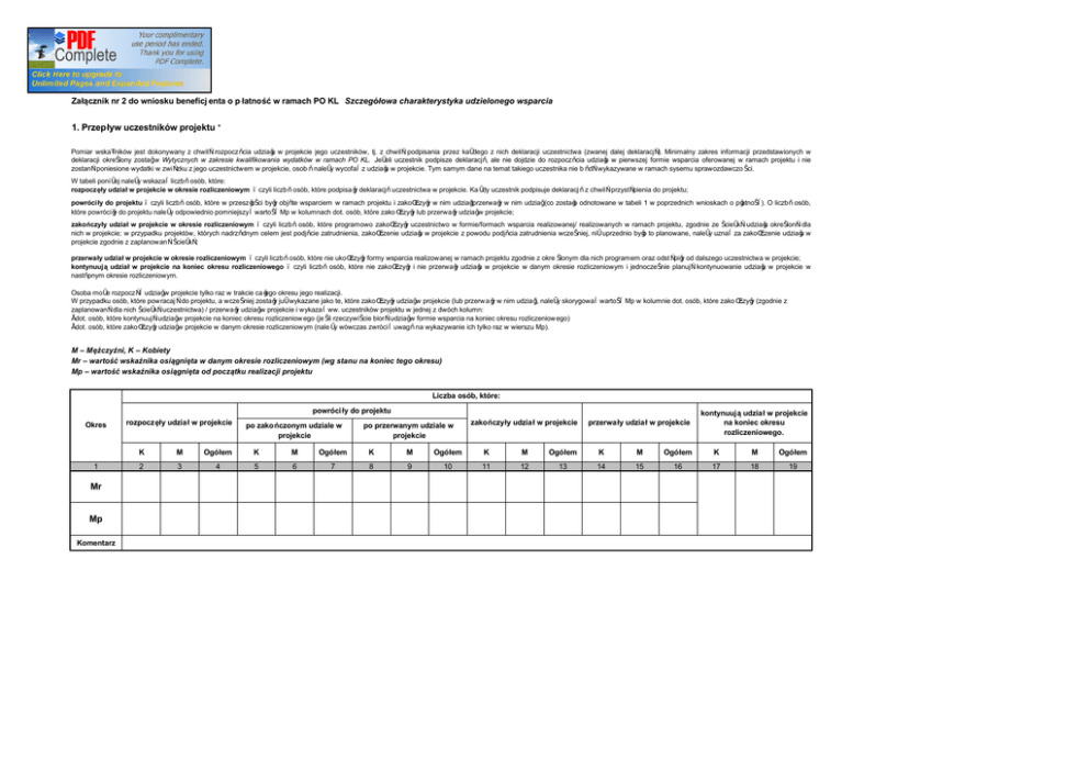 Załącznik nr 2 do wniosku beneficj enta o p łatność w ramach PO KL Szczegółowa charakterystyka udzielonego wsparcia 1. Przepływ uczestników projektu * Pomiar wskaźników jest dokonywany z chwilą rozpoczęcia udziału w projekcie jego uczestników, tj. z chwilą podpisania przez każdego z nich deklaracji uczestnictwa (zwanej dalej deklaracją). Minimalny zakres informacji przedstawionych w deklaracji określony został w Wytycznych w zakresie kwalifikowania wydatków w ramach PO KL. Jeżeli uczestnik podpisze deklarację, ale nie dojdzie do rozpoczęcia udziału w pierwszej formie wsparcia oferowanej w ramach projektu i nie zostaną poniesione wydatki w związku z jego uczestnictwem w projekcie, osob ę należy wycofać z udziału w projekcie. Tym samym dane na temat takiego uczestnika nie b ędą wykazywane w ramach sysemu sprawozdawczo ści. W tabeli poniżej należy wskazać liczbę osób, które: rozpoczęły udział w projekcie w okresie rozliczeniowym – czyli liczbę osób, które podpisa ły deklarację uczestnictwa w projekcie. Ka żdy uczestnik podpisuje deklaracj ę z chwilą przystąpienia do projektu; powróciły do projektu – czyli liczbę osób, które w przeszłości były objęte wsparciem w ramach projektu i zakończyły w nim udział/przerwały w nim udział (co zostało odnotowane w tabeli 1 w poprzednich wnioskach o płatność). O liczbę osób, które powróciły do projektu należy odpowiednio pomniejszyć wartość Mp w kolumnach dot. osób, które zako ńczyły lub przerwały udział w projekcie; zakończyły udział w projekcie w okresie rozliczeniowym – czyli liczbę osób, które programowo zakończyły uczestnictwo w formie/formach wsparcia realizowanej/ realizowanych w ramach projektu, zgodnie ze ścieżką udziału określoną dla nich w projekcie; w przypadku projektów, których nadrzędnym celem jest podjęcie zatrudnienia, zakończenie udziału w projekcie z powodu podjęcia zatrudnienia wcześniej, niż uprzednio było to planowane, należy uznać za zakończenie udziału w projekcie zgodnie z zaplanow aną ścieżką; przerwały udział w projekcie w okresie rozliczeniowym – czyli liczbę osób, które nie ukończyły formy wsparcia realizowanej w ramach projektu zgodnie z okre ślonym dla nich programem oraz odst ąpiły od dalszego uczestnictwa w projekcie; kontynuują udział w projekcie na koniec okresu rozliczeniowego – czyli liczbę osób, które nie zakończyły i nie przerwały udziału w projekcie w danym okresie rozliczeniowym i jednocześnie planują kontynuowanie udziału w projekcie w następnym okresie rozliczeniowym. Osoba może rozpocząć udział w projekcie tylko raz w trakcie ca łego okresu jego realizacji. W przypadku osób, które pow racaj ą do projektu, a wcześniej zostały już wykazane jako te, które zakończyły udział w projekcie (lub przerw a ły w nim udział), należy skorygować wartość Mp w kolumnie dot. osób, które zako ńczyły (zgodnie z zaplanowaną dla nich ścieżką uczestnictwa) / przerwały udział w projekcie i wykazać ww. uczestników projektu w jednej z dwóch kolumn: • dot. osób, które kontynuują udział w projekcie na koniec okresu rozliczeniow ego (je śli rzeczywiście biorą udział w formie wsparcia na koniec okresu rozliczeniow ego) • dot. osób, które zakończyły udział w projekcie w danym okresie rozliczeniowym (nale ży wówczas zwrócić uwagę na wykazywanie ich tylko raz w wierszu Mp). M – Mężczyźni, K – Kobiety Mr – wartość wskaźnika osiągnięta w danym okresie rozliczeniowym (wg stanu na koniec tego okresu) Mp – wartość wskaźnika osiągnięta od początku realizacji projektu Liczba osób, które: powróciły do projektu Okres 1 Mr Mp Komentarz rozpoczęły udział w projekcie po zakończonym udziale w projekcie po przerwanym udziale w projekcie zakończyły udział w projekcie przerwały udział w projekcie kontynuują udział w projekcie na koniec okresu rozliczeniowego. K M Ogółem K M Ogółem K M Ogółem K M Ogółem K M Ogółem K M Ogółem 2 3 4 5 6 7 8 9 10 11 12 13 14 15 16 17 18 19 UWAGA: Osoby, które rozpocz ęły udział w projekcie w bieżącym okresie rozliczeniowym (Mr) s ą wykazywane: 1) w kolumnach nr 2-4 dotyczących osób, które rozpocz ęły udział w projekcie, 2) w kolumnach nr 5-19 dotyczących osób, które powróciły do projektu lub kontynuują lub zakończyły lub przerwały udział w projekcie. W przypadku osób, które kontynuuj ą udział w projekcie na koniec okresu rozliczeniow ego, warto ść Mr zawsze będzie równa wartości Mp. Liczba osób, które rozpocz ęły udział w projekcie od pocz ątku jego realizacji (Mp), pow inna by ć równa sumie osób wykazanych w kolumnach dotycz ących uczestników, którzy kontynuują, zakończyli oraz przerwali udział w projekcie od pocz ątku jego realizacji (Mp). W przypadku wartości Mr suma osób, które kontynuują, zakończyły lub przerwały udział w projekcie w danym okresie rozliczeniowym, powinna by ć równa sumie liczby osób, które rozpocz ęły udział w projekcie w bieżącym okresie rozliczeniowym i liczby osób, które powróciły do projektu po zakończonym/przerwanym udziale w projekcie i liczby osób, które kontynuuj ą udział z poprzedniego okresu rozliczeniow ego odpowiednio w grupie kobiet, m ężczyzn i ogółem. Liczba uczestników, którzy zostali obj ęci wsparciem to suma osób wykazanych w kolumnach dotycz ących uczestników, którzy kontynuują, zakończyli oraz przerwali udział w projekcie, zarówno w bie żącym okresie rozliczeniowym (Mr), jak i od początku realizacji projektu (Mp) odpow iednio w grupie kobiet, m ężczyzn i ogółem. Różnica pomiędzy liczbą osób, które rozpocz ęły udział w projekcie od pocz ątku jego realizacji (Mp), a sum ą uczestników wykazanych w kolumnach dotycz ących osób, które kontynuują, zakończyły oraz przerwały udział w projekcie w bieżącym okresie rozliczeniowym (Mr), 