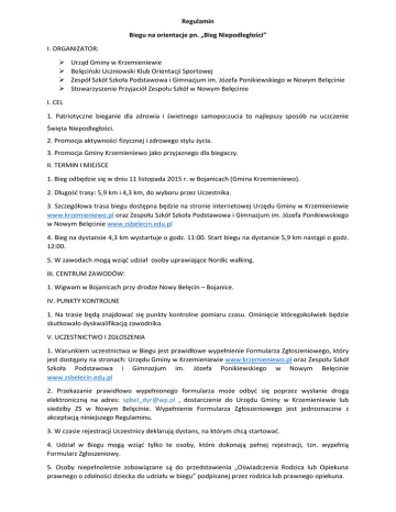 Regulamin Biegu na orientacje pn. „Bieg Niepodległości” I. ORGANIZATOR: Urząd Gminy w Krzemieniewie Belęciński Uczniowski Klub Orientacji Sportowej Zespół Szkół Szkoła Podstawowa i Gimnazjum im. Józefa Ponikiewskiego w Nowym Belęcinie Stowarzyszenie Przyjaciół Zespołu Szkół w Nowym Belęcinie I. CEL 1. Patriotyczne bieganie dla zdrowia i świetnego samopoczucia to najlepszy sposób na uczczenie Święta Niepodległości. 2. Promocja aktywności fizycznej i zdrowego stylu życia. 3. Promocja Gminy Krzemieniewo jako przyjaznego dla biegaczy. II. TERMIN I MIEJSCE 1. Bieg odbędzie się w dniu 11 listopada 2015 r. w Bojanicach (Gmina Krzemieniewo). 2. Długość trasy: 5,9 km i 4,3 km, do wyboru przez Uczestnika. 3. Szczegółowa trasa biegu dostępna będzie na stronie internetowej Urzędu Gminy w Krzemieniewie www.krzemieniewo.pl oraz Zespołu Szkół Szkoła Podstawowa i Gimnazjum im. Józefa Ponikiewskiego w Nowym Belęcinie www.zsbelecin.edu.pl 4. Bieg na dystansie 4,3 km wystartuje o godz. 11:00. Start biegu na dystansie 5,9 km nastąpi o godz. 12:00. 5. W zawodach mogą wziąć udział osoby uprawiające Nordic walking. III. CENTRUM ZAWODÓW: 1. Wigwam w Bojanicach przy drodze Nowy Belęcin – Bojanice. IV. PUNKTY KONTROLNE 1. Na trasie będą znajdować się punkty kontrolne pomiaru czasu. Ominięcie któregokolwiek będzie skutkowało dyskwalifikacją zawodnika. V. UCZESTNICTWO I ZGŁOSZENIA 1. Warunkiem uczestnictwa w Biegu jest prawidłowe wypełnienie Formularza Zgłoszeniowego, który jest dostępny na stronach: Urzędu Gminy w Krzemieniewie www.krzemieniewo.pl oraz Zespołu Szkół Szkoła Podstawowa i Gimnazjum im. Józefa Ponikiewskiego w Nowym Belęcinie www.zsbelecin.edu.pl 2. Przekazanie prawidłowo wypełnionego formularza może odbyć się poprzez wysłanie drogą elektroniczną na adres: [email protected] , dostarczenie do Urzędu Gminy w Krzemieniewie lub siedziby ZS w Nowym Belęcinie. Wypełnienie Formularza Zgłoszeniowego jest jednoznaczne z akceptacją niniejszego Regulaminu. 3. W czasie rejestracji Uczestnicy deklarują dystans, na którym chcą startować. 4. Udział w Biegu mogą wziąć tylko te osoby, które dokonają pełnej rejestracji, tzn. wypełnią Formularz Zgłoszeniowy. 5. Osoby niepełnoletnie zobowiązane są do przedstawienia „Oświadczenia Rodzica lub Opiekuna prawnego o zdolności dziecka do udziału w biegu” podpisanej przez rodzica lub prawnego opiekuna. 6. Zgłoszenia online zostaną zawieszone 10 listopada 2015 roku o godz. 24.00. Po tym terminie zgłoszenia będą możliwe wyłącznie w Biurze Zawodów w dniu 11 listopada pod warunkiem dostępności miejsc. 10. Wszyscy zawodnicy startujący w Biegu muszą zostać zweryfikowani w Biurze Zawodów. 12. W Biurze Zawodów zawodnicy otrzymują pakiety startowe zawierające między innymi: numer startowy wraz z kartą startową do pomiaru czasu 13. Dodatkowo należy przedstawić podpisane oświadczenie o stanie zdrowia podpisane przez Uczestnika Biegu. 17. Organizator zastrzega sobie prawo do odwołania biegu lub jego przerwania bez podania powodów. VI. NAGRODY 1. Każdy z zawodników, który weźmie udział w Biegu Niepodległości otrzyma na mecie poczęstunek (napój i gorącą strawę) . 2. W Biegu na dystansie 4,3 km i 5,9 km zdobywcy miejsc I-III otrzymają pamiątkowe statuetki. 3. Statuetką wyróżnieni zostaną najstarszy i najmłodszy zawodnik oraz najstarsza i najmłodsza zawodniczka, którzy ukończą Bieg. VII. POSTANOWIENIA KOŃCOWE 1. Podczas biegu wszyscy zawodnicy muszą mieć numery startowe przymocowane do przedniej części koszulek sportowych. Zasłanianie numeru startowego w części lub w całości lub jego modyfikacja (obcinanie, zaginanie, itp.) jest zabroniona. 2. Przebywanie na trasie biegu bez ważnego numeru startowego jest niedozwolone. Osoby bez ważnego numeru startowego będą usuwane z trasy przez obsługę biegu. 3. Ze względów bezpieczeństwa w Biegu zabroniony jest udział osób poruszających się na rowerach, wrotkach, rolkach, deskorolkach itp. oraz biegnących ze zwierzętami. Zabrania się wnoszenia na trasę biegu przedmiotów, które mogą być niebezpieczne dla innych Uczestników. Uczestnik zobowiązany jest do przestrzegania wszelkich zasad i przepisów, które mają zastosowanie do uczestnictwa w Biegu, w szczególności zasad fair play oraz niniejszego regulaminu. 4. Zawodnicy skracający trasę Biegu zostaną zdyskwalifikowani. 5. Organizator zastrzega sobie prawo do zezwolenia personelowi medycznemu i paramedycznemu zatrudnionemu w imieniu Organizatora do udzielenia pierwszej pomocy medycznej lub wykonania innych zabiegów medycznych, także transportu Uczestnika poszkodowanego w bezpieczne miejsce. 6. Decyzje lekarzy dotyczące dopuszczenia lub kontynuowania biegu podczas imprezy są ostateczne i nieodwołalne. 7. Uczestnik startuje wyłącznie na własną odpowiedzialność i ponosi związane z tym ryzyko. Wszyscy Uczestnicy przyjmują do wiadomości, że udział w Biegu wiąże się z wysiłkiem fizycznym i pociąga za sobą naturalne ryzyko i zagrożenie wypadkami, możliwość odniesienia obrażeń ciała i urazów fizycznych (w tym śmierci). Przekazanie Organizatorowi prawidłowo wypełnionego Formularza Zgłoszeniowego oznacza, że Uczestnik rozważył i ocenił charakter, zakres i stopień ryzyka wiążącego się z uczestnictwem w Biegu i dobrowolnie zdecydował się podjąć to ryzyko, startując w Biegu wyłącznie na własną odpowiedzialność. 9. Organizator zaleca Uczestnikom wykonanie profilaktycznych badań lekarskich mogących potwierdzić brak przeciwwskazań do udziału w Biegu. 10. Zawodnik na mecie bez numeru startowego lub karty startowej do pomiaru czasu, nie będzie sklasyfikowany. 11. W sprawach nieujętych Regulaminem rozstrzyga Organizator.