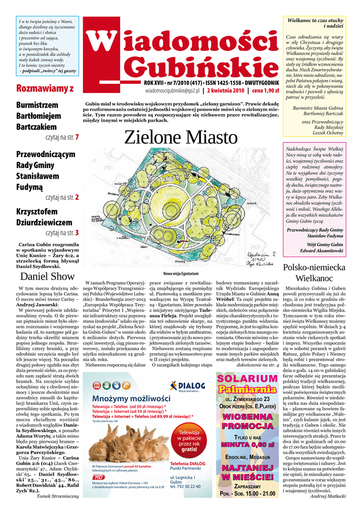 I w te święta jesteśmy z Wami, dlatego dzielimy się życzeniami: dużo radości i słońca i prezentów od zająca, pisanek bez liku w święconym koszyku, a w poniedziałek dla ochłody mały kubek zimnej wody. I to koniec życzeń niestety - podpisali „twórcy” tej gazety W iadomości __Gubińskie . . . ROK XVII nr 7/2010 (417) ISSN 1425-1558 DWUTYGODNIK [email protected] | 2 kwietnia 2010 | cena 1,90 zł Rozmawiamy z Burmistrzem Bartłomiejem Bartczakiem Gubin miał w środowisku wojskowym przydomek „zielony garnizon”. Prawie dekadę po rozformowaniu ostatniej jednostki wojskowej ponownie mówi się o zielonym mieście. Tym razem powodem są rozpoczynające się niebawem prace rewitalizacyjne, między innymi w miejskich parkach. Zielone Miasto czytaj na str. 7 Przewodniczącym Rady Gminy Stanisławem Fudymą czytaj na str. 2 Krzysztofem Dziurdziewiczem Wielkanoc to czas otuchy i nadziei Czas odradzania się wiary w siłę Chrystusa i drugiego człowieka. Życzymy, aby święta Wielkanocne przyniosły radość oraz wzajemną życzliwość. By stały się źródłem wzmocnienia ducha. Niech Zmartwychwstanie, które niesie odrodzenie, napełni Państwa pokojem i wiarą, niech da siłę w pokonywaniu trudności i pozwoli z ufnością patrzeć w przyszłość. Burmistrz Miasta Gubina Bartłomiej Bartczak oraz Przewodniczący Rady Miejskiej Leszek Ochotny Nadchodzące Święta Wielkiej Nocy niosą ze sobą wiele radości, wzajemnej życzliwości oraz ciepłej rodzinnej atmosfery. Na te wyjątkowe dni życzymy wszelkiej pomyślności, pogody ducha, świątecznego nastroju, dużo optymizmu oraz wiary w lepsze jutro. Żeby Wielkanoc obudziła wzajemną życzliwość i miłość. Wesołego Alleluja dla wszystkich mieszkańców Gminy Gubin życzą czytaj na str. 3 Przewodniczący Rady Gminy Stanisław Fudyma Carina Gubin rozgromiła w spotkaniu wyjazdowym Unię Kunice – Żary 6:2, a strzelecką formą błysnął Daniel Szydłowski. Wójt Gminy Gubin Edward Aksamitowski Daniel Show W tym meczu drużyną zdecydowanie lepszą była Carina. O meczu mówi trener Cariny – Andrzej Jaworski: W pierwszej połowie zdeklasowaliśmy rywala. O ile pierwsze piętnaście minut było okresem rozeznania i wzajemnego badania sił, to następne pół godziny trzeba określić mianem popisu jednego zespołu. Strzeliliśmy cztery bramki, a przy odrobinie szczęścia mogło być ich jeszcze więcej. Na początku drugiej połowy zgubiła nas zbyt duża pewność siebie, za co przyszło nam zapłacić stratą dwóch bramek. Na szczęście szybko ocknęliśmy się z chwilowej niemocy i jeszcze dwukrotnie moi zawodnicy zmusili do kapitulacji bramkarza Unii, czym zapewniliśmy sobie spokojną końcówkę tego spotkania. Po tym meczu chciałbym wyróżnić z wiadomych względów Daniela Szydłowskiego, a ponadto Adama Worytę, a także mimo błędu przy pierwszej bramce – Karola Matwiejczyka i Grzegorza Purczyńskiego. Unia Żary Kunice – Carina Gubin 2:6 (0:4) (Jacek Czermurzyński`47., Adam Chyliński`65. - Daniel Szydłowski`25.,`31.,`45.,`86., Robert Dawidziak`44., Rafał Zych`82.). Tomek Strzemieczny Nowa wizja Egzotarium W ramach Programu Operacyjnego Współpracy Transgranicznej Polska (Województwo Lubuskie) - Branderburgia 2007-2013 „Europejska Współpraca Terytorialna” Priorytet I „Wspieranie infrastruktury oraz poprawa stanu środowiska” udało się pozyskać na projekt „Zielona Ścieżka Gubin-Guben” w sumie około 6 milionów złotych. Pierwsza część inwestycji, ciąg pieszo-rowerowy, została przekazana do użytku mieszkańcom 14 grudnia ub. roku. Niebawem rozpoczną się dalsze prace związane z rewitalizacją znajdującego się pomiędzy ul. Piastowską a mostkiem prowadzącym na Wyspę Teatralną - Egzotarium, które powstało z inicjatywy nieżyjącego Tadeusza Firleja. Projekt uwzględnia też odnowienie skarpy, na której znajdowały się trybuny dla widzów w byłym amfiteatrze, i przystosowanie jej do nowo projektowanych zielonych tarasów. Niebawem zostaną rozpisane przetargi na wykonawstwo prac w II części projektu. O szczegółach kolejnego etapu budowy rozmawiamy z naczelnik Wydziału Europejskiego Urzędu Miasta w Gubinie Anną Wróbel: Ta część projektu zakłada modernizację parków miejskich, zieleńców oraz połączenie miejsc charakterystycznych z turystycznego punktu widzenia. Przypomnę, że jest to ogólna koncepcja zielonych tras naszego euromiasta. Obecnie mówimy o kolejnym etapie budowy - będzie to modernizacja i zagospodarowanie innych parków miejskich oraz małych terenów zielonych. dokończenie na str. 4 SOLARIUM Palmiarnia Mnożymy możliwości ul. Żymierskiego 23 Obok pizerii (os. E.Plater) Telewizja + Telefon (od 50 zł /miesiąc) * Telewizja + Internet (od 59 zł /miesiąc) * Telewizja + Internet + Telefon (od 89,99 zł /miesiąc) * WIOSENNA PROMOCJA *przez pierwszy rok Tylko u nas MINUTA 0,60 zł W Pakiecie Domowym ponad 40 kanałów telewizyjnych w cyfrowej jakości. Telefonia DIALOG Punkt Partnerski Możesz też wybrać Pakiet Domowy + HD z dodatkowymi kanałami, przez pierwszy rok za 0 zł! ul. Legnicka 1 Gubin tel. 792 50 22 40 654_reklama_03_03_10.indd 1 Ergoline, Megasun Najtaniej w mieście! Zapraszamy Pon. - Sob. 15.00 - 21.00 2010-03-08 16:36:57 Polsko-niemiecka Wielkanoc Mieszkańcy Gubina i Guben powoli przyzwyczaili się już do tego, iż co roku w grudniu obchodzona jest tradycyjna polsko-niemiecka Wigilia Miejska. Tymczasem w tym roku również święta Wielkanocy możemy spędzić wspólnie. W dniach 3-4 kwietnia zorganizowanych zostanie wiele ciekawych spotkań i imprez. Wszystko rozpocznie się w sobotni poranek w galerii Ratusz, gdzie Polacy i Niemcy będą robić i prezentować stroiki wielkanocne. Tego samego dnia o godz. 14.00 w gubińskiej farze odbędzie się prezentacja polskiej tradycji wielkanocnej, podczas której będzie możliwość poświęcenia świątecznych pokarmów. Również w niedzielę czeka n