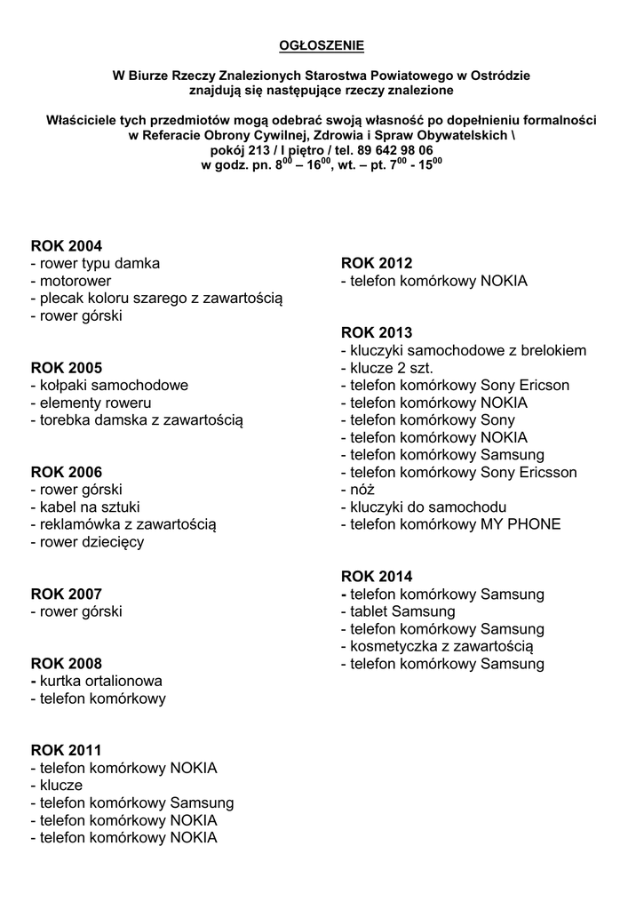 OGŁOSZENIE W Biurze Rzeczy Znalezionych Starostwa Powiatowego w Ostródzie znajdują się następujące rzeczy znalezione Właściciele tych przedmiotów mogą odebrać swoją własność po dopełnieniu formalności w Referacie Obrony Cywilnej, Zdrowia i Spraw Obywatelskich \ pokój 213 / I piętro / tel. 89 642 98 06 w godz. pn. 800 – 1600, wt. – pt. 700 - 1500 ROK 2004 - rower typu damka - motorower - plecak koloru szarego z zawartością - rower górski ROK 2005 - kołpaki samochodowe - elementy roweru - torebka damska z zawartością ROK 2006 - rower górski - kabel na sztuki - reklamówka z zawartością - rower dziecięcy ROK 2007 - rower górski ROK 2008 - kurtka ortalionowa - telefon komórkowy ROK 2011 - telefon komórkowy NOKIA - klucze - telefon komórkowy Samsung - telefon komórkowy NOKIA - telefon komórkowy NOKIA ROK 2012 - telefon komórkowy NOKIA ROK 2013 - kluczyki samochodowe z brelokiem - klucze 2 szt. - telefon komórkowy Sony Ericson - telefon komórkowy NOKIA - telefon komórkowy Sony - telefon komórkowy NOKIA - telefon komórkowy Samsung - telefon komórkowy Sony Ericsson - nóż - kluczyki do samochodu - telefon komórkowy MY PHONE ROK 2014 - telefon komórkowy Samsung - tablet Samsung - telefon komórkowy Samsung - kosmetyczka z zawartością - telefon komórkowy Samsung
