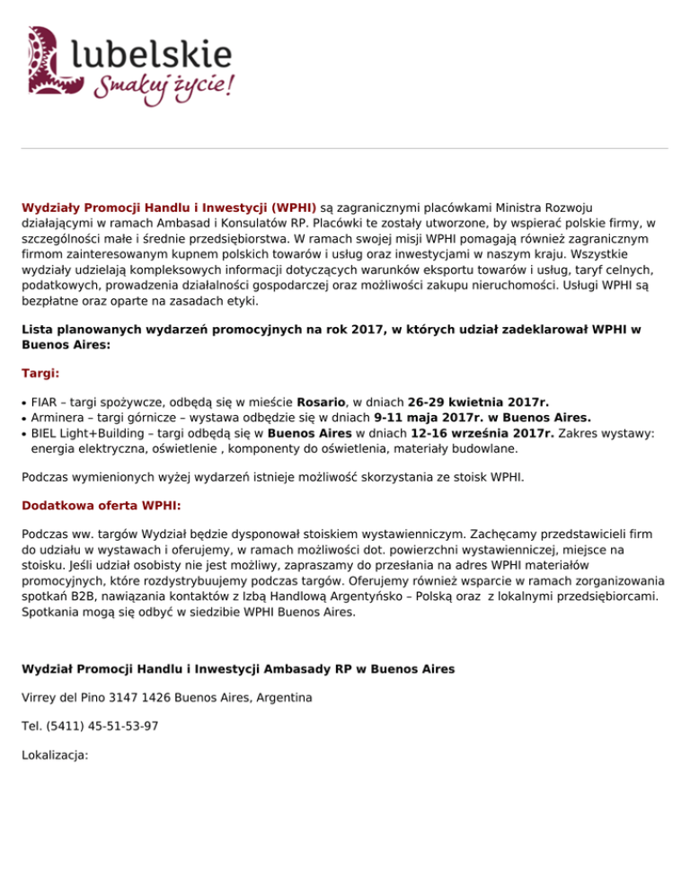 Wydziały Promocji Handlu i Inwestycji (WPHI) są zagranicznymi placówkami Ministra Rozwoju działającymi w ramach Ambasad i Konsulatów RP. Placówki te zostały utworzone, by wspierać polskie firmy, w szczególności małe i średnie przedsiębiorstwa. W ramach swojej misji WPHI pomagają również zagranicznym firmom zainteresowanym kupnem polskich towarów i usług oraz inwestycjami w naszym kraju. Wszystkie wydziały udzielają kompleksowych informacji dotyczących warunków eksportu towarów i usług, taryf celnych, podatkowych, prowadzenia działalności gospodarczej oraz możliwości zakupu nieruchomości. Usługi WPHI są bezpłatne oraz oparte na zasadach etyki. Lista planowanych wydarzeń promocyjnych na rok 2017, w których udział zadeklarował WPHI w Buenos Aires: Targi: ● ● ● FIAR – targi spożywcze, odbędą się w mieście Rosario, w dniach 26-29 kwietnia 2017r. Arminera – targi górnicze – wystawa odbędzie się w dniach 9-11 maja 2017r. w Buenos Aires. BIEL Light+Building – targi odbędą się w Buenos Aires w dniach 12-16 września 2017r. Zakres wystawy: energia elektryczna, oświetlenie , komponenty do oświetlenia, materiały budowlane. Podczas wymienionych wyżej wydarzeń istnieje możliwość skorzystania ze stoisk WPHI. Dodatkowa oferta WPHI: Podczas ww. targów Wydział będzie dysponował stoiskiem wystawienniczym. Zachęcamy przedstawicieli firm do udziału w wystawach i oferujemy, w ramach możliwości dot. powierzchni wystawienniczej, miejsce na stoisku. Jeśli udział osobisty nie jest możliwy, zapraszamy do przesłania na adres WPHI materiałów promocyjnych, które rozdystrybuujemy podczas targów. Oferujemy również wsparcie w ramach zorganizowania spotkań B2B, nawiązania kontaktów z Izbą Handlową Argentyńsko – Polską oraz z lokalnymi przedsiębiorcami. Spotkania mogą się odbyć w siedzibie WPHI Buenos Aires. Wydział Promocji Handlu i Inwestycji Ambasady RP w Buenos Aires Virrey del Pino 3147 1426 Buenos Aires, Argentina Tel. (5411) 45-51-53-97 Lokalizacja: Rodzaj: WPHI Strona internetowa: http://www.buenosaires.trade.gov.pl [1] Drukuj [2] Pobierz PDF [3] Pobierz DOC [4] Źródło: http://www.invest.lubelskie.pl/pl/wydzial-promocji-handlu-i-inwestycji-ambasady-rp-w-buenos-aires Odnośniki [1] http://www.buenosaires.trade.gov.pl [2] http://www.invest.lubelskie.pl/pl/print/893 [3] http://www.invest.lubelskie.pl/pl/printpdf/893 [4] http://www.invest.lubelskie.pl/pl/print/893?type=doc