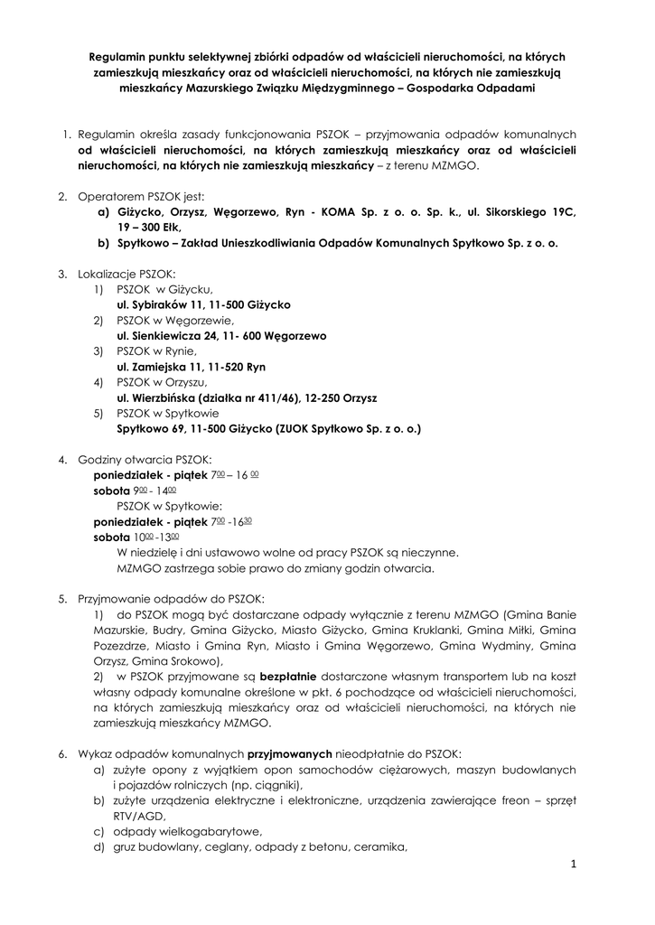 Regulamin punktu selektywnej zbiórki odpadów od właścicieli nieruchomości, na których zamieszkują mieszkańcy oraz od właścicieli nieruchomości, na których nie zamieszkują mieszkańcy Mazurskiego Związku Międzygminnego – Gospodarka Odpadami 1. Regulamin określa zasady funkcjonowania PSZOK – przyjmowania odpadów komunalnych od właścicieli nieruchomości, na których zamieszkują mieszkańcy oraz od właścicieli nieruchomości, na których nie zamieszkują mieszkańcy – z terenu MZMGO. 2. Operatorem PSZOK jest: a) Giżycko, Orzysz, Węgorzewo, Ryn - KOMA Sp. z o. o. Sp. k., ul. Sikorskiego 19C, 19 – 300 Ełk, b) Spytkowo – Zakład Unieszkodliwiania Odpadów Komunalnych Spytkowo Sp. z o. o. 3. Lokalizacje PSZOK: 1) PSZOK w Giżycku, ul. Sybiraków 11, 11-500 Giżycko 2) PSZOK w Węgorzewie, ul. Sienkiewicza 24, 11- 600 Węgorzewo 3) PSZOK w Rynie, ul. Zamiejska 11, 11-520 Ryn 4) PSZOK w Orzyszu, ul. Wierzbińska (działka nr 411/46), 12-250 Orzysz 5) PSZOK w Spytkowie Spytkowo 69, 11-500 Giżycko (ZUOK Spytkowo Sp. z o. o.) 4. Godziny otwarcia PSZOK: poniedziałek - piątek 700 – 16 00 sobota 900 - 1400 PSZOK w Spytkowie: poniedziałek - piątek 700 -1630 sobota 1000 -1300 W niedzielę i dni ustawowo wolne od pracy PSZOK są nieczynne. MZMGO zastrzega sobie prawo do zmiany godzin otwarcia. 5. Przyjmowanie odpadów do PSZOK: 1) do PSZOK mogą być dostarczane odpady wyłącznie z terenu MZMGO (Gmina Banie Mazurskie, Budry, Gmina Giżycko, Miasto Giżycko, Gmina Kruklanki, Gmina Miłki, Gmina Pozezdrze, Miasto i Gmina Ryn, Miasto i Gmina Węgorzewo, Gmina Wydminy, Gmina Orzysz, Gmina Srokowo), 2) w PSZOK przyjmowane są bezpłatnie dostarczone własnym transportem lub na koszt własny odpady komunalne określone w pkt. 6 pochodzące od właścicieli nieruchomości, na których zamieszkują mieszkańcy oraz od właścicieli nieruchomości, na których nie zamieszkują mieszkańcy MZMGO. 6. Wykaz odpadów komunalnych przyjmowanych nieodpłatnie do PSZOK: a) zużyte opony z wyjątkiem opon samochodów ciężarowych, maszyn budowlanych i pojazdów rolniczych (np. ciągniki), b) zużyte urządzenia elektryczne i elektroniczne, urządzenia zawierające freon – sprzęt RTV/AGD, c) odpady wielkogabarytowe, d) gruz budowlany, ceglany, odpady z betonu, ceramika, 1 e) baterie i akumulatory małogabarytowe, f) przeterminowane leki, g) chemikalia (detergenty, rozpuszczalniki, farby, tusze, farby drukarskie, kleje, lepiszcze i żywice, kwasy, alkalia, odczynniki fotograficzne, środki ochrony roślin), h) styropian opakowaniowy np. ze sprzętu RTV/AGD, i) papa, ondulina, j) okna, k) odpady zielone (skoszona trawa, gałęzie drzew itp.) Jeśli powyższe odpady są dostarczone do PSZOK w ilości wskazującej, że pochodzą one z prowadzonej działalności gospodarczej, pracownik PSZOK może odmówić ich przyjęcia (np. w przypadku, gdy odpady niebezpieczne zostaną dostarczone w opakowaniach przemysłowych, meble zostaną przywiezione w dużej ilości pojazdem ciężarowym, itp.). Odpady wytworzone w związku z prowadzoną działalnością gospodarczą mogą być odpłatnie dostarczone do Zakładu Unieszkodliwiania Odpadów Komunalnych w Spytkowie, Spytkowo 69, 11-500 Giżycko. 7. PSZOK nie przyjmuje takich odpadów jak: a) zmieszanych odpadów komunalnych, b) smoły, c) szyb samochodowych, d) szkła zbrojonego, hartowanego i wielowarstwowego, e) materiałów zawierających azbest, eternit, f) części samochodowych (tj. zderzaki, reflektory, itp.), g) styropianu budowlanego, h) zmieszanych odpadów budowlanych (np. gruz budowlany zmieszany z puszkami po farbach, rozpuszczalnikach, odpadami zmieszanymi komunalnymi powstałymi w wyniku bytowania pracowników oraz innymi odpadami niebezpiecznymi), płyt gipsowo-kartonowych, waty szklanej, i) odpadów medycznych, j) odpadów nieoznaczonych bez możliwości identyfikacji, w nieszczelnych opakowaniach. 8. PSZOK nie przyjmuje odpadów budowlanych i rozbiórkowych powstałych podczas robót budowlano-remontowych wykonywanych w ramach zleconych prac dla przedsiębiorstw prowadzących działalność gospodarczą. 9. Pracownik PSZOK ma prawo odmówić przyjęcia odpadu, jeśli byłoby to sprzeczne z przepisami prawa oraz mogłoby zagrażać zdrowiu lub życiu ludzi. 10. Pracownicy PSZOK nie wyjmują przywiezionych odpadów z pojazdu, wskazują miejsce gdzie należy je donieść i w którym pojemniku, koszu umieścić. Dostarczający odpady zielone w pojemnikach lub workach są zobowiązani do wysypywania odpadów z tych pojemników lub worków. 11. Pracownicy obsługi PSZOK przyjmując odpady sporządzają dokument potwierdzający dostarczenie odpadów zawierający: dane przekazującego odpady (imię i nazwisko); adres nieruchomości, z której pochodzą odpady; datę przyjęcia odpadu; rodzaj; kod i ilość (masę). 12. Prowadzący PSZOK nie wystawia właścicielom nieruchomości/mieszkańcom kart przekazania odpadów i faktur. 2 13. Oddający odpady do PSZOK ma obowiązek: - okazania dokumentu w celu potwierdzenia, że jest mieszkańcem gmin MZMGO; - wskazania adresu nieruchomości, z której pochodzą odpady; - rozładowania odpadów i umieszczenia ich w miejscu na ten cel przeznaczonym; - w przypadku odmowy przyjęcia odpadów, osoba dostarczająca odpady musi je natychmiast zabrać i zagospodarować zgodnie z obowiązującymi przepisami. 3