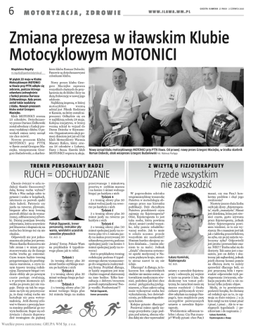 6 MOTORYZACJA, ZDROWIE W W W. I L A W A . W M . P L G A Z E T A I Ł A W S K A 27 MAJA - 2 CZERWCA 2016 Zmiana prezesa w iławskim Klubie Motocyklowym MOTONICI Magdalena Rogatty [email protected] W piątek 20 maja w Klubie Motocyklowym MOTONICI w Iławie przy PTTK odbyło się zebranie, podczas którego odwołano jednogłośnie z funkcji prezesa Dariusza Ziółkowskiego. Były prezes został także wydalony z klubu. Nowym prezesem klubu został Grzegorz Maciejko. Klub MOTONICI zrzesza 23 członków. Dotychczasowy prezes Dariusz Ziółkowski został odwołany z funkcji prezesa i wydalony z klubu. O powodach zmian nowy zarząd nie chce mówić. Nowym prezesem Klubu MOTONICI przy PTTK w Iławie został Grzegorz Maciejko, wiceprezesem Grzegorz Budzelewski, a skarbni- kiem klubu Roman Dobecki. Panowie są dotychczasowymi członkami klubu. Nowy prezes klubu Grzegorz Maciejko zaprasza wszystkich chętnych do przyłączenia się do klubu i liczy na dużą frekwencję w nowej jego odsłonie. Najbliższą imprezą, w której motocykliści wezmą udział jest Piknik Rodzinny w Karasiu, na który zostali zaproszeni. Odbędzie się on w najbliższą sobotę 28 maja. Kolejna inicjatywa, w której wezmą udział to wyjazd do Domu Dziecka w Szymanowie. Organizatorem akcji pomocy dzieciom jest już od 5 lat Klub Motocyklowy Warmia Mazury Riders, który zrzesza 28 członków z Lubawy, Iławy i Susza. Iławski klub MOTONICI wspiera tę akcję. Nowy zarząd klubu motocyklowego MOTONICI przy PTTK Iława. Od prawej: nowy prezes Grzegorz Maciejko, w środku skarbnik Roman Dobecki, obok wiceprezes Grzegorz Budzelewski Fot. Mateusz Partyga TRENER PERSONALNY RADZI Z W I Z Y TĄ U F I Z J O T E R A P E U T Y RUCH = ODCHUDZANIE Przede wszystkim nie zaszkodzić Chcecie ćwiczyć w celu redukcji tkanki tłuszczowej? Jaką formę ruchu wybrać? Wielu z Was zadaje sobie to pytanie i szuka w książkach, internecie co pozwoli spalić dużo kalorii. Patrzycie czy jazda na rowerze, pływanie, bieganie albo inny trening pozwoli zbliżyć się do wymarzonej, odtłuszczonej sylwetki. Dzisiaj pomijam kwestię odżywiania, która oczywiście jest kluczowa i skupiam się na ruchu bez którego też się nie obędzie. Odpowiedź nie jest jednoznaczna ale jedno jest pewne. Wasza tkanka tłuszczowa nie lubi zmian i w miarę przystosowywania się do danego ruchu trzeba go zmieniać. Czym innym będzie trening przygotowujący do przebiegnięcia maratonu, a czym innym typowy trening redukcyjny. Zaczynacie biegać i widzicie efekty ale po pewnym czasie postępy zwalniają, a w pewnym momencie sylwetka po prostu już nie reaguje. Dzieje się tak bo organizm na tyle się przyzwyczaja, że dany rodzaj ruchu nie kształtuje nic poza wytrzymałością. Jeśli chcemy celować w tłuszcz z precyzją lasera musimy poddawać go nowym bodźcom. Super się odżywiacie i chcecie doprowadzić treningiem do pięknej Patryk Dągowski, trener personalny, instruktor pływania, wieloletni uczestnik zawodów pływackich Fot. Arch. GI „letniej” formy. Pokaże Wam na przykładzie 6 tygodniowego planu jak to robić. Tydzień 1 2x trening siłowy plus 20 minut bardzo szybkiego marszu po każdym z nich Tydzień 2 2 x trening siłowy plus 30 minut wolnego biegu po każdym z nich Tydzień 3 3 x trening siłowy plus (10 minut wolnego biegu plus 5x1 minuta biegu na maksa Wszelkie prawa zastrzeżone. GRUPA WM Sp. z o.o. przerywanego 1 minutową przerwą w szybkim marszu i na koniec 5 minut wolnego biegu) po każdym z nich Tydzień 4 3 x trening siłowy plus 20 minut wolnej jazdy na rowerze po każdym z nich Tydzień 5 3 x trening siłowy plus 30 minut jazdy na rowerze po każdym z nich Tydzień 6 3 x trening siłowy plus (10 minut spokojnej jazdy na rowerze plus 10 x 1 minuta jazdy na maksa przerywanej 30 sekundową przerwą podczas spokojnej jazdy i na koniec 5 minut spokojnej jazdy na rowerze) Jest to przykładowy trening redukcyjny podczas 6 tygodniowego okresu wyznaczonego do osiągnięcia maksymalnej formy. Przykład dlatego, że każdy organizm jest inny i będzie reagował skuteczniej na inne bodźce. Tylko konsultacja z dobrym trenerem pozwoli zoptymalizować Twoje wysiłki. Pozdrawiam!!! Patryk Dągowski, trener personalny W poprzednim odcinku wtajemniczyliśmy troszeczkę Państwa w metodologię obranego przez nas kierunku publikacji. Dziś chciałbym Państwu przedstawić czym zajmuję się fizjoterapeuta? Otóż, fizjoterapeuta to jest taka osoba, która powinna chcieć, umieć i zrobić wszystko, żeby pomóc rehabilitowanej osobie. Jak to mnie w szkole uczono: przede wszystkim nie zaszkodzić! Hmmm bardzo okrojony zakres działania… (moim zdaniem to za mało). Jednak ,,dzięki” obecnemu systemowi opieki medycznej w Naszym pięknym kraju, niestety nieraz nawet to się nie udaje. Dlaczego? A dlatego, że lekarzem bez odpowiednich studiów nie możesz zostać, ratownikiem medycznym również, podobnie jak ktoś chce zostać pielęgniarką/pielęgniarzem, a Nasz zakres usług może wykonywać osoba bez wykształcenia, bez doświadczenia, po kilkunastogodzinnym kursie. Kolejne pytanie: dlaczego? Ponieważ mimo zgody naszego prezydenta i jego podpisu pod ustawą, obecna władza dalej nie chce wprowadzić Łukasz Kamiński, fizjoterapeuta Fot. Arch. ustawy o zawodzie fizjoterapeuty i odroczyła jej wejście w życie na prawie 2 lata. Ale skończmy ten temat polityczny, bo zaraz ktoś może się mocno rozzłościć :) Osoby ciekawe politycznych wywodów odsyłam na mojego Fanpage’a, tam znajdziecie parę szczegółów poświęconych ustawie o zawodzie fizjoterapeuty. Wielokrotnie odbieram telefon i słyszę: Czy Pan masuje? Wtedy pytam: chce Pan/i masaż, czy ma Pan/i konkretny problem i chęć jego zwalczenia? Niestety jeszcze duża liczba osób jak słyszy ,,fizjoterapeuta”, myśli ,,masażysta”. Masaż jest dziedziną, która jest również często, gęsto używana przez fizjoterapeutę, jednak dobry fizjoterapeuta powinien wiedzieć, że to