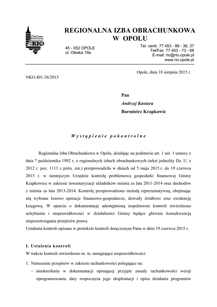 REGIONALNA IZBA OBRACHUNKOWA W OPOLU Tel. centr. 77 453 - 86 - 36, 37 Tel/Fax 77 453 - 73 - 68 E-mail: [email protected] www.rio.opole.pl 45 - 052 OPOLE ul. Oleska 19a Opole, dnia 18 sierpnia 2015 r. NKO.401-26/2015 Pan Andrzej Kasiura Burmistrz Krapkowic Wystąpienie pokontrolne Regionalna Izba Obrachunkowa w Opolu, działając na podstawie art. 1 ust. 1 ustawy z dnia 7 października 1992 r. o regionalnych izbach obrachunkowych (tekst jednolity Dz. U. z 2012 r. poz. 1113 z późn. zm.) przeprowadziła w dniach od 5 maja 2015 r. do 19 czerwca 2015 r. w tamtejszym Urzędzie kontrolę problemową gospodarki finansowej Gminy Krapkowice w zakresie inwentaryzacji składników mienia za lata 2011-2014 oraz dochodów z mienia za lata 2013-2014. Kontrolę przeprowadzono metodą reprezentatywną, obejmując nią wybrane losowo operacje finansowo-gospodarcze, dowody źródłowe oraz ewidencję księgową. W oparciu o dokumentację udostępnioną inspektorom kontroli stwierdzono uchybienia i nieprawidłowości w działalności Gminy będące głównie konsekwencją nieprzestrzegania przepisów prawa. Ustalenia kontroli opisano w protokole kontroli doręczonym Panu w dniu 19 czerwca 2015 r. I. Ustalenia kontroli W trakcie kontroli stwierdzono m. in. następujące nieprawidłowości: 1. Naruszenie przepisów w zakresie rachunkowości polegające na: nieokreśleniu w dokumentacji opisującej przyjęte zasady rachunkowości wersji oprogramowania, daty rozpoczęcia jego eksploatacji i opisu działania programów komputerowych używanych dla celów finansowo-księgowych oraz metod ustalania wyniku finansowego (protokół kontroli str. 6). Odpowiedzialność ponoszą Skarbnik i Burmistrz. niedostosowaniu planów kont do wymogów obowiązujących przepisów prawa poprzez: nieustalenie w planie kont dla organów podatkowych obowiązku prowadzenia ewidencji na koncie 991 – „Rozrachunki z inkasentami z tytułu pobieranych przez nich podatków podlegających przypisaniu na kontach podatników” (protokół kontroli str. 6), ujęcie w planie kont jednostki budżetowej konta 853 – „Fundusze celowe”, niewystępującego w jednostkach budżetowych będących urzędami jednostek samorządu terytorialnego (protokół kontroli str. 7). Odpowiedzialność ponoszą Skarbnik i Burmistrz. – nieokreśleniu wartości 387 działek gruntowych, co spowodowało wykazanie w bilansie jednostki zaniżonej wartości środków trwałych (protokół kontroli str. 48-49). Odpowiedzialność ponoszą były i obecny Skarbnik, były i obecny Burmistrz. zaewidencjonowaniu zwróconego przez nabywcę nieruchomości kosztu sporządzenia operatu szacunkowego w kwocie 400,00 zł jako dochodu z tytułu sprzedaży nieruchomości (protokół kontroli str. 96-97). Odpowiedzialność ponoszą Inspektor ds. księgowości budżetowej oraz Naczelnik Wydziału Budżetowo-Finansowego. 2. Nieprawidłowości w zakresie inwentaryzacji polegające na: a) zaniechaniu przeprowadzenia inwentaryzacji aktywów będących własnością innej jednostki prawidłową metodą spisu z natury (protokół kontroli str. 19-20). Odpowiedzialność ponosi Burmistrz. b) przeprowadzeniu inwentaryzacji środków trwałych o łącznej wartości 706 440,91 zł nieprawidłową metodą, tj. w drodze weryfikacji sald na dzień 31.10.2014 r. (protokół kontroli str. 22-23). Odpowiedzialność ponoszą Skarbnik i Burmistrz. c) przeprowadzeniu inwentaryzacji pożyczek udzielonych z budżetu gminy na kwotę 375 000,00 zł nieprawidłową metodą, tj. w drodze weryfikacji sald (protokół kontroli str. 35-39). Odpowiedzialność ponoszą Inspektor ds. księgowości budżetowej, Skarbnik i Burmistrz. 2 d) przeprowadzeniu inwentaryzacji własnego składnika aktywów powierzonego kontrahentowi nieprawidłową metodą, tj. w drodze weryfikacji sald na dzień 31.10.2014 r. (protokół kontroli str. 42-43). Odpowiedzialność ponoszą Podinspektor ds. księgowości budżetowej, Skarbnik i Burmistrz. e) nieprawidłowym określeniu w zarządzeniu o inwentaryzacji, terminu przeprowadzenia inwentaryzacji niektórych aktywów i pasywów, podlegających inwentaryzacji metodą weryfikacji sald, tj. na dzień 31.10.2014 r. oraz dokonanie inwentaryzacji gruntów, środków trwałych trudnodostępnych – grupa 2., wartości niematerialnych i prawnych, inwestycji rozpoczętych, sald figurujących na kontach 221/01 i 290/4 na dzień 31.10.2014 r., zamiast na dzień 31.12.2014 r. (protokół kontroli str. 44-45, 51-54). Odpowiedzialność ponoszą Skarbnik i Burmistrz. f) nieprawidłowym przeprowadzeniu inwentaryzacji gruntów poprzez porównanie zapisów ewidencji księgowej z danymi zawartymi w ewidencji gminnego zasobu nieruchomości oraz nieustalenie rzeczywistego stanu tych aktywów wskutek nieujęcia w księgach rachunkowych wartości 387 działek (protokół kontroli str. 45-50). Odpowiedzialność ponoszą Skarbnik i Burmistrz. g) nieprawidłowym przeprowadzeniu inwentaryzacji środków trwałych trudnodostępnych – grupa 2., bez porównania danych ksiąg rachunkowych z odpowiednimi dokumentami i weryfikacji realnej wartości tych składników oraz bez właściwego udokumentowania jej przeprowadzenia i rozliczenia (protokół kontroli str. 51-53). Odpowiedzialność ponoszą Skarbnik i Burmistrz. h) nieudokumentowaniu przeprowadzenia na ostatni dzień 2014 r. inwentaryzacji aktywów i pasywów figurujących w księgach rachunkowych budżetu na kontach: 140, 224, 240, 909, 960, 961 i w księgach Urzędu jako jednostki na kontach: 201, 224, 225, 229, 231, 234, 800, 840, 851,860 (protokół kontroli str. 54-56). Odpowiedzialność ponoszą Inspektorzy ds. księgowości budżetowej, Skarbnik i Burmistrz. i) niedostosowaniu zapisów instrukcji inwentaryzacyjnej do przepisów ustawy o rachunkowości w zakresie inwentaryzacji należności oraz gruntów, praw zakwalifikowanych do nieruchomości, środków trwałych, do których dostęp jest znacznie utrudniony (protokół kontroli str. 9