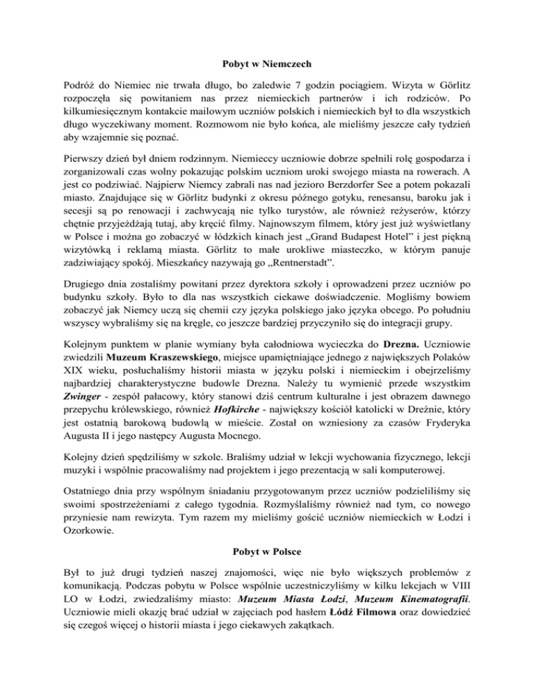 Pobyt w Niemczech Podróż do Niemiec nie trwała długo, bo zaledwie 7 godzin pociągiem. Wizyta w Görlitz rozpoczęła się powitaniem nas przez niemieckich partnerów i ich rodziców. Po kilkumiesięcznym kontakcie mailowym uczniów polskich i niemieckich był to dla wszystkich długo wyczekiwany moment. Rozmowom nie było końca, ale mieliśmy jeszcze cały tydzień aby wzajemnie się poznać. Pierwszy dzień był dniem rodzinnym. Niemieccy uczniowie dobrze spełnili rolę gospodarza i zorganizowali czas wolny pokazując polskim uczniom uroki swojego miasta na rowerach. A jest co podziwiać. Najpierw Niemcy zabrali nas nad jezioro Berzdorfer See a potem pokazali miasto. Znajdujące się w Görlitz budynki z okresu późnego gotyku, renesansu, baroku jak i secesji są po renowacji i zachwycają nie tylko turystów, ale również reżyserów, którzy chętnie przyjeżdżają tutaj, aby kręcić filmy. Najnowszym filmem, który jest już wyświetlany w Polsce i można go zobaczyć w łódzkich kinach jest „Grand Budapest Hotel” i jest piękną wizytówką i reklamą miasta. Görlitz to małe urokliwe miasteczko, w którym panuje zadziwiający spokój. Mieszkańcy nazywają go „Rentnerstadt”. Drugiego dnia zostaliśmy powitani przez dyrektora szkoły i oprowadzeni przez uczniów po budynku szkoły. Było to dla nas wszystkich ciekawe doświadczenie. Mogliśmy bowiem zobaczyć jak Niemcy uczą się chemii czy języka polskiego jako języka obcego. Po południu wszyscy wybraliśmy się na kręgle, co jeszcze bardziej przyczyniło się do integracji grupy. Kolejnym punktem w planie wymiany była całodniowa wycieczka do Drezna. Uczniowie zwiedzili Muzeum Kraszewskiego, miejsce upamiętniające jednego z największych Polaków XIX wieku, posłuchaliśmy historii miasta w języku polski i niemieckim i obejrzeliśmy najbardziej charakterystyczne budowle Drezna. Należy tu wymienić przede wszystkim Zwinger - zespół pałacowy, który stanowi dziś centrum kulturalne i jest obrazem dawnego przepychu królewskiego, również Hofkirche - największy kościół katolicki w Dreźnie, który jest ostatnią barokową budowlą w mieście. Został on wzniesiony za czasów Fryderyka Augusta II i jego następcy Augusta Mocnego. Kolejny dzień spędziliśmy w szkole. Braliśmy udział w lekcji wychowania fizycznego, lekcji muzyki i wspólnie pracowaliśmy nad projektem i jego prezentacją w sali komputerowej. Ostatniego dnia przy wspólnym śniadaniu przygotowanym przez uczniów podzieliliśmy się swoimi spostrzeżeniami z całego tygodnia. Rozmyślaliśmy również nad tym, co nowego przyniesie nam rewizyta. Tym razem my mieliśmy gościć uczniów niemieckich w Łodzi i Ozorkowie. Pobyt w Polsce Był to już drugi tydzień naszej znajomości, więc nie było większych problemów z komunikacją. Podczas pobytu w Polsce wspólnie uczestniczyliśmy w kilku lekcjach w VIII LO w Łodzi, zwiedzaliśmy miasto: Muzeum Miasta Łodzi, Muzeum Kinematografii. Uczniowie mieli okazję brać udział w zajęciach pod hasłem Łódź Filmowa oraz dowiedzieć się czegoś więcej o historii miasta i jego ciekawych zakątkach. Jako rozrywkę zaproponowaliśmy wspólną Laser – Game w Manufakturze, niezwykle wyczerpującą, ale także satysfakcjonującą grę, na którą wszyscy z niecierpliwością czekali. Kolejny dzień spędziliśmy wszyscy w Warszawie uczestnicząc wraz z przewodnikiem w interesującej wycieczce po stolicy. W czwartkowy ranek wszyscy spotkaliśmy się w Ozorkowie w Gimnazjum Nr 1, gdzie powitała nas p. dyrektor E. Skrupska. Nasi niemieccy i polscy goście oglądali przedstawienie w języku niemieckim „Der kleine Prinz” przygotowane przez uczniów klas drugich pod opieką p. M. Wolskiej oraz przedstawienie w języku polskim „Którędy droga?” pod opieką p. M. Wierzbińskiej. Na kolejnych zajęciach w języku niemieckim zaszczycili nas swoją obecnością Burmistrz Miasta Ozorkowa p. J. Socha, p. Naczelnik Wydziału Oświaty B. Kacprzak, p. Dyrektor E. Skrupska, wicedyrektor K. Pawlak oraz opiekunki grupy niemieckiej p. Ewa Frohne oraz p. Petra Puschbeck. Zajęcia dla uczniów o Ryszardzie Wagnerze przygotowała p. A. Wrześkiewicz. Po wspólnym obiedzie w naszym gimnazjum wszyscy udali się na spacer po mieście a nasi gimnazjaliści opowiadali o najciekawszych miejscach Ozorkowa w języku niemieckim. Mieliśmy okazję wpisać się do kroniki w Muzeum Miasta, odwiedziliśmy Bibliotekę Miejską oraz Kościół Ewangelicki. Popołudniu przy wspólnym podwieczorku w szkole przeprowadziliśmy ewaluację projektu. Był to quiz zawierający pytania w języku niemieckim dotyczące miasta Łodzi. Wspólnie z nauczycielami ewaluację przeprowadziła p. wicedyrektor ds. klas dwujęzycznych VIII LO w Łodzi Agnieszka Świca. Dla wszystkich było to również ciekawe doświadczenie, bowiem na pytania dotyczące Łodzi uczniowie musieli odpowiadać w języku niemieckim. Dla najlepszych przewidziane były nagrody. Z późniejszych relacji wiemy, że Niemcom pobyt w Polsce bardzo się podobał, a w szczególności piękne zabytki Łodzi i spokojna atmosfera Ozorkowa. Pobyt w Ozorkowie był ostatnim dniem wymiany, więc pożegnaliśmy się mając nadzieję na dalszy kontakt z uczuciem że uczestniczyliśmy w czymś wyjątkowym i ważnym…