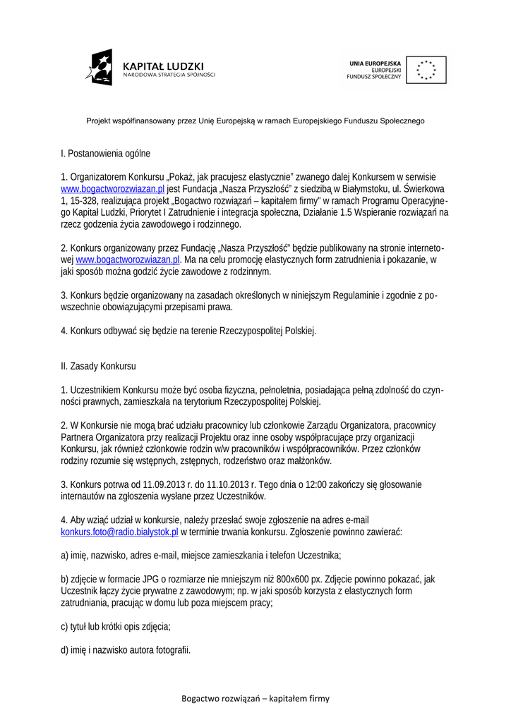 Projekt współfinansowany przez Unię Europejską w ramach Europejskiego Funduszu Społecznego I. Postanowienia ogólne 1. Organizatorem Konkursu „Pokaż, jak pracujesz elastycznie” zwanego dalej Konkursem w serwisie www.bogactworozwiazan.pl jest Fundacja „Nasza Przyszłość” z siedzibą w Białymstoku, ul. Świerkowa 1, 15-328, realizująca projekt „Bogactwo rozwiązań – kapitałem firmy" w ramach Programu Operacyjnego Kapitał Ludzki, Priorytet I Zatrudnienie i integracja społeczna, Działanie 1.5 Wspieranie rozwiązań na rzecz godzenia życia zawodowego i rodzinnego. 2. Konkurs organizowany przez Fundację „Nasza Przyszłość” będzie publikowany na stronie internetowej www.bogactworozwiazan.pl. Ma na celu promocję elastycznych form zatrudnienia i pokazanie, w jaki sposób można godzić życie zawodowe z rodzinnym. 3. Konkurs będzie organizowany na zasadach określonych w niniejszym Regulaminie i zgodnie z powszechnie obowiązującymi przepisami prawa. 4. Konkurs odbywać się będzie na terenie Rzeczypospolitej Polskiej. II. Zasady Konkursu 1. Uczestnikiem Konkursu może być osoba fizyczna, pełnoletnia, posiadająca pełną zdolność do czynności prawnych, zamieszkała na terytorium Rzeczypospolitej Polskiej. 2. W Konkursie nie mogą brać udziału pracownicy lub członkowie Zarządu Organizatora, pracownicy Partnera Organizatora przy realizacji Projektu oraz inne osoby współpracujące przy organizacji Konkursu, jak również członkowie rodzin w/w pracowników i współpracowników. Przez członków rodziny rozumie się wstępnych, zstępnych, rodzeństwo oraz małżonków. 3. Konkurs potrwa od 11.09.2013 r. do 11.10.2013 r. Tego dnia o 12:00 zakończy się głosowanie internautów na zgłoszenia wysłane przez Uczestników. 4. Aby wziąć udział w konkursie, należy przesłać swoje zgłoszenie na adres e-mail [email protected] w terminie trwania konkursu. Zgłoszenie powinno zawierać: a) imię, nazwisko, adres e-mail, miejsce zamieszkania i telefon Uczestnika; b) zdjęcie w formacie JPG o rozmiarze nie mniejszym niż 800x600 px. Zdjęcie powinno pokazać, jak Uczestnik łączy życie prywatne z zawodowym; np. w jaki sposób korzysta z elastycznych form zatrudniania, pracując w domu lub poza miejscem pracy; c) tytuł lub krótki opis zdjęcia; d) imię i nazwisko autora fotografii. Bogactwo rozwiązań – kapitałem firmy 5. Przystępując do konkursu, Uczestnik oświadcza, że: a) wyraża zgodę na publikację swojego wizerunku; b) jeżeli na fotografii występują inne osoby, to posiada zgodę na publikację ich wizerunku; c) jeżeli na fotografii jest osoba nieletnia, to Uczestnik posiada zgodę opiekuna prawnego na publikację wizerunku nieletniego; d) posiada pełnię praw autorskich osobistych i majątkowych do pracy konkursowej; e) zgłoszone do Konkursu fotografie konkursowe nie naruszają praw osób trzecich i innych podmiotów; f) udziela organizatorowi Konkursu zgodę na bezpłatną publikację zdjęć w ramach realizacji Konkursu; g) prace muszą być pracami autorskimi, nie mogą być wcześniej wykorzystywane ani rozpowszechniane komercyjnie przez inne podmioty (firmy) i nie mogą być obciążone roszczeniami osób trzecich; h) w przypadku pojawienia się ze strony osób trzecich ewentualnych roszczeń wynikających z tytułu naruszenia praw autorskich lub innych praw osobistych przez Uczestnika, Uczestnik zobowiązany będzie, jako osoba wyłącznie odpowiedzialna, do pokrycia wszelkich szkód oraz roszczeń odszkodowawczych. 7. Każdy Uczestnik może zgłosić tylko jedno zdjęcie do konkursu. 8. Zgłoszenia, w tym zdjęcia, które zawierają treści wulgarne, słowa powszechnie uważane za obraźliwe, opisy, które mogą być uznane za naruszające prawo lub dobra osobiste osób trzecich, a także propagujące przemoc lub dyskryminację nie będą brane pod uwagę w Konkursie. III. Rozstrzygnięcie Konkursu i zasady przyznawania nagród 1. Zdjęcia będą publikowane na stronie www.bogactworozwiazan.pl. 2. Na zdjęcia będzie można głosować od 11.09.2013 r. do 11.10.2013 r. do 12:00. 3. Głosować może każda osoba odwiedzająca stronę konkursową www.bogactworozwiazan.pl. 4. W Konkursie można zagłosować raz dziennie z danego adresu IP. 5. Laureatami Konkursu zostaną osoby, które zdobędą największą liczbę głosów oddanych przez internautów. W przypadku, kiedy Uczestnicy na koniec Konkursu będą mieli równą liczbę głosów, o zwycięstwie decyduje kolejność przysłania zgłoszenia. Premiowane będzie zgłoszenie wysłane wcześniej. Bogactwo rozwiązań – kapitałem firmy IV Nagrody 1. W Konkursie wygrać można następujące nagrody: a) nagroda pierwsza: zewnętrzny dysk twardy 500 GB, podkładka chłodząca pod laptopa, torba ekologiczna z logo projektu „Bogactwo rozwiązań – kapitałem firmy", książka „Małe dzieci – duży kłopot?”; b) nagroda druga: radiobudzik, bezprzewodowa mysz optyczna, słuchawki, torba ekologiczna z logo projektu „Bogactwo rozwiązań – kapitałem firmy", książka „Małe dzieci – duży kłopot?”; c) nagroda trzecia: podróżny, uniwersalny zasilacz do notebooków, lampka diodowa do notebooka, torba ekologiczna z logo projektu „Bogactwo rozwiązań – kapitałem firmy", książka „Małe dzieci – duży kłopot?”. 2. Zwycięzcy o wygranej zostaną poinformowani drogą mailową. Na portalu www.bogactworozwiazan.pl opublikowana zostanie lista zwycięzców. 3. Nagrody będą wysyłane tylko na terytorium Rzeczypospolitej Polskiej. 4. Wysyłka nagród nastąpi w ciągu 5 dni roboczych od dnia zakończenia głosowania. 5. Za wygraną nagrodę nie przysługuje ekwiwalent pieniężny ani rzeczowy, laureaci Konkursu nie mają prawa scedować nagrody na inne osoby. 6. Organizator oświadcza, że wartość nagród nie przekracza 760 zł, w związku z czym zgodnie z przepisami ustawy o podatku dochodowym od osób fizycznych nagrody są zwolnione z opodatkowani