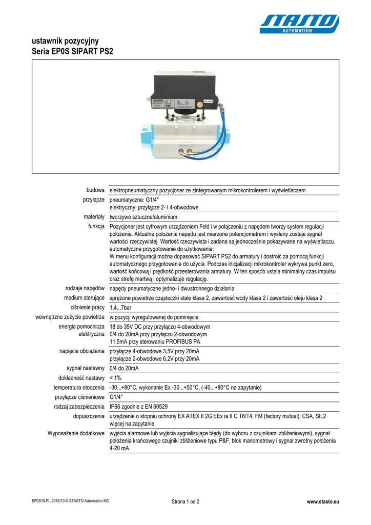 ustawnik pozycyjny Seria EP0S SIPART PS2 budowa elektropneumatyczny pozycjoner ze zintegrowanym mikrokontrolerem i wyświetlaczem przyłącze pneumatyczne: G1/4" elektryczny: przyłącze 2- i 4-obwodowe materiały tworzywo sztuczne/aluminium funkcja Pozycjoner jest cyfrowym urządzeniem Feld i w połączeniu z napędem tworzy system regulacji położenia. Aktualne położenie napędu jest mierzone potencjometrem i wysłany zostaje sygnał wartości rzeczywistej. Wartość rzeczywista i zadana są jednocześnie pokazywane na wyświetlaczu. automatyczne przygotowanie do użytkowania: W menu konfiguracji można dopasować SIPART PS2 do armatury i dostroić za pomocą funkcji automatycznego przygotowania do użycia. Podczas inicjalizacji mikrokontroler wykrywa punkt zero, wartość końcową i prędkość przesterowania armatury. W ten sposób ustala minimalny czas impulsu oraz strefę martwą i optymalizuje regulację. rodzaje napędów napędy pneumatyczne jedno- i dwustronnego działania medium sterujące sprężone powietrze cząsteczki stałe klasa 2, zawartość wody klasa 2 i zawartość oleju klasa 2 ciśnienie pracy 1,4...7bar wewnętrzne zużycie powietrza w pozycji wyregulowanej do pominięcia energia pomocnicza 18 do 35V DC przy przyłączu 4-obwodowym elektryczna 0/4 do 20mA przy przyłączu 2-obwodowym 11,5mA przy sterowaniu PROFIBUS PA napięcie obciążenia przyłącze 4-obwodowe 3,5V przy 20mA przyłącze 2-obwodowe 6,2V przy 20mA sygnał nastawny 0/4 do 20mA dokładność nastawy < 1% temperatura otoczenia -30...+80°C, wykonanie Ex -30...+50°C, (-40...+80°C na zapytanie) przyłącze ciśnieniowe G1/4" rodzaj zabezpieczenia IP66 zgodnie z EN 60529 dopuszczenia urządzenie o stopniu ochrony EX ATEX II 2G EEx ia II C T6/T4, FM (factory mutual), CSA, SIL2 więcej na zapytanie Wyposażenie dodatkowe wyjścia alarmowe lub wyjścia sygnalizujące błędy (do wyboru z czujnikami zbliżeniowymi), sygnał położenia krańcowego czujniki zbliżeniowe typu P&F, blok manometrowy i sygnał zwrotny położenia 4-20 mA EP0S10-PL-2016/10 © STASTO Automation KG Strona 1 od 2 www.stasto.eu oznaczenie typu EP0S 10 -Z A 10 do napędów jednostronnego działania P sygnał zwrotny położenia 4-20 mA 11 do napędów dwustronnego działania Z pusta pozycja 12 do napędów jednostronnego działania, HART 13 do napędów dwustronnego działania, HART 14 do napędów jednostronnego działania, PROFIBUS PA 15 do napędów dwustronnego działania, PROFIBUS PA M -EX A moduł alarmowy M blok manometrowy EX ochrona Ex E wyłącznik krańcowy-SIA Z pusta pozycja M mikroprzełączniki Z pusta pozycja wymiary obudowa listwa przyłączeniowa kompnenty urządzenia 1 wejście: wlot powietrze 6.1 dławik Y1 do napędów dwustronnego działania 11 zaciski przyłączeniowe moduły opcjonalne 2 wyjście: ciśnienie nastawne Y1 6.2 dławik Y2 do napędów dwustronnego działania 12 zaślepka 3 wyświetlacz 7 tłumik 13 złączka kabla 4 wyjście: ciśnienie nastawne Y2* 8 przełącznik przekładni 14 mocowania płyty na pokrywie 5 przyciski obsługowe 9 pokrętło regulacji sprzęgła poślizgowego 15 przełącznik powietrza oczyszczającego 6 dławik Y1 do napędów jednostronnego działania 10 płyta głównego obwodu rysunki poglądowe Zmiany w konstrukcji, wymiarach i wykonaniu materiałowym zastrzeżone EP0S10-PL-2016/10 © STASTO Automation KG Strona 2 od 2 www.stasto.eu