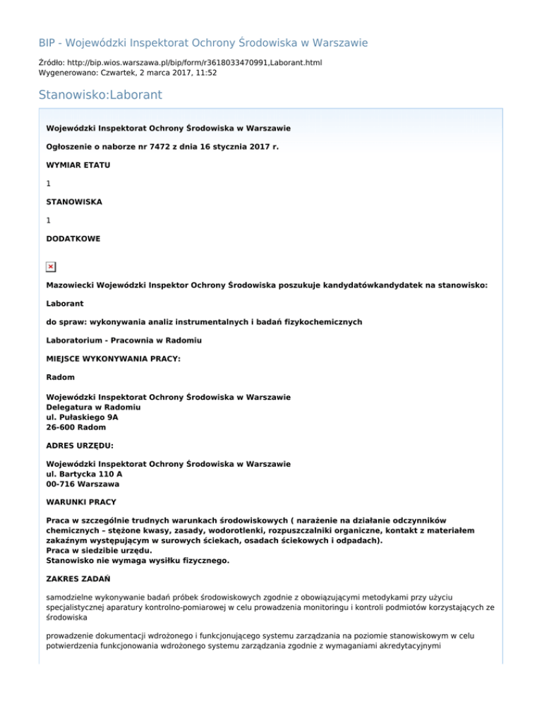BIP - Wojewódzki Inspektorat Ochrony Środowiska w Warszawie Źródło: http://bip.wios.warszawa.pl/bip/form/r3618033470991,Laborant.html Wygenerowano: Czwartek, 2 marca 2017, 11:52 Stanowisko:Laborant Wojewódzki Inspektorat Ochrony Środowiska w Warszawie Ogłoszenie o naborze nr 7472 z dnia 16 stycznia 2017 r. WYMIAR ETATU 1 STANOWISKA 1 DODATKOWE Mazowiecki Wojewódzki Inspektor Ochrony Środowiska poszukuje kandydatówkandydatek na stanowisko: Laborant do spraw: wykonywania analiz instrumentalnych i badań fizykochemicznych Laboratorium - Pracownia w Radomiu MIEJSCE WYKONYWANIA PRACY: Radom Wojewódzki Inspektorat Ochrony Środowiska w Warszawie Delegatura w Radomiu ul. Pułaskiego 9A 26-600 Radom ADRES URZĘDU: Wojewódzki Inspektorat Ochrony Środowiska w Warszawie ul. Bartycka 110 A 00-716 Warszawa WARUNKI PRACY Praca w szczególnie trudnych warunkach środowiskowych ( narażenie na działanie odczynników chemicznych – stężone kwasy, zasady, wodorotlenki, rozpuszczalniki organiczne, kontakt z materiałem zakaźnym występującym w surowych ściekach, osadach ściekowych i odpadach). Praca w siedzibie urzędu. Stanowisko nie wymaga wysiłku fizycznego. ZAKRES ZADAŃ samodzielne wykonywanie badań próbek środowiskowych zgodnie z obowiązującymi metodykami przy użyciu specjalistycznej aparatury kontrolno-pomiarowej w celu prowadzenia monitoringu i kontroli podmiotów korzystających ze środowiska prowadzenie dokumentacji wdrożonego i funkcjonującego systemu zarządzania na poziomie stanowiskowym w celu potwierdzenia funkcjonowania wdrożonego systemu zarządzania zgodnie z wymaganiami akredytacyjnymi wdrażanie do stosowania nowych metod badawczych i znajomość ich walidowania uczestnictwo w porównaniach między laboratoryjnych i badaniach biegłości w celu potwierdzenia kompetencji laboratorium do wykonania określonych badań WYMAGANIA NIEZBĘDNE Wykształcenie: średnie umiejętność realizacji metod opisanych w PN znajomość ustawy o służbie cywilnej oraz ustawy o wojewodzie i administracji rządowej w województwie znajomość zarządzenia w sprawie wytycznych w zakresie przestrzegania zasad służby cywilnej oraz w sprawie zasad etyki korpusu służby cywilnej umiejętność wykonywania analiz instrumentalnych i badań fizykochemicznych Posiadanie obywatelstwa polskiego Korzystanie z pełni praw publicznych Nieskazanie prawomocnym wyrokiem za umyślne przestępstwo lub umyśle przestępstwo skarbowe WYMAGANIA DODATKOWE Wykształcenie: wyższe język angielski podstawowy DOKUMENTY I OŚWIADCZENIA NIEZBĘDNE Życiorys/CV i list motywacyjny Kopie dokumentów potwierdzających spełnienie wymagania niezbędnego w zakresie wykształcenia Oświadczenie o posiadaniu obywatelstwa polskiego albo kopia dokumentu potwierdzającego posiadanie polskiego obywatelstwa Oświadczenie o wyrażeniu zgody na przetwarzanie danych osobowych do celów naboru Oświadczenie o korzystaniu z pełni praw publicznych Oświadczenie o nieskazaniu prawomocnym wyrokiem za umyślne przestępstwo lub umyślne przestępstwo skarbowe DOKUMENTY I OŚWIADCZENIA DODATKOWE kopia dokumentu potwierdzającego niepełnosprawność - w przypadku kandydatek/kandydatów, zamierzających skorzystać z pierwszeństwa w zatrudnieniu w przypadku, gdy znajdą się w gronie najlepszych kandydatek/kandydatów Kopie dokumentów potwierdzających spełnienie wymagania dodatkowego w zakresie wykształcenia TERMINY I MIEJSCE SKŁADANIA DOKUMENTÓW Dokumenty należy złożyć do: 26 stycznia 2017 r. Decyduje data: stempla pocztowego / osobistego dostarczenia oferty do urzędu Miejsce składania dokumentów: Wojewódzki Inspektorat Ochrony Środowiska w Warszawie Delegatura w Radomiu ul. Pułaskiego 9A 26-600 Radom z dopiskiem: "Oferta pracy - Laborant" INNE INFORMACJE: W miesiącu poprzedzającym datę upublicznienia ogłoszenia wskaźnik zatrudnienia osób niepełnosprawnych w urzędzie, w rozumieniu przepisów o rehabilitacji zawodowej i społecznej oraz zatrudnianiu osób niepełnosprawnych, nie wynosi co najmniej 6%. Nasz urząd jest pracodawcą równych szans i wszystkie aplikacje są rozważane z równą uwagą bez względu na płeć, wiek, niepełnosprawność, rasę, narodowość, przekonania polityczne, przynależność związkową, pochodzenie etniczne, wyznanie, orientacje seksualną czy też jakąkolwiek inną cechę prawnie chronioną. Procedura naboru składa się z kilku etapów. I etap obejmuje sporządzenie listy kandydatów spełniających wymagania formalne. II etap- test wiedzy, do którego zakwalifikowane zostają wszystkie osoby spełniające wymagania formalne określone w ogłoszeniu. III etap - rozmowa kwalifikacyjna. IV etap - zamieszczenie wyniku naboru. W przypadku gdy II i III etap naboru odbywa się tego samego dnia, listy osób zakwalifikowanych do III etapu nie zamieszcza się. Test wiedzy obejmuje pytania ogólne z zakresu funkcjonowania administracji rządowej w województwie, ustawę o służbie cywilnej oraz pytania specjalistyczne dotyczące stanowiska, na które prowadzony jest nabór. Listy kandydatek/kandydatów zakwalifikowanych do dalszych etapów procedury naboru publikowane są na stronie internetowej BIP WIOŚ oraz w miejscu powszechnie dostępnym w siedzibie urzędu, przynajmniej na 3 dni kalendarzowe przed planowanym terminem kolejnego etapu wraz z informacją o terminie przeprowadzania testu wiedzy lub rozmowy kwalifikacyjnej. Wymagane dokumenty ( życiorys, list motywacyjny) i oświadczenia składane przez kandydatki/kandydatów ubiegających się o pracę powinny być własnoręcznie podpisane. Brak podpisu na wymienionych dokumentach wyklucza kandydatkę/kandydata z uczestniczenia w dalszych etapach procedury naboru. Do składania dokumentów zachęcamy również osoby niepełnosprawne, które spełniają wymagania określone w niniejszym ogłoszeniu. Osoba zatrudniona na ww. stanowisku, zgodnie z art. 78 ust. 4 ustawy z dnia 21 listopada 2008 r. o służbie cywilne