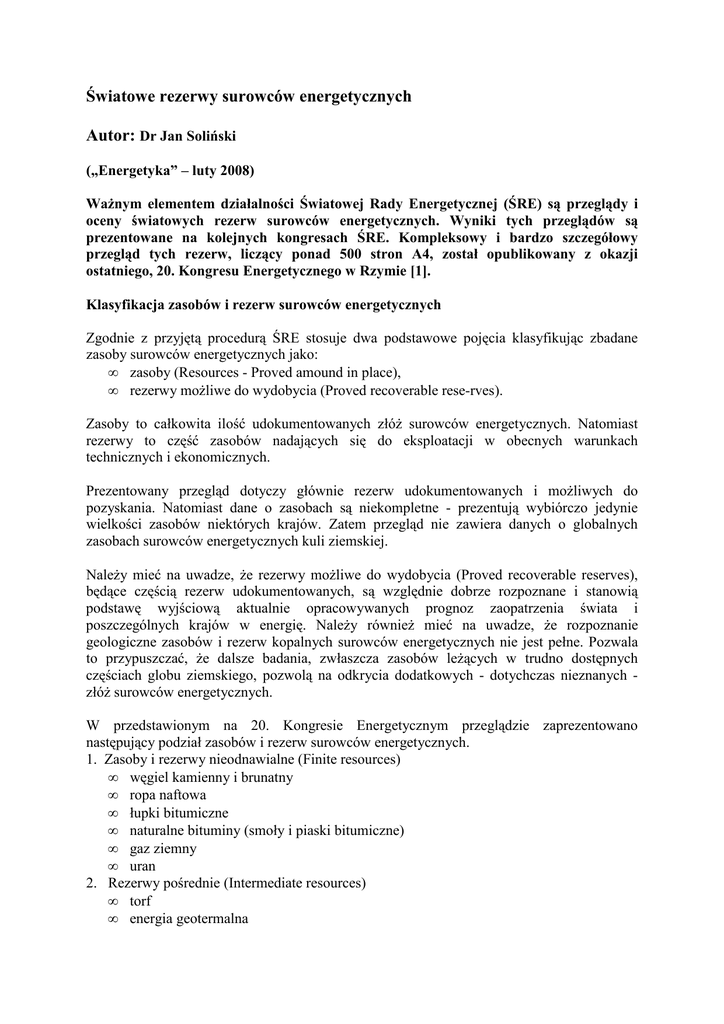 Światowe rezerwy surowców energetycznych Autor: Dr Jan Soliński („Energetyka” – luty 2008) WaŜnym elementem działalności Światowej Rady Energetycznej (ŚRE) są przeglądy i oceny światowych rezerw surowców energetycznych. Wyniki tych przeglądów są prezentowane na kolejnych kongresach ŚRE. Kompleksowy i bardzo szczegółowy przegląd tych rezerw, liczący ponad 500 stron A4, został opublikowany z okazji ostatniego, 20. Kongresu Energetycznego w Rzymie [1]. Klasyfikacja zasobów i rezerw surowców energetycznych Zgodnie z przyjętą procedurą ŚRE stosuje dwa podstawowe pojęcia klasyfikując zbadane zasoby surowców energetycznych jako: • zasoby (Resources - Proved amound in place), • rezerwy moŜliwe do wydobycia (Proved recoverable rese-rves). Zasoby to całkowita ilość udokumentowanych złóŜ surowców energetycznych. Natomiast rezerwy to część zasobów nadających się do eksploatacji w obecnych warunkach technicznych i ekonomicznych. Prezentowany przegląd dotyczy głównie rezerw udokumentowanych i moŜliwych do pozyskania. Natomiast dane o zasobach są niekompletne - prezentują wybiórczo jedynie wielkości zasobów niektórych krajów. Zatem przegląd nie zawiera danych o globalnych zasobach surowców energetycznych kuli ziemskiej. NaleŜy mieć na uwadze, Ŝe rezerwy moŜliwe do wydobycia (Proved recoverable reserves), będące częścią rezerw udokumentowanych, są względnie dobrze rozpoznane i stanowią podstawę wyjściową aktualnie opracowywanych prognoz zaopatrzenia świata i poszczególnych krajów w energię. NaleŜy równieŜ mieć na uwadze, Ŝe rozpoznanie geologiczne zasobów i rezerw kopalnych surowców energetycznych nie jest pełne. Pozwala to przypuszczać, Ŝe dalsze badania, zwłaszcza zasobów leŜących w trudno dostępnych częściach globu ziemskiego, pozwolą na odkrycia dodatkowych - dotychczas nieznanych złóŜ surowców energetycznych. W przedstawionym na 20. Kongresie Energetycznym przeglądzie zaprezentowano następujący podział zasobów i rezerw surowców energetycznych. 1. Zasoby i rezerwy nieodnawialne (Finite resources) • węgiel kamienny i brunatny • ropa naftowa • łupki bitumiczne • naturalne bituminy (smoły i piaski bitumiczne) • gaz ziemny • uran 2. Rezerwy pośrednie (Intermediate resources) • torf • energia geotermalna 3. Źródła odnawialne (Perpetual resources) • energia wodna • bioenergia • energia słoneczna • energia wiatru 4. Inne źródła odnawialne (Other perpetual resources) • energia przypływów i odpływów • energia fal morskich • ciepło oceanów Rezerwy nieodnawialne - kopalne surowce energetyczne Rezerwy nieodnawialnych surowców energetycznych przedstawiono w tabeli 1. Tabela 1 Światowe rezerwy nieodnawialnych surowców energetycznych - stan na koniec 2005 r. [1] Wyszczególnienie Węgiel kamienny, mld t w tym: - bitumiczny - subbitumiczny Węgiel brunatny, mld t Ropa naftowa, mld baryłek Olej w łupkach bitumicznych, mld baryłek Naturalne bituminy, mld baryłek Gaz ziemny, bil m3 Rezerwy (R) Produkcja w 2005 Wskaźnik R:P, lata (P) 697,7 5,03 139 430,9 266,8 149,8 • • 0,87 • • 172 12151) 29,6 41 28261) 0,005 • 3061) 0,60 510 176 2,8 63 1) 1 toe to ok. 7,3 baryłki Węgiel kamienny Największe rezerwy tego węgla posiadają: USA, Federacja Rosyjska, Chiny, Indie, Afryka Płd., Australia, Ukraina, Kazachstan i Polska. Znaczne rezerwy węgla kamiennego posiadają równieŜ Niemcy, jednak z uwagi na trudności i wysokie koszty jego wydobycia rezerwy te uznano jako nieodpowiadające kryteriom rezerw. Prezentowane w przeglądzie dane dotyczące światowych zasobów węgla są niekompletne, pozwalają jednak na stwierdzenie, Ŝe zasoby te są co najmniej 4-krotnie większe od rezerw tego węgla. Węgiel brunatny Największe rezerwy węgla brunatnego posiadają: Australia, USA, Chiny, Serbia i Niemcy. Natomiast światowe zasoby tego węgla są - podobnie jak węgla kamiennego - znacznie większe. Znajdują się one w wielu krajach, zwłaszcza w USA, Republice Rosyjskiej, Pakistanie, Indiach, Niemczech i w Polsce. Ropa naftowa Około 2/3 rezerw ropy naftowej posiadają: kraje Bliskiego Wschodu, Arabia Saudyjska, Iran, Irak, Kuwejt i Zjednoczone Emiraty Arabskie. Znaczące rezerwy tej ropy posiadają: Nigeria, Wenezuela, Federacja Rosyjska, Meksyk, Kazachstan, Libia, USA i Kanada. Światowe zasoby ropy naftowej są znacznie większe od rezerw, świadczą o tym odkrycia nowych złóŜ, lecz w przeglądzie brak danych dotyczących globalnych zasobów tej ropy. Łupki bitumiczne i naturalne bituminy Światowe zasoby łupków bitumicznych i naturalnych bituminów są bardzo duŜe. Rezerwy oleju zawarte w tych bituminach są ponad 2-krotnie większe niŜ rezerwy ropy naftowej. Dotychczas pozyskiwanie oleju z bituminów było bardziej kosztowne niŜ z ropy naftowej. Natomiast obecnie, przy wysokiej cenie ropy, eksploatacja złóŜ bituminów staje się opłacalna. Zatem rezerwy łupków i piasków bitumicznych to ogromne źródło pozyskania w przyszłości paliw ciekłych. Największe rezerwy łupków bitumicznych znajdują się: w USA i w Federacji Rosyjskiej. Natomiast największe rezerwy naturalnych bituminów, zwłaszcza piasków bitumiczny, posiada Kanada. Gaz ziemny Największe rezerwy gazu ziemnego znajdują się w Federacji Rosyjskiej, stanowią one ok. 1/3 światowych rezerw tego paliwa. 17% tych rezerw posiada Iran. Pozostałe 50% to głównie rezerwy gazu w krajach Półwyspu Arabskiego, USA, Algierii, Wenezueli, Nigerii, Iraku, a w Europie w Norwegii i Holandii. Dodać naleŜy, Ŝe w wielu krajach oprócz rezerw występują duŜe zasoby gazu ziemnego w kategorii Resources, zwłaszcza w Federacji Rosyjskiej, Iranie, Kanadzie, Wenezueli, Meksyku, Indonezji, Brazylii, Holandii i Norwegii. Z wstępnych ocen wynika, Ŝe zasoby tego gazu są ok. 3-krotnie większe niŜ jego rezerwy. Uran Rezerwy i zasoby uranu są znaczne. Są one klasyfikowane wg ko