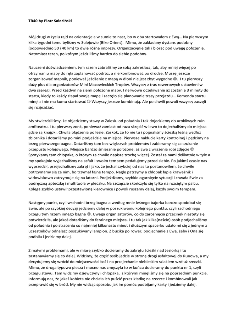 TR40 by Piotr Sałaciński Mój drugi w życiu rajd na orientacje a w sumie to nasz, bo w obu startowałem z Ewą… Na pierwszym kilka tygodni temu byliśmy w Sulejowie (Bike Orient). Mimo, że zakładany dystans podobny (odpowiednio 50 i 40 km) to dwie różne imprezy. Organizacyjnie tak i biorąc pod uwagę położenie. Natomiast teren, po którym jeździliśmy bardzo do siebie podobny. Nauczeni doświadczeniem, tym razem zabraliśmy ze sobą zakreślacz, tak, aby mniej więcej po otrzymaniu mapy do ręki zaplanować podróż, a nie kombinować po drodze. Muszę jeszcze zorganizować mapnik, ponieważ jeżdżenie z mapą w dłoni nie jest zbyt wygodne . I tu pierwszy duży plus dla organizatorów Mini Mazowieckich Tropów. Wszyscy z tras rowerowych ustawieni w dwa szeregi. Przed każdym na ziemi położone mapy. I nerwowe oczekiwanie aż zostanie 3 minuty do startu, kiedy to każdy złapał swoją mapę i zaczęło się planowanie trasy przejazdu… Komenda startu minęła i nie ma komu startować Wszyscy jeszcze kombinują. Ale po chwili powoli wszyscy zaczęli się rozjeżdżać. My stwierdziliśmy, że objedziemy stawy w Zalesiu od południa i tak dojedziemy do urokliwych ruin amfiteatru. I tu pierwszy zonk, ponieważ zamiast od razu skręcić w lewo to dojechaliśmy do miejsca gdzie są knajpki. Chwila błądzenia po lesie. Zaskok, że to nie tu i pognaliśmy ścieżką leśną wzdłuż zbiornika i dotarliśmy po mini podjeździe na miejsce. Pierwsze nakłucie karty kontrolnej i pędzimy na brzeg pierwszego bagna. Dotarliśmy tam bez większych problemów i zabieramy się za szukanie przepustu kolejowego. Miejsce bardzo śmiesznie położone, aż Ewa z wrażenia robi zdjęcie Spotykamy tam chłopaka, o którym za chwile napisze trochę więcej. Został za nami delikatnie w tyle a my spokojnie wyjechaliśmy na asfalt i swoim tempem pedałujemy przed siebie. Po jakimś czasie nas wyprzedził, przejechaliśmy zakręt i jako, że jechał szybciej od nas to postanowiłem, że chwile potrzymamy się za nim, bo trzymał fajne tempo. Nagle patrzymy a chłopak łapie krawężnik i widowiskowo zatrzymuje się na latarni. Podjeżdżamy, szybkie ogarnięcie sytuacji i chwała Ewie za podręczną apteczkę i multitoola w plecaku. Na szczęście skończyło się tylko na rozciętym palcu. Kolega szybko ustawił przestawioną kierownice i powoli ruszamy dalej, każdy swoim tempem. Następny punkt, czyli wschodni brzeg bagna a według mnie leśnego bajorka bardzo spodobał się Ewie, ale po szybkiej decyzji jedziemy dalej w poszukiwaniu kolejnego punktu, czyli zachodniego brzegu tym razem innego bagna . Uwaga organizatorów, co do zarośnięcia przecinek niestety się potwierdziła, ale jakoś dotarliśmy do feralnego miejsca. I tu tak jak kilka(naście) osób podjechaliśmy od południa i po straceniu co najmniej kilkunastu minut i dłuższym spacerku udało mi się z jednym z uczestników odnaleźć poszukiwany lampion. Z bucika po rower, podjechanie z Ewą, żeby i Ona się podbiła i jedziemy dalej. Z małymi problemami, ale w miarę szybko docieramy do zakrętu ścieżki nad Jeziorką i tu zastanawiamy się co dalej. Widzimy, że część osób jedzie w stronę drogi asfaltowej do Runowa, a my decydujemy się wrócić do miejscowości Łoś i na przejechanie niebieskim szlakiem wzdłuż rzeczki. Mimo, że droga typowo piesza i mocno nas zmęczyła to w końcu docieramy do punktu nr 1, czyli brzegu stawu. Tam widzimy dziewczyny i chłopaka, z którymi minęliśmy się na poprzednim punkcie. Informują nas, że jakaś kobieta nie chciała ich puścić przez kładkę na rzeczce i kombinowali jak przeprawić się w bród. My nie widząc sposobu jak im pomóc podbijamy karty i jedziemy dalej. Punkty czwarty i piętnasty podbijamy bez przygód. Wyjeżdżając z ostatniego z nich Ewa ma bliski kontakt z matką Ziemią. Na szczęście szybko się ogarnia i jedziemy dalej, ale już na spokojnie, bo zbiła sobie dość mocno bark. Do zrobienia już tylko zostały już tylko ostatni punkt, czyli róg cmentarza wojennego, który również bez większych problemów odnajdujemy. Jedziemy kawałek wzdłuż torów, mijamy brzeg stawów i w miarę żwawo kierujemy się na polane, na której znajduje się meta. Dosłownie przed nami wpadają na nią dwie dziewczyny. Odstawiamy rowery, szybka przekąska w punkcie żywieniowym i patrzymy na tablice z wynikami a tam totalne zaskoczenie. Te dwie dziewczyny przed nami okazały się, że zajęły pierwsze i drugie miejsce w naszej kategorii (TR 40). A Ewa okazało się, że posiadając rower od czerwca zajęła trzecie miejsce! Wybuch radości i telefony do rodziny o wyniku. Ja w kategorii open 11 ex aequo z Ewką jak się okazało po ogłoszeniu wyników. Rajd naprawdę udany i teraz myślę jak tu wybrać się do Łodzi na kolejny Bike Orient. Tylko jest ból, ponieważ wypada między moimi dwoma dobami w pracy i nie wiem czy uda mi się tam dostać i w jakim będę stanie po dyżurze