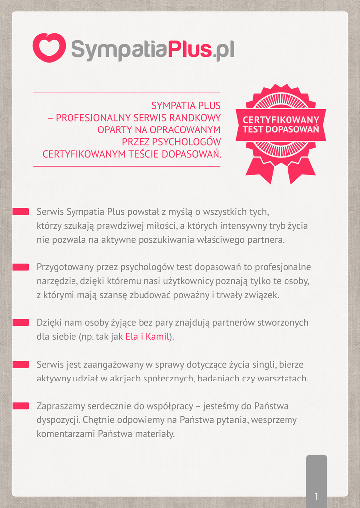 SYMPATIA PLUS – PROFESJONALNY SERWIS RANDKOWY OPARTY NA OPRACOWANYM PRZEZ PSYCHOLOGÓW CERTYFIKOWANYM TEŚCIE DOPASOWAŃ. Serwis Sympatia Plus powstał z myślą o wszystkich tych, którzy szukają prawdziwej miłości, a których intensywny tryb życia nie pozwala na aktywne poszukiwania właściwego partnera. Przygotowany przez psychologów test dopasowań to profesjonalne narzędzie, dzięki któremu nasi użytkownicy poznają tylko te osoby, z którymi mają szansę zbudować poważny i trwały związek. Dzięki nam osoby żyjące bez pary znajdują partnerów stworzonych dla siebie (np. tak jak Ela i Kamil). Serwis jest zaangażowany w sprawy dotyczące życia singli, bierze aktywny udział w akcjach społecznych, badaniach czy warsztatach. Zapraszamy serdecznie do współpracy – jesteśmy do Państwa dyspozycji. Chętnie odpowiemy na Państwa pytania, wesprzemy komentarzami Państwa materiały. 1 TEST DOPASOWANIA OSOBOWOŚCIOWEGO - INFORMACJE: Serwis Sympatia Plus oparty jest na profesjonalnym teście dopasowania osobowościowego. Przygotowany specjalnie na potrzeby naszego serwisu oraz dostosowany do polskiej specyfiki kulturowej - test sprawdza podobieństwo potencjalnych partnerów, analizując osiem wymiarów osobowości ważnych, zdaniem psychologów, dla zbudowania trwałego związku: emocjonalności potrzeby bliskości orientacji życiowej skrupulatności potrzeby nowych doświadczeń potrzeby kontaktów interpersonalnych, relacji z ludźmi stylu komunikacji Test pozwala sprawdzić dopasowanie również w zakresie innych, ważnych dla trwałości związku, aspektów: preferowanego systemu wartości, oczekiwań wobec partnera, zainteresowań oraz potrzeb seksualnych. 2 SYMPATIA PLUS – DLA KOGO JEST TEN SERWIS? Serwis Sympatia Plus adresowany jest do ludzi powyżej 35. roku życia. Nasi użytkownicy szukają stałego, poważnego związku, zaś nabyte życiowe doświadczenia są dla nich źródłem wiedzy na temat siebie i swoich potrzeb. Użytkownicy naszego serwisu, wypełniając certyfikowany test dopasowań, potrafią precyzyjnie przedstawić siebie i swoje oczekiwania względem partnera. 3 OPIEKUN MERYTORYCZNY SYMPATII PLUS - CENTRUM ROZWOJU HOLIS: Opiekunem merytorycznym serwisu jest Centrum Rozwoju Holis, grupa psychologów i coachów zajmujących się rozwojem osobistym. Centrum Holis wspiera świadomy rozwój umiejętności psychospołecznych i budowanie trwałych relacji interpersonalnych. 4