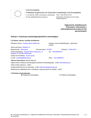 Unia Europejska Publikacja Suplementu do Dziennika Urzędowego Unii Europejskiej 2, rue Mercier, 2985 Luxembourg, Luksemburg Faks: +352 29 29 42 670 E-mail: [email protected] Informacje i formularze on-line: http:// simap.europa.eu Ogłoszenie dodatkowych informacji, informacje o niekompletnej procedurze lub sprostowanie Sekcja I: Instytucja zamawiająca/podmiot zamawiający I.1) Nazwa, adresy i punkty kontaktowe: Oficjalna nazwa: Krajowe Biuro Wyborcze Krajowy numer identyfikacyjny: (jeżeli jest znany) _____ Adres pocztowy: Wiejska 10 Miejscowość: Warszawa Kod pocztowy: 00-902 Punkt kontaktowy: Krajowe Biuro Wyborcze, ul. Wiejska 10, 00-902 Warszawa Państwo: Polska (PL) Tel.: +48 226952417 Osoba do kontaktów: Aneta Łęcka E-mail: [email protected] Faks: +48 226952417 Adresy internetowe: (jeżeli dotyczy) Ogólny adres instytucji zamawiającej/ podmiotu zamawiającego: (URL) http://pkw.gov.pl Adres profilu nabywcy: (URL) _____ Dostęp elektroniczny do informacji: (URL) http://przetargi.kbw.gov.pl Elektroniczne składanie ofert i wniosków o dopuszczenie do udziału: (URL) _____ I.2) Rodzaj zamawiającego: Instytucja zamawiająca Podmiot zamawiający PL Formularz standardowy 14 - Ogłoszenie dodatkowych informacji, informacje o niekompletnej procedurze lub sprostowanie 1/5 Sekcja II: Przedmiot zamówienia II.1.1) Nazwa nadana zamówieniu: Dostawa oprogramowania/licencji zintegrowanego systemu finansowo-księgowego i kadrowego na potrzeby Krajowego Biura Wyborczego wraz z wdrożeniem II.1.2) Krótki opis zamówienia lub zakupu: (podano w pierwotnym ogłoszeniu) Przedmiotem zamówienia jest dostawa oprogramowania/licencji zintegrowanego systemu finansowoksięgowego i kadrowego na potrzeby Krajowego Biura Wyborczego, zwanego dalej również „Systemem”, wraz z wdrożeniem, szkoleniem użytkowników i administratorów Systemu oraz świadczeniem usług asysty w pierwszym okresie eksploatacji, serwisu eksploatacyjnego oraz wykonywanie prac rozwojowych. Szczegółowy opis przedmiotu zamówienia został zawarty w szczególności w załączniku numer 1 do SIWZ – szczegółowy opis przedmiotu zamówienia. II.1.3) Wspólny Słownik Zamówień (CPV) Główny przedmiot Dodatkowe przedmioty Słownik główny 48440000 48443000 48450000 72000000 72260000 80533100 Słownik uzupełniający (jeżeli dotyczy) PL Formularz standardowy 14 - Ogłoszenie dodatkowych informacji, informacje o niekompletnej procedurze lub sprostowanie 2/5 Sekcja IV: Procedura IV.1)Rodzaj procedury (podano w pierwotnym ogłoszeniu) Otwarta Ograniczona Ograniczona przyspieszona Negocjacyjna Negocjacyjna przyspieszona Dialog konkurencyjny Negocjacyjna z uprzednim ogłoszeniem Negocjacyjna bez uprzedniego ogłoszenia Negocjacyjna z publikacją ogłoszenia o zamówieniu Negocjacyjna bez publikacji ogłoszenia o zamówieniu Udzielenie zamówienia bez uprzedniej publikacji ogłoszenia o zamówieniu w Dzienniku Urzędowym Unii Europejskiej IV.2)Informacje administracyjne IV.2.1)Numer referencyjny: (podano w pierwotnym ogłoszeniu) KBW-PZP/PN/11/2016 IV.2.2)Dane referencyjne ogłoszenia w przypadku ogłoszeń przesłanych drogą elektroniczną: Pierwotne ogłoszenie przesłane przez eNotices TED eSender Login: ENOTICES_KrajoweBiuroWyborcze Dane referencyjne ogłoszenia: 2016-094843 rok i numer dokumentu IV.2.3)Ogłoszenie, którego dotyczy niniejsza publikacja: Numer ogłoszenia w Dz.U.: 2016/S 143-259231 z dnia: 27/07/2016 (dd/mm/rrrr) IV.2.4)Data wysłania pierwotnego ogłoszenia: 22/07/2016 (dd/mm/rrrr) PL Formularz standardowy 14 - Ogłoszenie dodatkowych informacji, informacje o niekompletnej procedurze lub sprostowanie 3/5 Sekcja VI: Informacje uzupełniające VI.1) Ogłoszenie dotyczy: Procedury niepełnej Sprostowania Informacji dodatkowych VI.2) Informacje na temat niepełnej procedury udzielenia zamówienia: Postępowanie o udzielenie zamówienia zostało przerwane Postępowanie o udzielenie zamówienia uznano za nieskuteczne Zamówienia nie udzielono Zamówienie może być przedmiotem ponownej publikacji VI.3) Informacje do poprawienia lub dodania : VI.3.1) Zmiana oryginalnej informacji podanej przez instytucję zamawiającą Publikacja w witrynie TED niezgodna z oryginalną informacją, przekazaną przez instytucję zamawiającą Oba przypadki VI.3.2) W ogłoszeniu pierwotnym W odpowiedniej dokumentacji przetargowej (więcej informacji w odpowiedniej dokumentacji przetargowej) W obu przypadkach (więcej informacji w odpowiedniej dokumentacji przetargowej) VI.3.3) Tekst, który należy poprawić w pierwotnym ogłoszeniu Miejsce, w którym znajduje się Zamiast: zmieniany tekst: Powinno być: VI.3.4) Daty, które należy poprawić w pierwotnym ogłoszeniu Miejsce, w którym znajdują się Zamiast: zmieniane daty: 15/10/2016 II.3) Czas trwania zamówienia lub (dd/mm/rrrr) termin realizacji Rozpoczęcie: Powinno być: 01/03/2017 (dd/mm/rrrr) Miejsce, w którym znajdują się zmieniane daty: II.3) Czas trwania zamówienia lub termin realizacji Zakończenie Zamiast: 15/04/2020 (dd/mm/rrrr) Powinno być: 17/03/2020 (dd/mm/rrrr) Miejsce, w którym znajdują się Zamiast: zmieniane daty: 17/10/2016 Godzina: 12:00 IV.3.4) Termin składania ofert lub (dd/mm/rrrr) wniosków o dopuszczenie do udziału w postępowaniu Powinno być: 07/11/2016 Godzina: 12:00 (dd/mm/rrrr) Miejsce, w którym znajdują się zmieniane daty: IV.3.8) Warunki otwarcia ofert Powinno być: 07/11/2016 Godzina: 12:30 (dd/mm/rrrr) Zamiast: 17/10/2016 Godzina: 12:30 (dd/mm/rrrr) VI.3.5) Adresy i punkty kontaktowe, które należy poprawić VI.3.6) Tekst, który należy dodać do pierwotnego ogłoszenia PL Formularz standardowy 14 - Ogłoszenie dodatkowych informacji, informacje o niekompletnej procedurze lub sprostowanie 4/5 Miejsce, w którym należy dodać tekst: Tekst do dodania: VI.4) Inne dodatkowe informacje: _____ VI.5) Data wysłania niniejszego ogłoszenia: 21/09/2016 (dd/mm/rrrr) - ID:2016-121327 PL Formularz standardowy 14 - Ogłoszenie dodatkowych inf