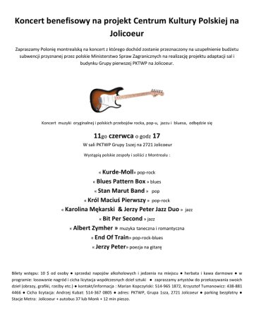 KoncertbenefisowynaprojektCentrumKulturyPolskiejna Jolicoeur ZapraszamyPolonięmontrealskąnakoncertzktóregodochódzostanieprzeznaczonynauzupełnieniebudżetu subwencjiprzyznanejprzezpolskieMinisterstwoSprawZagranicznychnarealizacjęprojektuadaptacjisali budynkuGrupypierwszejPKTWPnaJolicoeur. Koncertmuzykioryginalnejipolskichprzebojówrocka,pop-u,jazzuibluesa,odbędziesię 11goczerwcaogodz17 WsaliPKTWPGrupy1szejna2721Jolicoeur WystąpiąpolskiezespołyisoliścizMontrealu: «Kurde-Moll»pop-rock «BluesPatternBox»blues «StanMarutBand»pop «KrólMaciuśPierwszy»pop-rock «KarolinaMękarski&JerzyPeterJazzDuo»jazz «BitPerSecond»jazz «AlbertZymher»muzykatanecznairomantyczna «EndOfTrain»pop-rock-blues «JerzyPeter»poezjanagitarę Bilety wstępu: 10 $ od osoby ● sprzedaż napojów alkoholowych i jedzenia na miejscu ● herbata i kawa darmowe ● w programie:losowanienagródicichalicytacjawspółczesnychdziełsztuki●zapraszamyartystówdoprzekazywaniaswoich dzieł(obrazy,grafiki,rzeźbyetc.)●kontakt/informacja:MarianKopczyński:514-9651872,KrzysztofTumanowicz:438-881 4466 ● Cicha licytacja: Andrzej Kubat: 514-367 0805 ● adres: PKTWP, Grupa 1sza, 2721 Jolicoeur ● parking bezpłatny ● StacjeMetra:Jolicoeur+autobus37lubMonk+12minpieszo.
