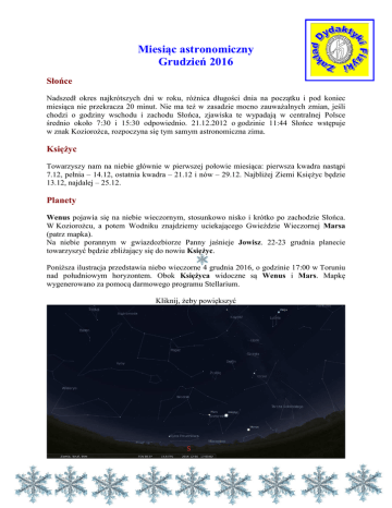 Miesiąc astronomiczny Grudzień 2016 Słońce Nadszedł okres najkrótszych dni w roku, różnica długości dnia na początku i pod koniec miesiąca nie przekracza 20 minut. Nie ma też w zasadzie mocno zauważalnych zmian, jeśli chodzi o godziny wschodu i zachodu Słońca, zjawiska te wypadają w centralnej Polsce średnio około 7:30 i 15:30 odpowiednio. 21.12.2012 o godzinie 11:44 Słońce wstępuje w znak Koziorożca, rozpoczyna się tym samym astronomiczna zima. Księżyc Towarzyszy nam na niebie głównie w pierwszej połowie miesiąca: pierwsza kwadra nastąpi 7.12, pełnia – 14.12, ostatnia kwadra – 21.12 i nów – 29.12. Najbliżej Ziemi Księżyc będzie 13.12, najdalej – 25.12. Planety Wenus pojawia się na niebie wieczornym, stosunkowo nisko i krótko po zachodzie Słońca. W Koziorożcu, a potem Wodniku znajdziemy uciekającego Gwieździe Wieczornej Marsa (patrz mapka). Na niebie porannym w gwiazdozbiorze Panny jaśnieje Jowisz. 22-23 grudnia planecie towarzyszyć będzie zbliżający się do nowiu Księżyc. Poniższa ilustracja przedstawia niebo wieczorne 4 grudnia 2016, o godzinie 17:00 w Toruniu nad południowym horyzontem. Obok Księżyca widoczne są Wenus i Mars. Mapkę wygenerowano za pomocą darmowego programu Stellarium. Kliknij, żeby powiększyć