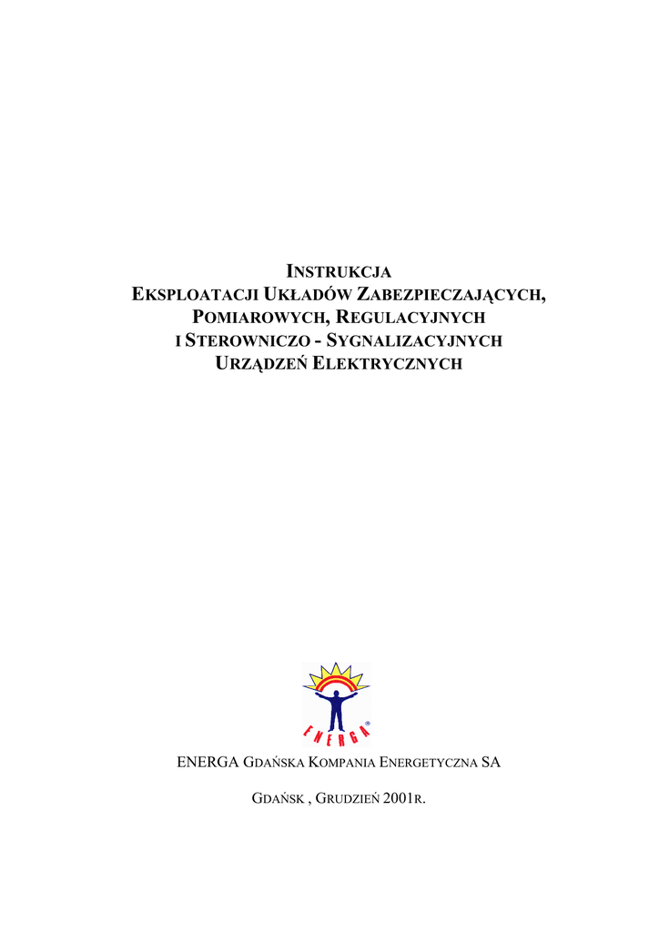 INSTRUKCJA EKSPLOATACJI UKŁADÓW ZABEZPIECZAJĄCYCH, POMIAROWYCH, REGULACYJNYCH I STEROWNICZO - SYGNALIZACYJNYCH URZĄDZEŃ ELEKTRYCZNYCH ENERGA GDAŃSKA KOMPANIA ENERGETYCZNA SA GDAŃSK , GRUDZIEŃ 2001R. Instrukcja eksploatacji układów zabezpieczających, pomiarowych, ... Podpisem stwierdzam, że zapoznałem się z niniejszą instrukcją i zobowiązuję się do jej przestrzegania: Data Lp. potwierdzenia Imię i nazwisko zapoznanego z instrukcją Stanowisko zapoznanego z instrukcją 1 2 3 4 5 6 7 8 9 10 11 12 13 14 15 16 17 18 19 20 21 22 23 2 Podpis zapoznanego z instrukcją Instrukcja eksploatacji układów zabezpieczających, pomiarowych, ... 24 25 26 27 28 29 30 31 32 33 34 35 36 37 38 39 40 41 42 43 44 45 46 47 48 3 Instrukcja eksploatacji układów zabezpieczających, pomiarowych, ... Spis treści 1. 2. 3. 4. 5. 6. 7. Wstęp ............................................................................................................... 1.1. Przedmiot instrukcji ................................................................................. 1.2. Zakres stosowania .................................................................................... 1.3. Przeznaczenie instrukcji ........................................................................... 1.4. Definicje .................................................................................................. 1.5. Dokumenty związane ............................................................................... Kwalifikacje personelu ...................................................................................... Dokumentacja eksploatacyjna ............................................................................ 3.1. Rodzaje dokumentacji .............................................................................. 3.2. Miejsce przechowywania dokumentacji .................................................... 3.3. Aktualizacja dokumentacji ........................................................................ Czynności obsługi i warunki pracy układów EAZ .............................................. 4.1. Gotowość ruchowa .................................................................................. 4.2. Programowanie pracy układów EAZ i nastawy ......................................... 4.3. Prace eksploatacyjne w układach EAZ ..................................................... 4.4. Czynności personelu ruchowego .............................................................. 4.4.1. Okresowe oględziny ..................................................................... 4.4.2. Zapisy ruchowe ............................................................................ 4.4.3. Nośniki pamięci urządzeń rejestrujących ....................................... 4.4.4. Ochrona nastaw zabezpieczeń ....................................................... 4.5. Warunki środowiskowe ............................................................................ 4.5.1. Temperatura otoczenia ................................................................. 4.5.2. Zanieczyszczenia .......................................................................... 4.5.3. Narażenia mechaniczne ................................................................. 4.6. Rezerwa aparatury ................................................................................... Rodzaje, zakresy i terminy przeglądów układów EAZ ....................................... 5.1. Rodzaje przeglądów ................................................................................. 5.2. Zakresy przeglądów okresowych .............................................................. 5.2.1. Przegląd podstawowe (P) ............................................................. 5.2.2. Przegląd skrócony (S) ................................................................... 5.3. Terminy wykonywania przeglądów okresowych ....................................... 5.4. Przegląd dodatkowy ................................................................................. 5.5. Przegląd bez wyłączeń i uziemień ............................................................. Przeglądy i konserwacja .................................................................................... 6.1. Przebieg przeglądu ................................................................................... 6.2. Warunki przeprowadzania przeglądu ........................................................ 6.3. Instrukcje stanowiskowe wykonywania przeglądów ................................. 6.4. Zasadnicze wymagania dla układów probierczych ..................................... 6.5. Zakończenie przeglądu ............................................................................. Program badań podczas przeglądu .................................................................... 7.1. Obwody pomocnicze ................................................................................ 7.1.1. Oględziny ..................................................................................... 7.1.2. Obwody prądowe ......................................................................... 7.1.3. Obwody napięciowe ..................................................................... 7.1.4. Obwody sterownicze i sygnalizacyjne ............................................ 7.2. Źródła napięcia pomocniczego ................................................................. 7.2.1. Bateria akumulatorowa wraz z siecią prądu stałego oraz instalacją zasilającą ...................................................................................... 4 8 8 8 8 9 11 12 13 13 13 14 14 14 14 15 15 15 15 16 16 16 16 16 16 16 16 16 17 17 17 18 18 18 18 18 18 19 19 19 20 20 20 20 20 21 21 21 Instrukcja eksploatacji układów zabezpieczających, pomiarowych, ... 8. 9. 7.2.2. Inne źródła napięcia pomocniczego ............................................... 7.3. Przekaźniki ..............
